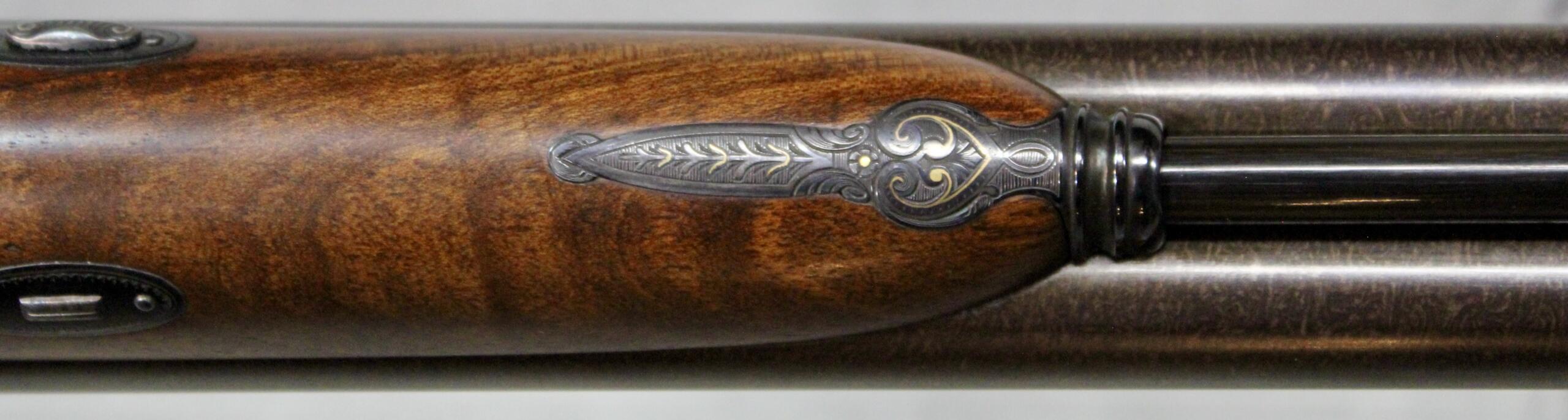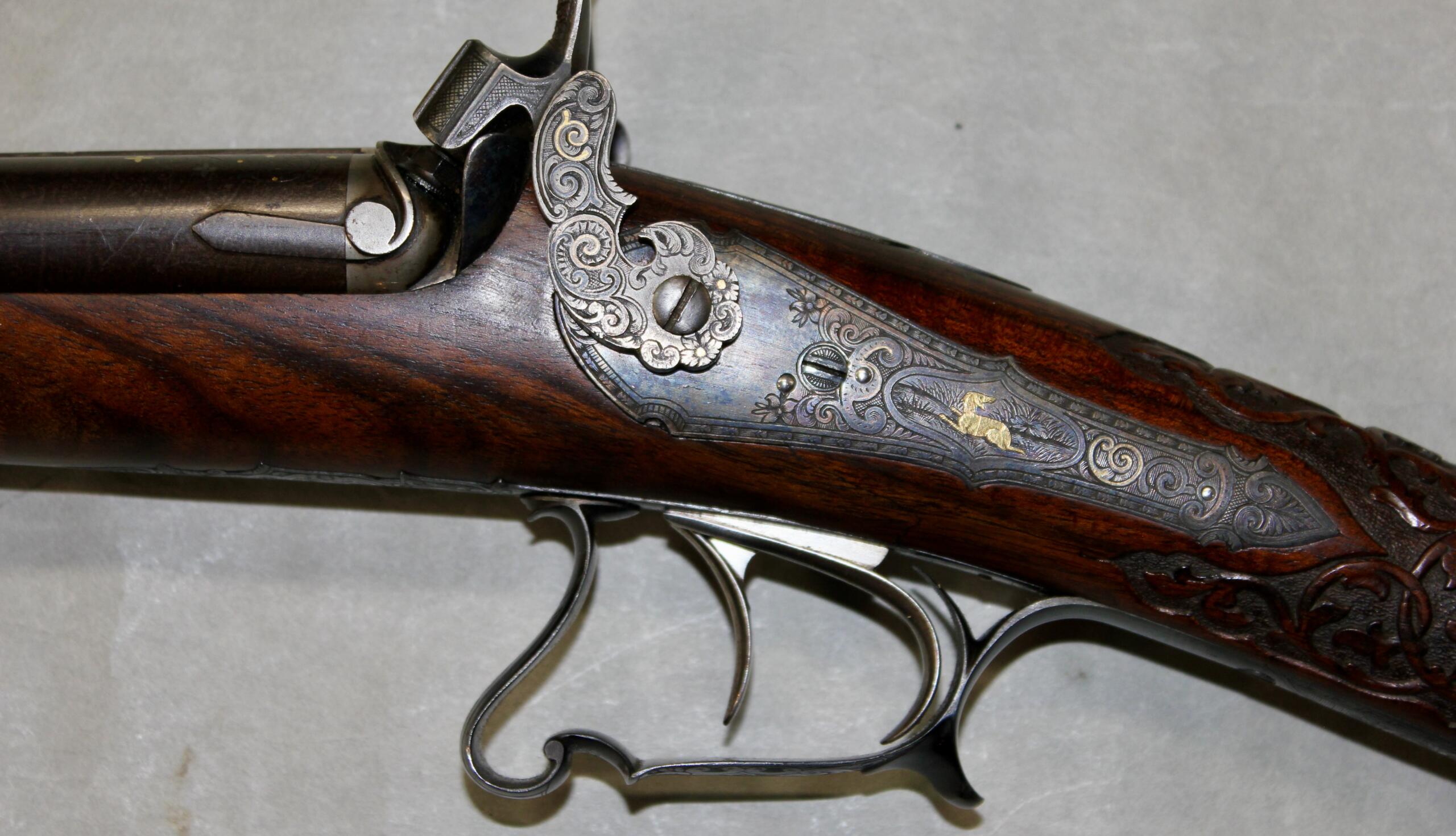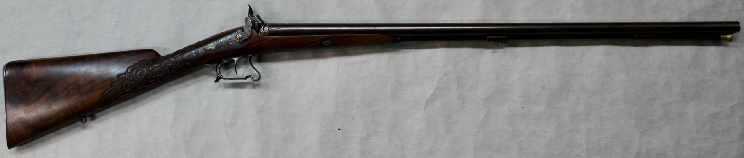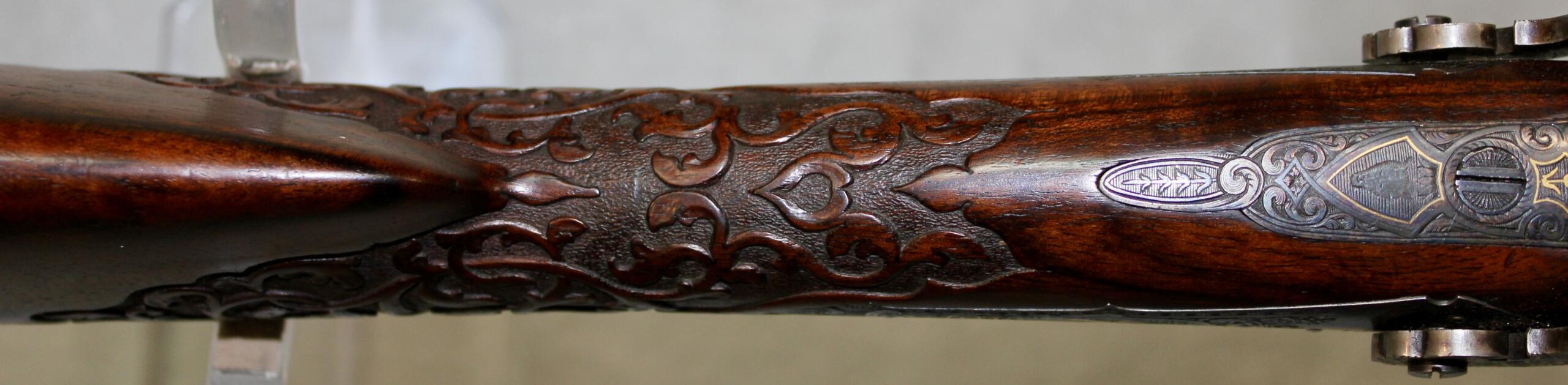 This is a museum quality high end 16ga. percussion shotgun with 29″ barrels. This was crafted probably between the 1840’s and 1870’s for a very wealthy individual. The shotgun appears to be possibly unfired. The Locks,Triggers, Bores,Stock, Finish are magnificent. Beautiful wood carving, metal engraving with Gold inlays all show true old world craftsmanship. Very high art.