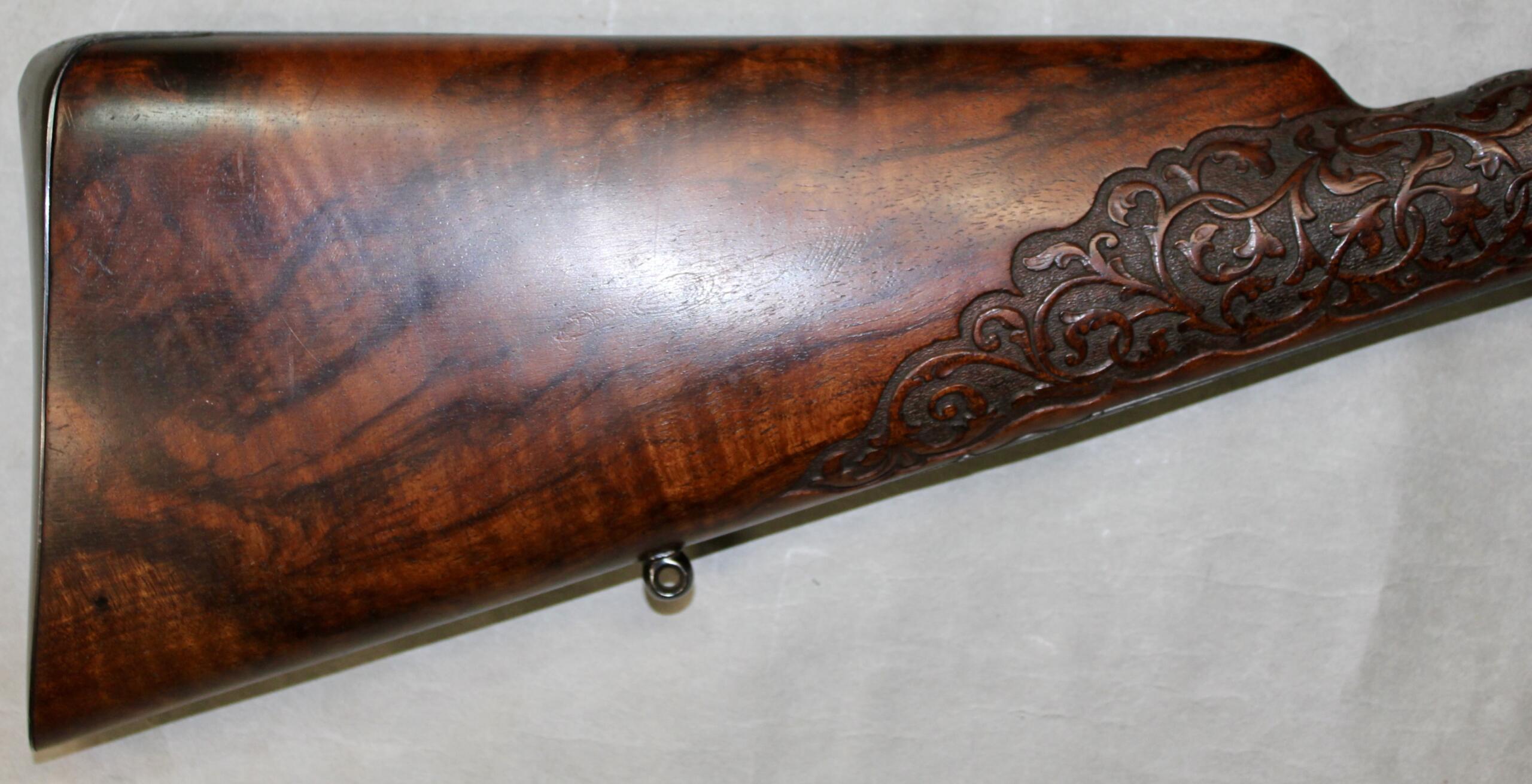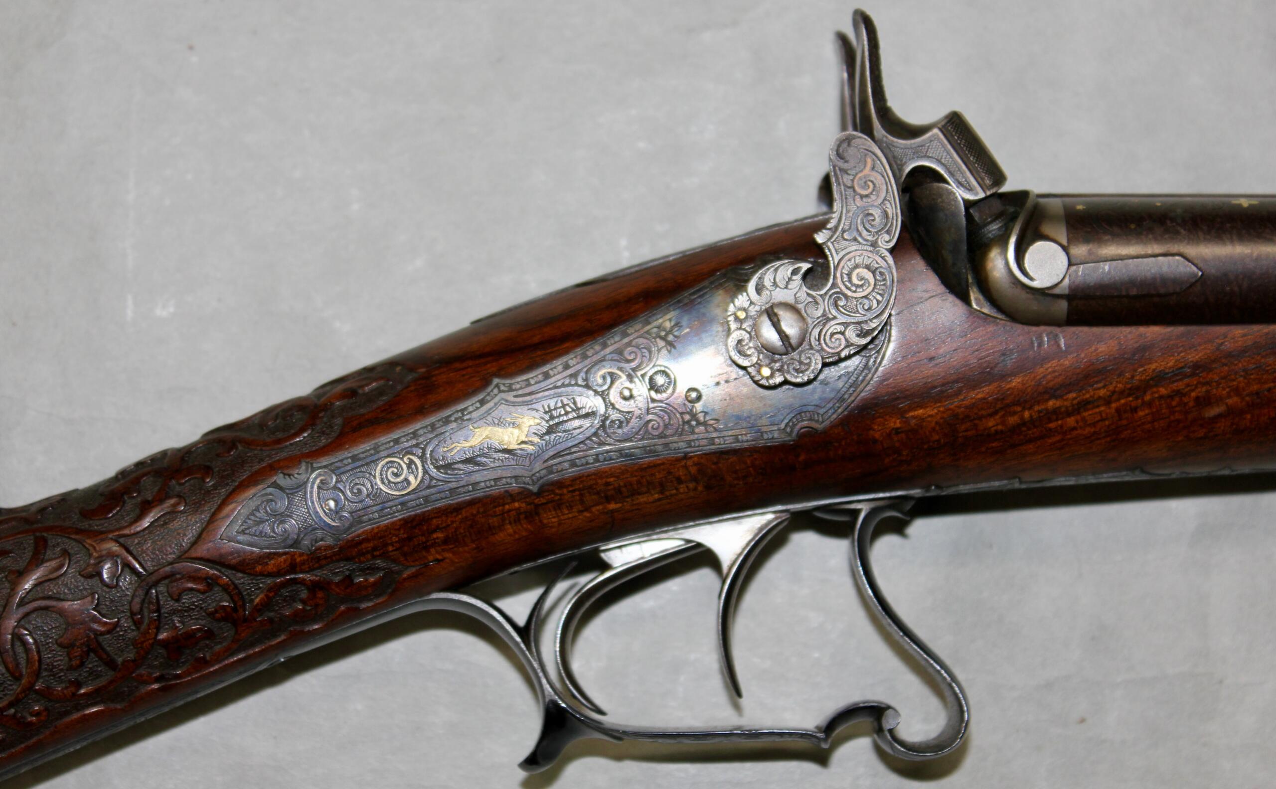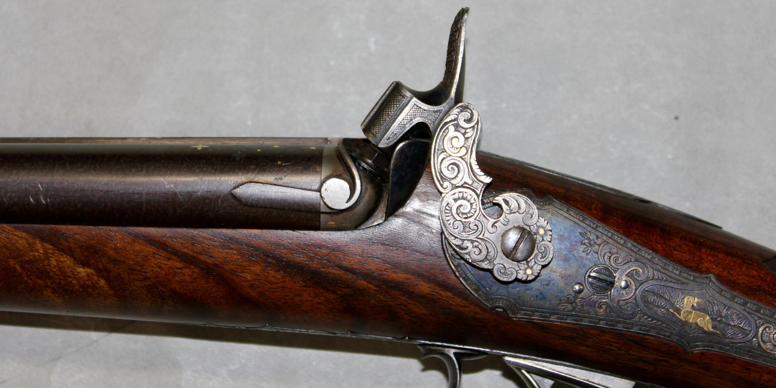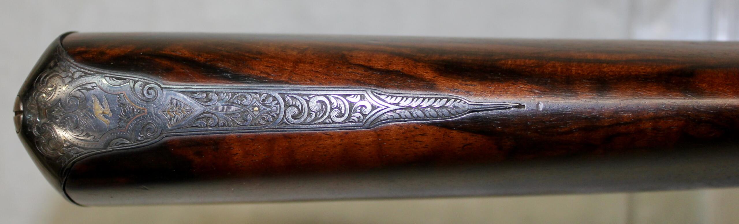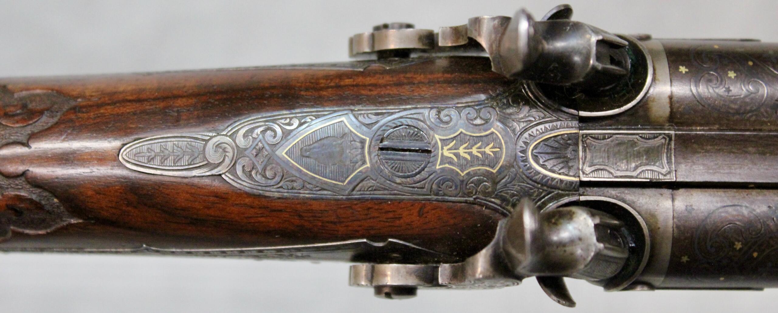 This is a museum quality high end 16ga. percussion shotgun with 29″ barrels. This was crafted probably between the 1840’s and 1870’s for a very wealthy individual. The shotgun appears to be possibly unfired. The Locks,Triggers, Bores,Stock, Finish are magnificent. Beautiful wood carving, metal engraving with Gold inlays all show true old world craftsmanship. Very high art.