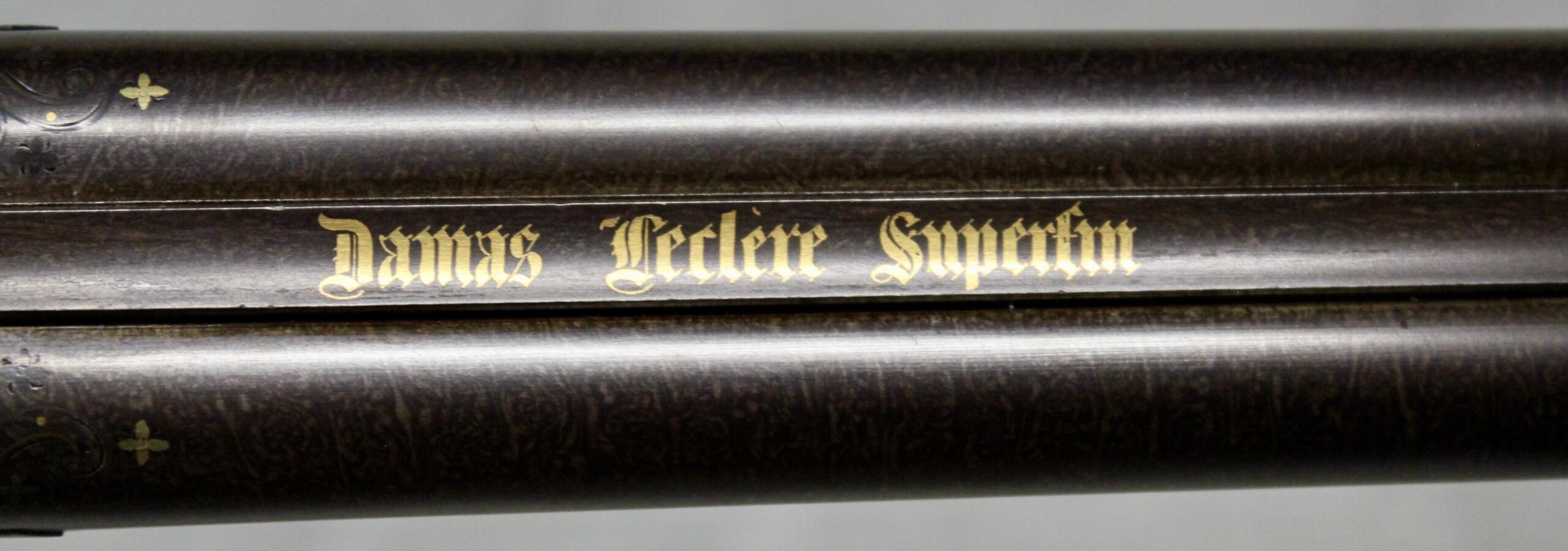 A.J. Leclere held a patent on making Damascus Barrels. The writing on the top of the barrel in gold is German lettering but French wording. In English we would probably say Leclere Superfine Damascus.
