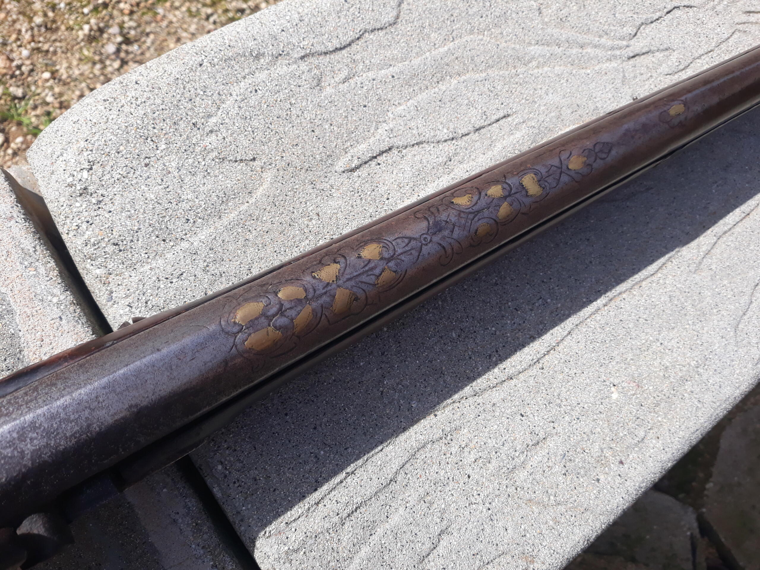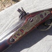 The 46″ two stage .68 caliber smooth bore barrel with brass fore-sight and sighting rib. Breech section with brass inlaid scroll engraved panel. Flat, banana shaped lock with bolster conversion utilizing the original cock with a curved extension secured in the jaws. Brass furniture compromises four brass ramrod thimbles, trigger guard with acanthus finial, side plate pierced and engraved with scrollwork, and the buttplate with slight (worn) engraving. Cherry wood stock. The club butt with relief band along belly from wrist to butt; the front 18″ of fore end replaced by a wooden rib. Lock is functional but barely. Definitely not for shooting (as NO antique musket should be)