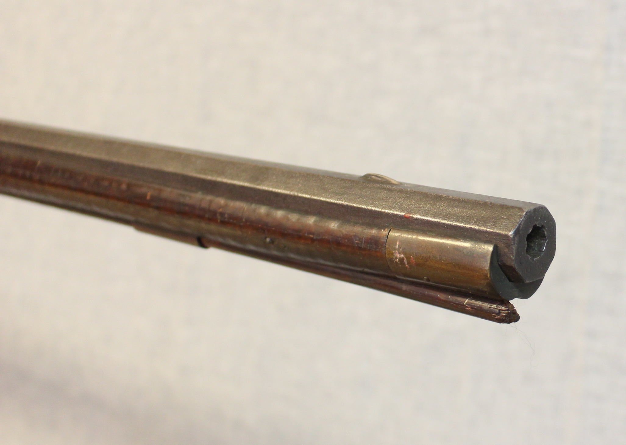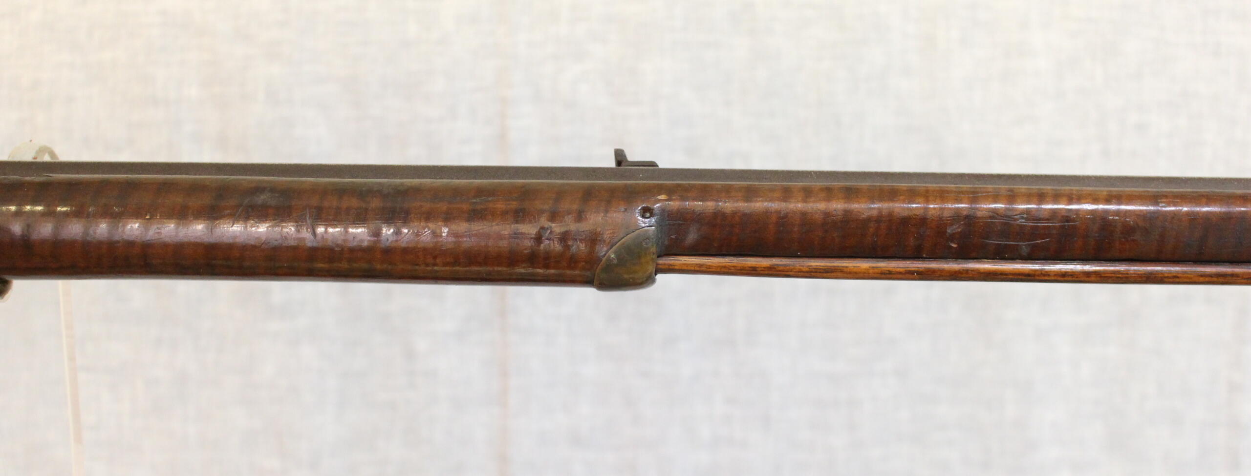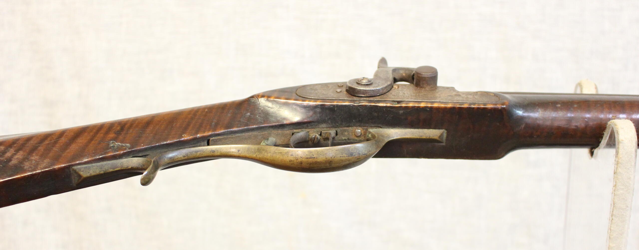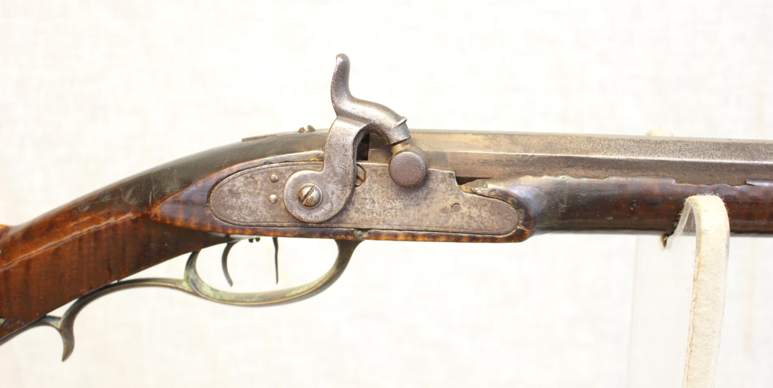 This example has a wonderful old surface and in untouched condition. The 43″ rifled barrel is about .38 cal and was never rebreeched. Of interst is the unusual attachment of the lock; there are no through lock bolts only a bolt threaded into the barrel tang from the lock. This may be an Indiana detail. Also of interest is the tobacco tag pinned to the butt stock which is usually seen on eastern Tennessee rifles. Minor losses to edge of fore stock is the only apology to the condition.