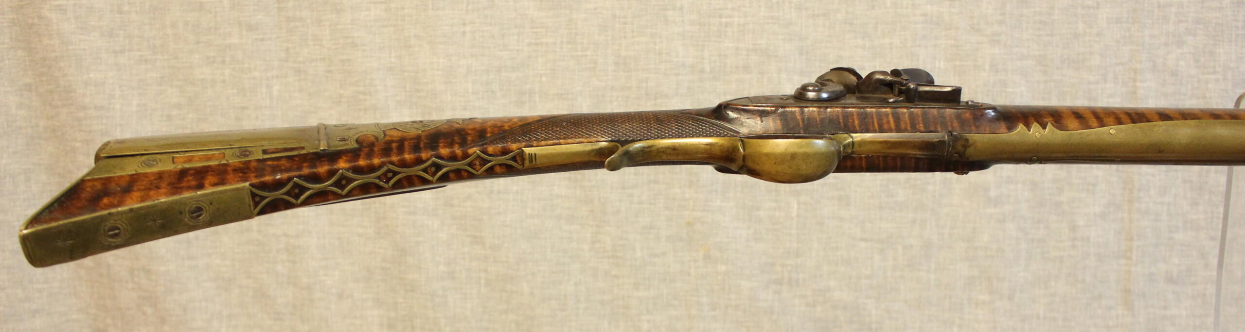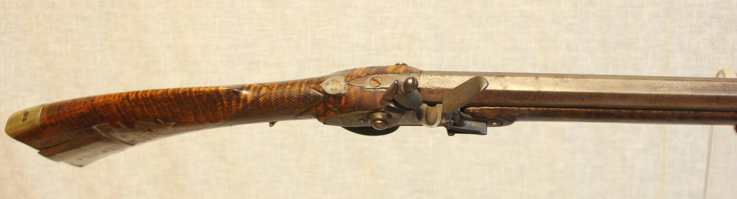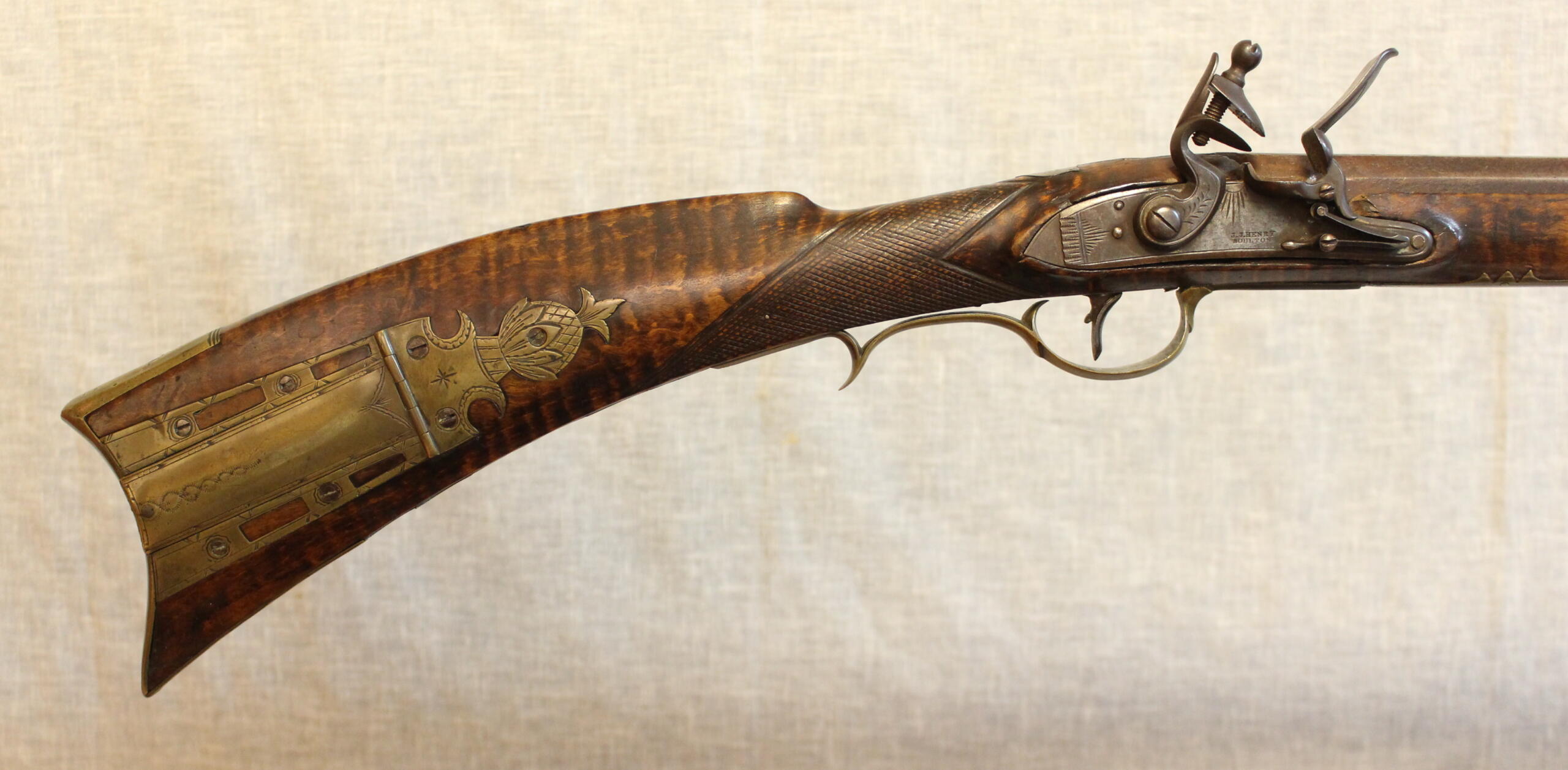 Henry Deringer Sr. worked in Easton, PA and then moved to Philadelphia and worked as a civilian gunsmith as well as fulfilling government conracts for military guns. This example has a bit more ornamentation than his usual rifles. The 43.5″ smoothbore barrel is about .54 cal and is stamped “H. Deringer Philada”. The lock is marked “JJ Henry Boulton” but is a replacement. The lockplate has been altered to more closely fit the mortise. A very nice pattern of brass inlay work appears in front of the toe plate.