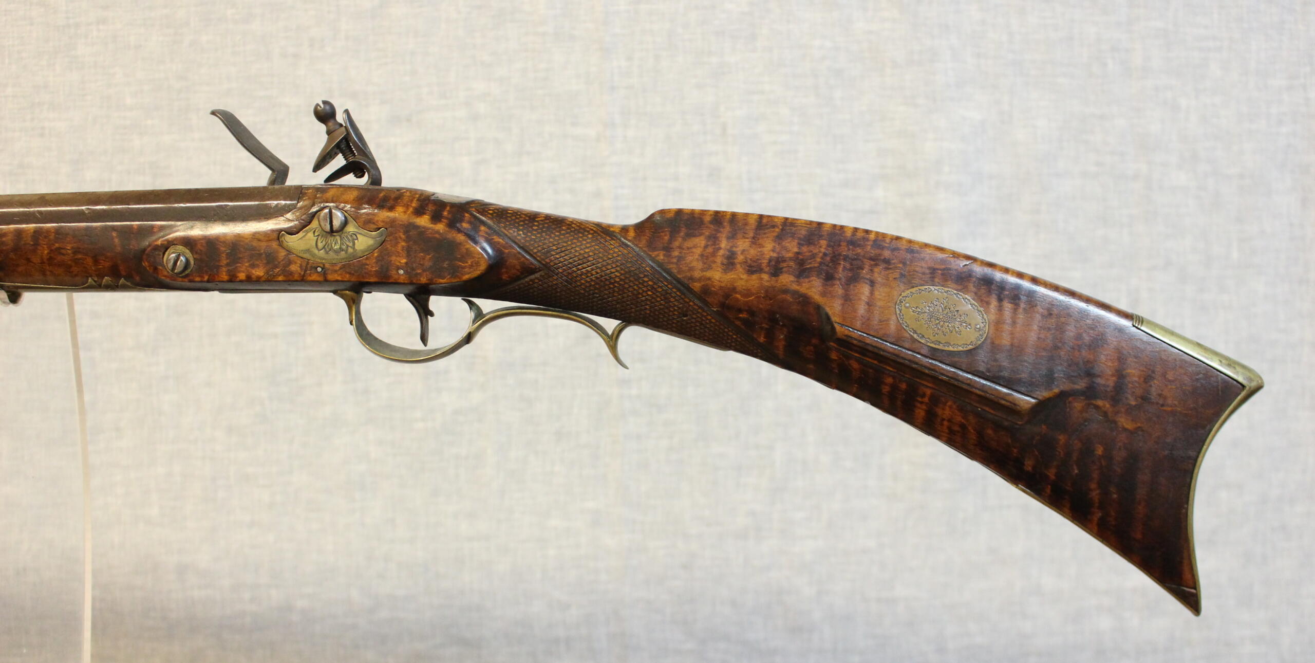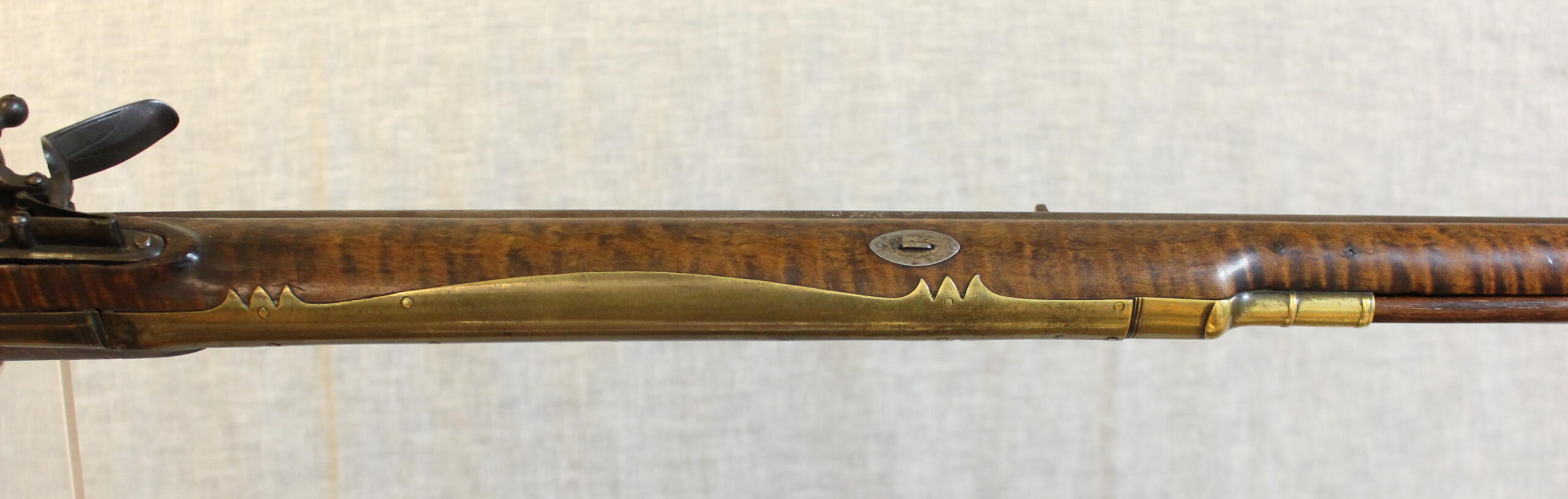There is a minor wood replacement at the toe. The lock bolt plate is a replacement but is nicely engraved in an appropriate pattern. Other than the replacements the rifle has wonderful surface quality, finish, and above average curly maple.