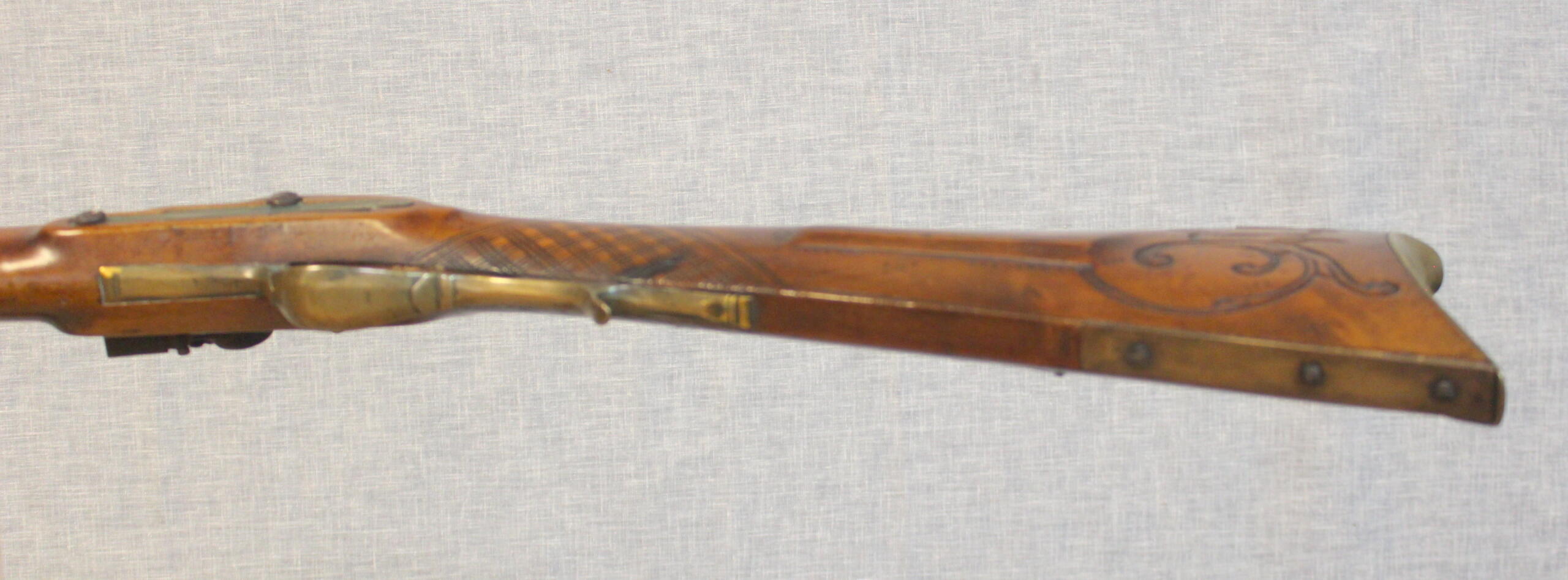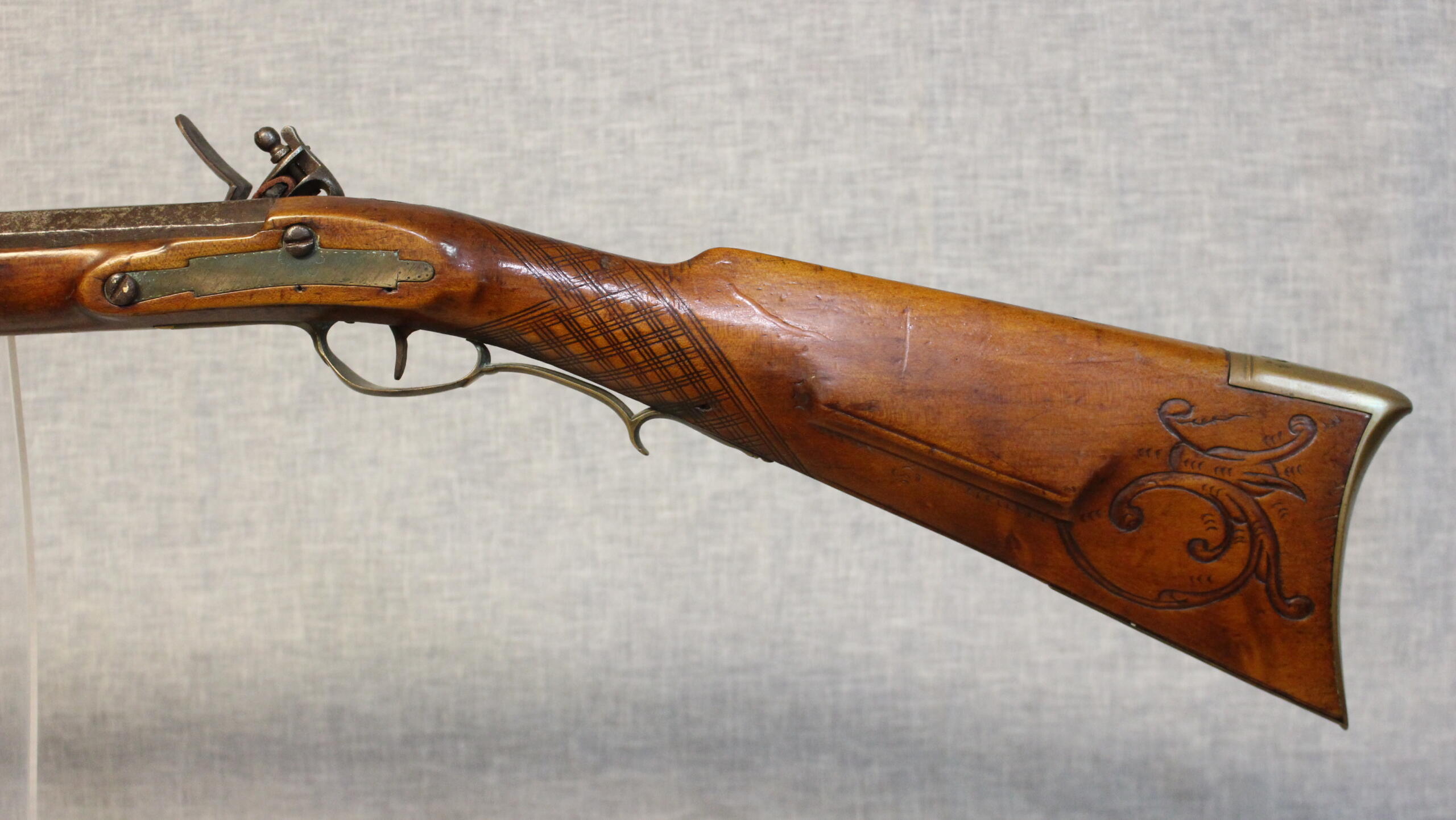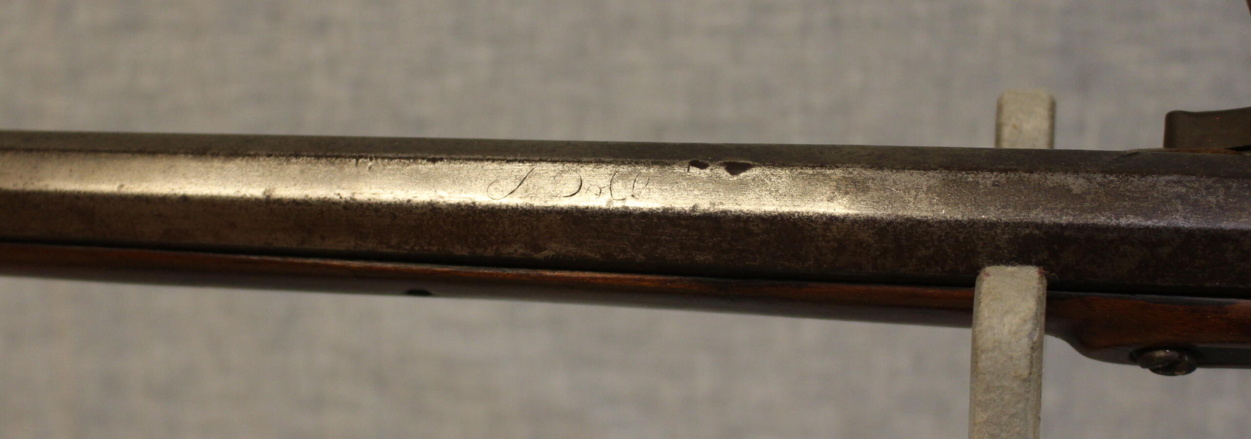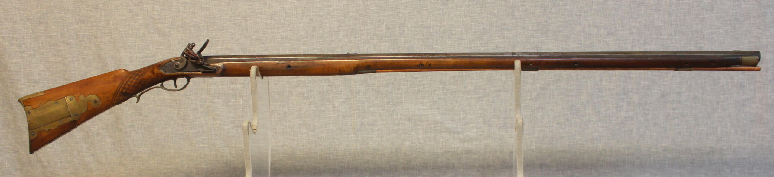 Jacob Doll worked in York, Pennsylvania and worked as a civilian gunsmith as well as fulfilling government conracts for military guns. This example has typical York carving and engraved patchbox. The 42.5″ smoothbore barrel is about .58 cal and is signed in script “J Doll”. The lock is a reconversion and is original to the rifle. The plain maple stock has checkering at the wrist.