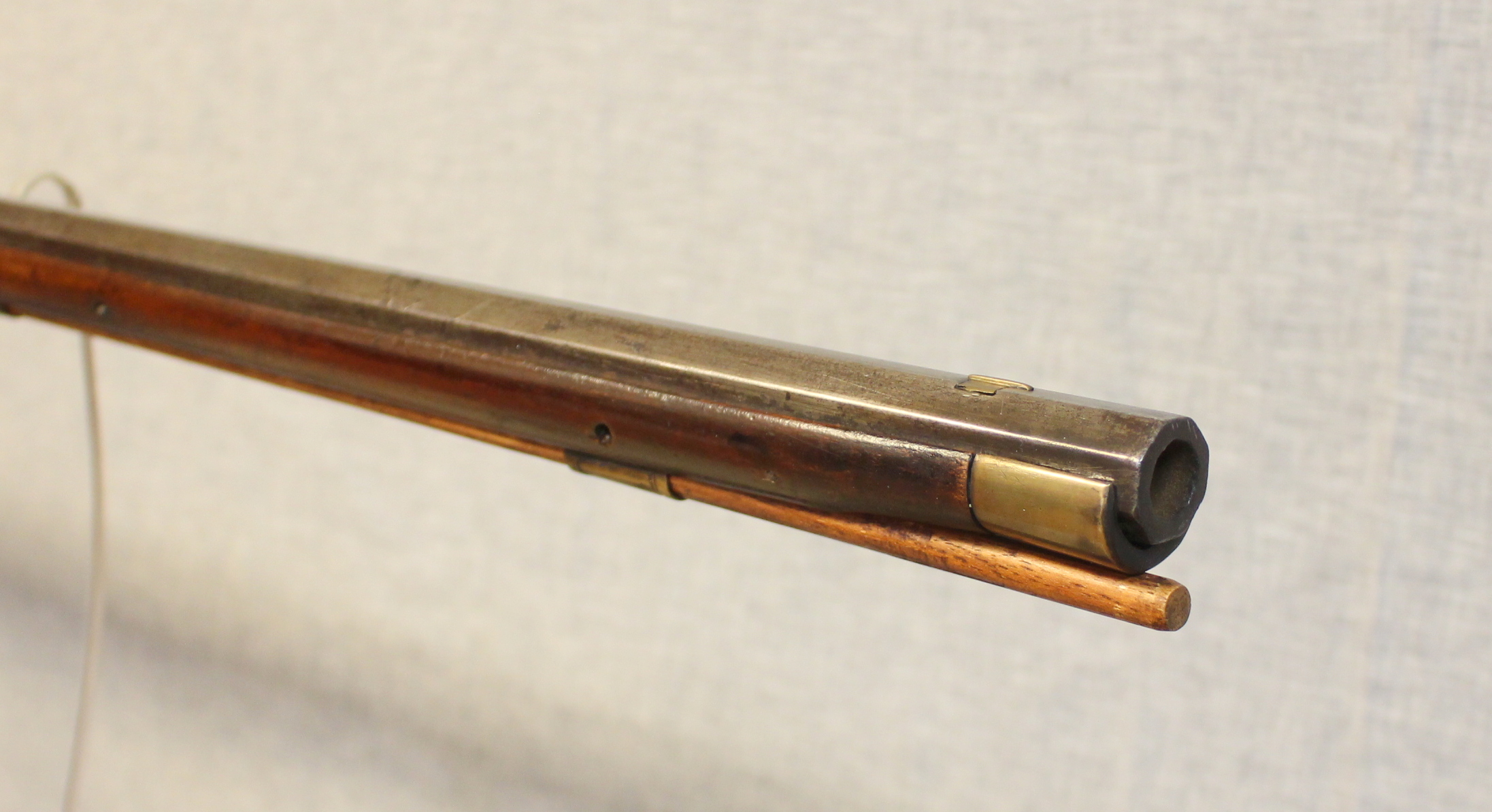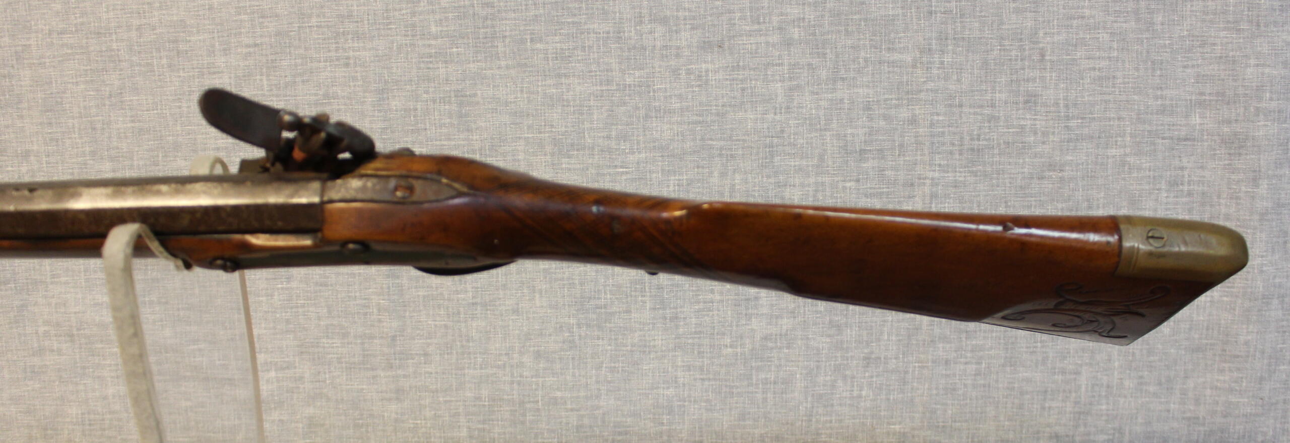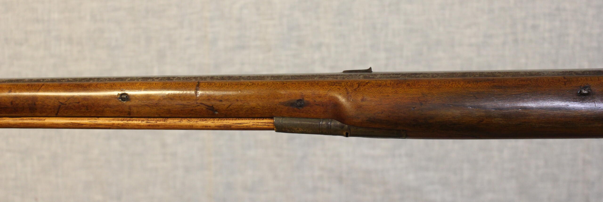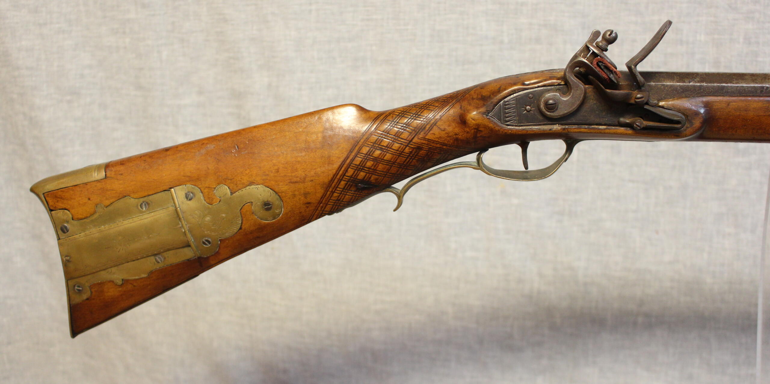 Jacob Doll worked in York, Pennsylvania and worked as a civilian gunsmith as well as fulfilling government conracts for military guns. This example has typical York carving and engraved patchbox. The 42.5″ smoothbore barrel is about .58 cal and is signed in script “J Doll”. The lock is a reconversion and is original to the rifle. The plain maple stock has checkering at the wrist.