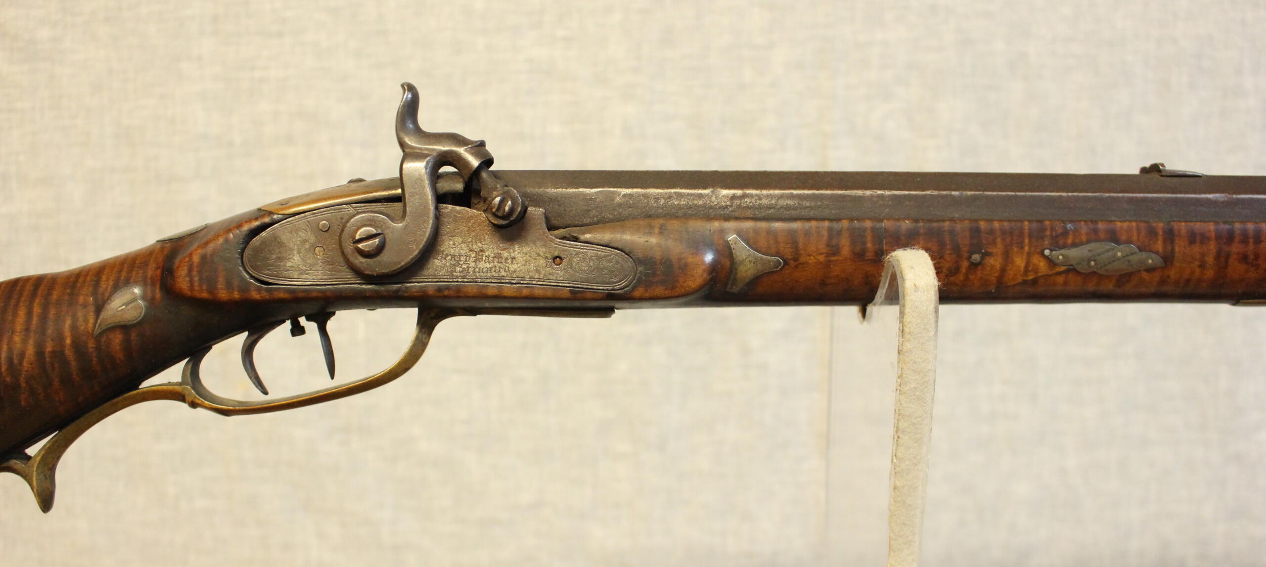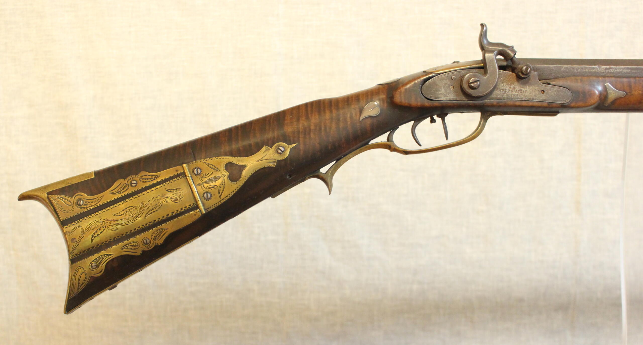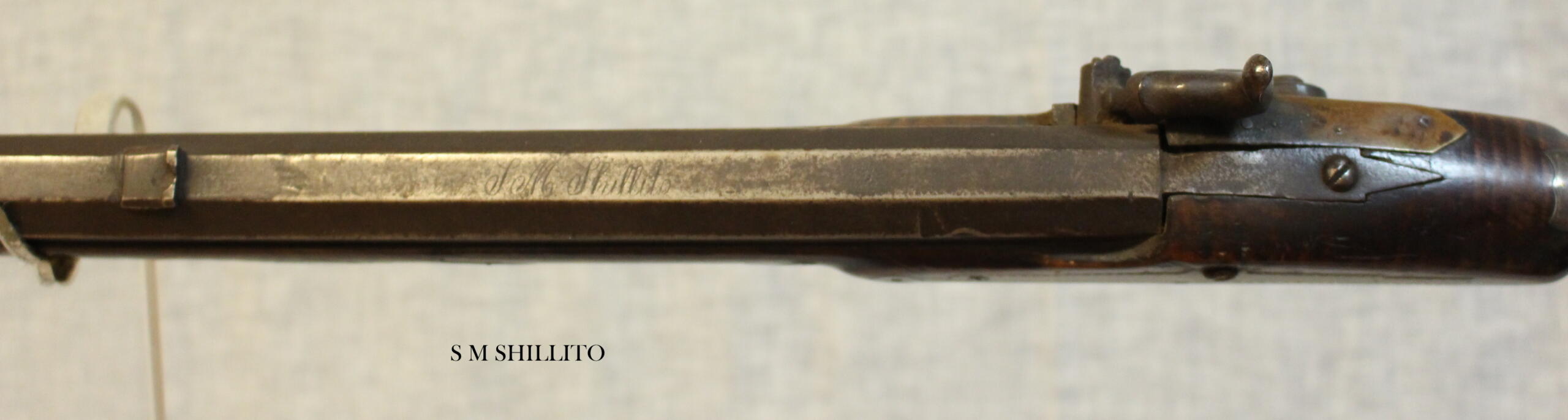 Sam Shillito was born in Franklin County in 1793 and died there in 1852. He made highly decorated rifles as well as plain rifles. This example is above average in decoration. Shillito Sr. was an excellent engraver; his craft is seen on the patchbox, toeplate and inlays. The forestock inlays are decorative and do not act as escucheons.