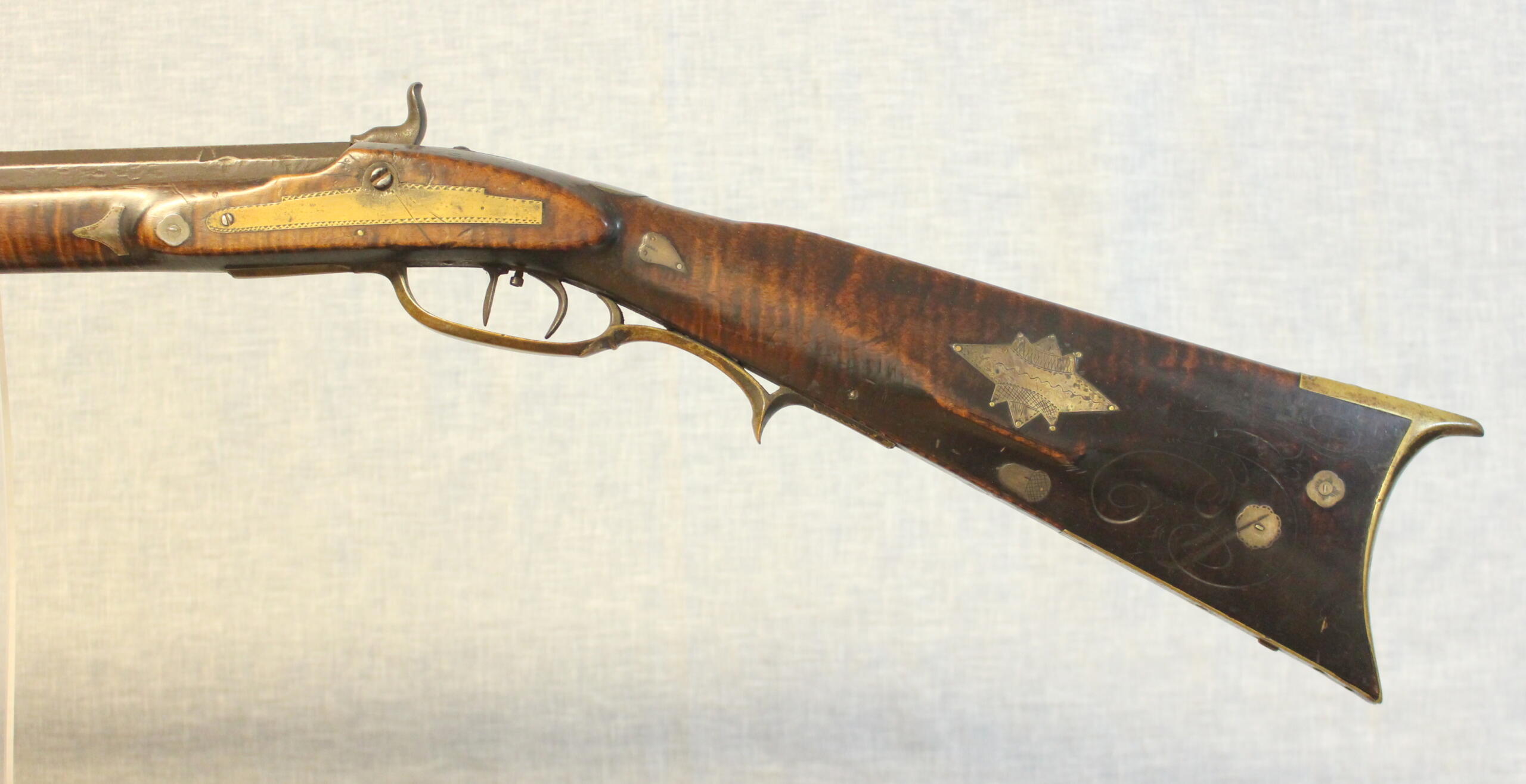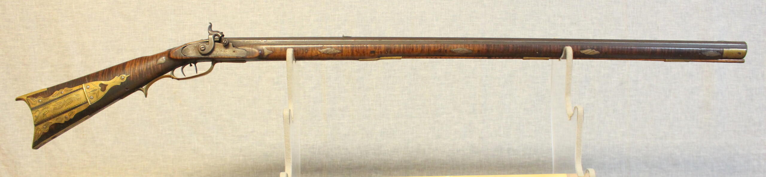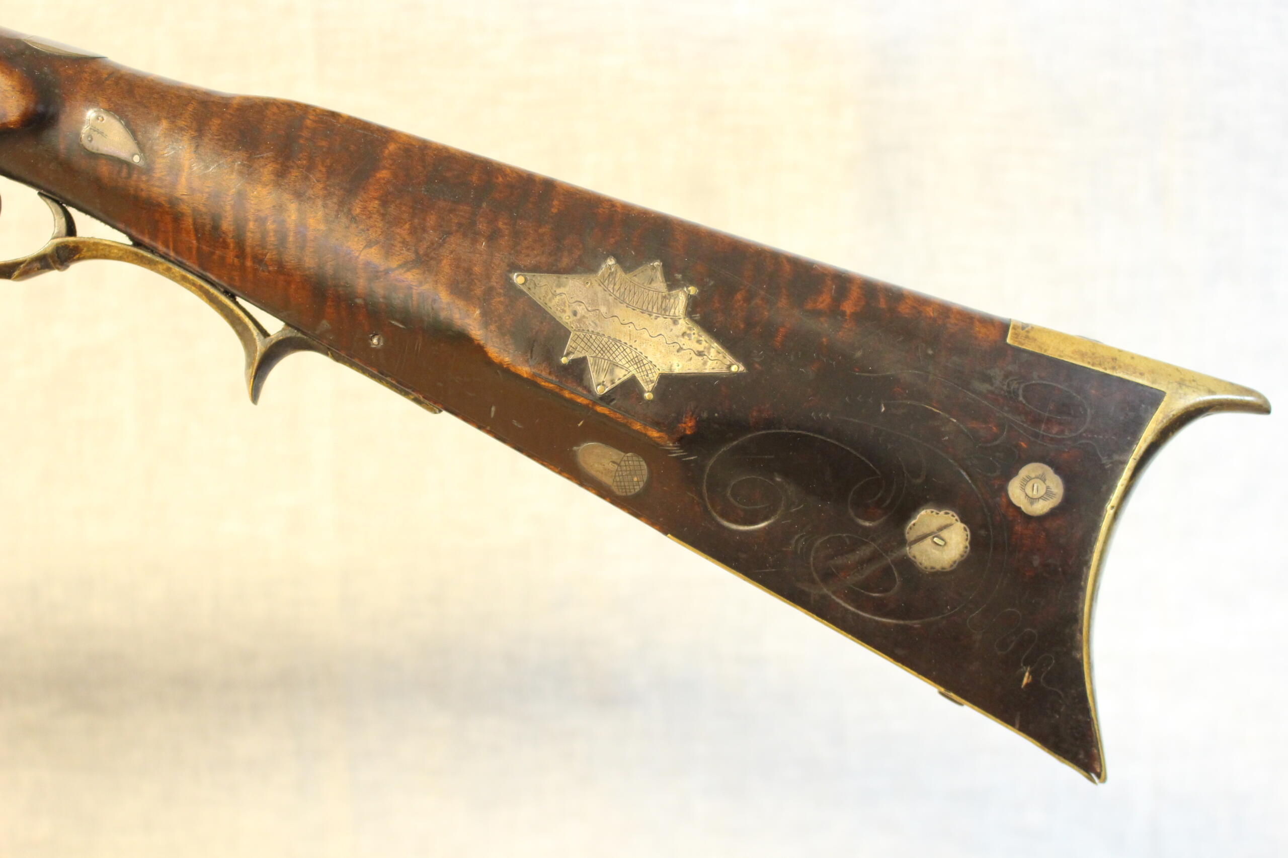 There is no wood replacement but a long sliver of wood is missing along the fore arm. A brass plate has been added above the lock to protect the wood from the burning action of the percussion caps. The 38.5″ rifled barrel is about .40 cal. The percussion lock is original to the rifle and is by Henry Parker. Gunsmiths in the Winchester, Virginia area used silver inlays interspersed in the butt stock carving as well as silver acorn inlays. This style occurs on this example. The silver star inlay on the cheekpiece is engraved similarly to those on the Sheetz rifles of an earlier period in Shepherdstown. The curly maple is of excellent quality and is evident under an old undisturbed finish.