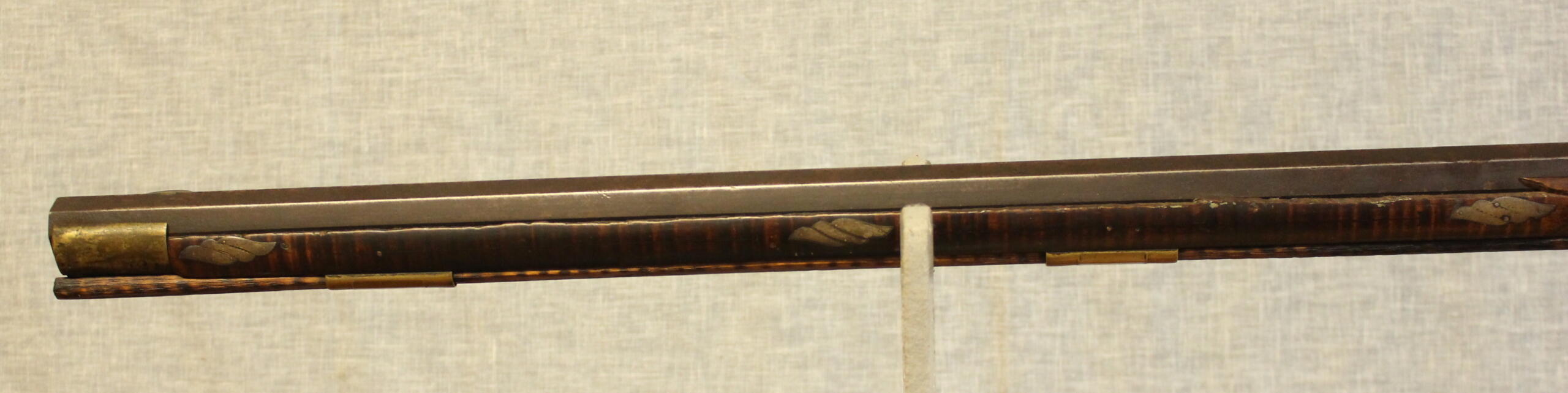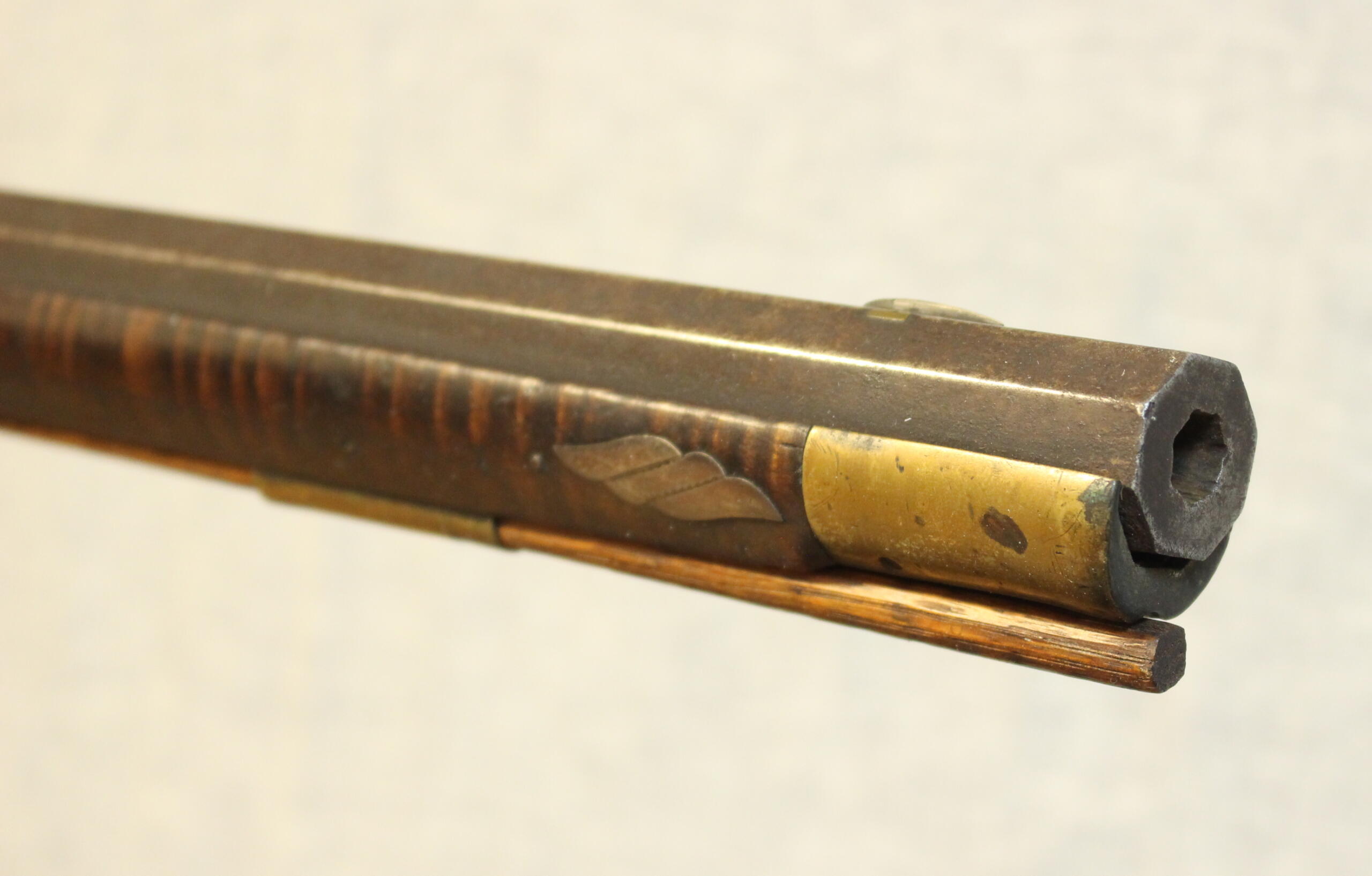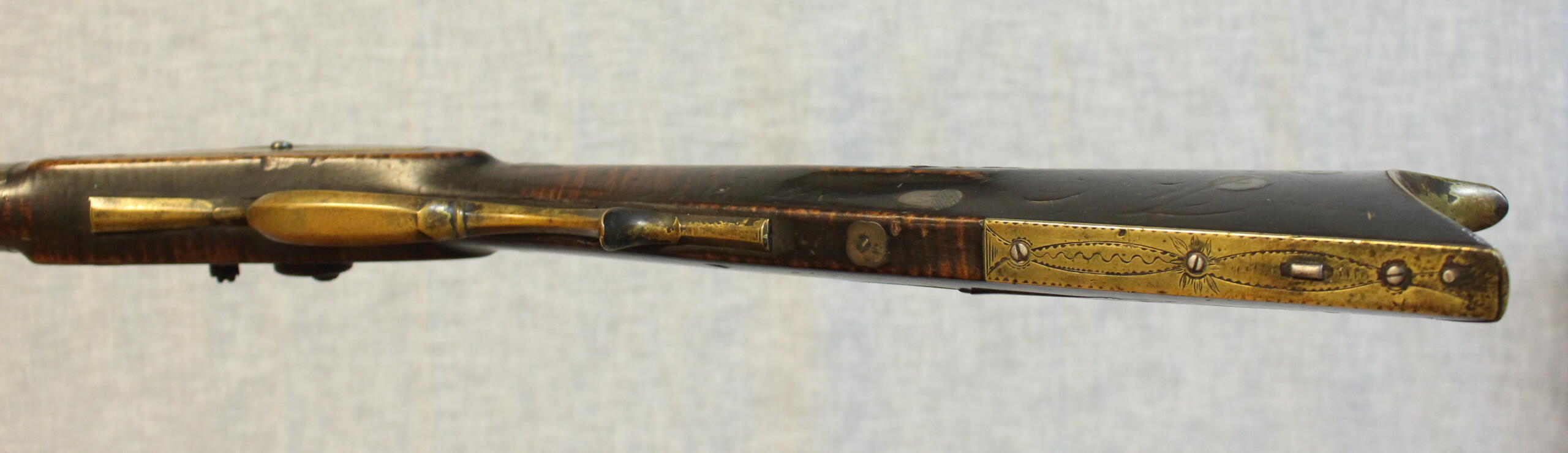 There is no wood replacement but a long sliver of wood is missing along the fore arm. A brass plate has been added above the lock to protect the wood from the burning action of the percussion caps. The 38.5″ rifled barrel is about .40 cal. The percussion lock is original to the rifle and is by Henry Parker. Gunsmiths in the Winchester, Virginia area used silver inlays interspersed in the butt stock carving as well as silver acorn inlays. This style occurs on this example. The silver star inlay on the cheekpiece is engraved similarly to those on the Sheetz rifles of an earlier period in Shepherdstown. The curly maple is of excellent quality and is evident under an old undisturbed finish.