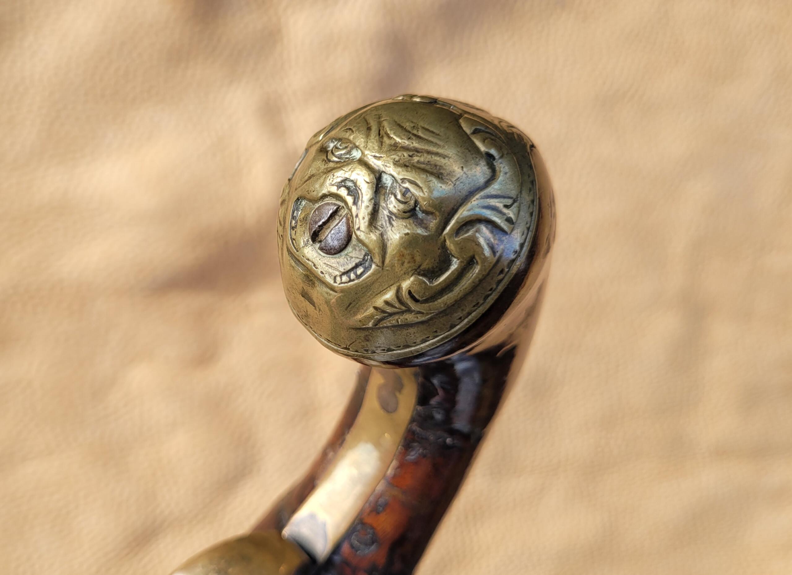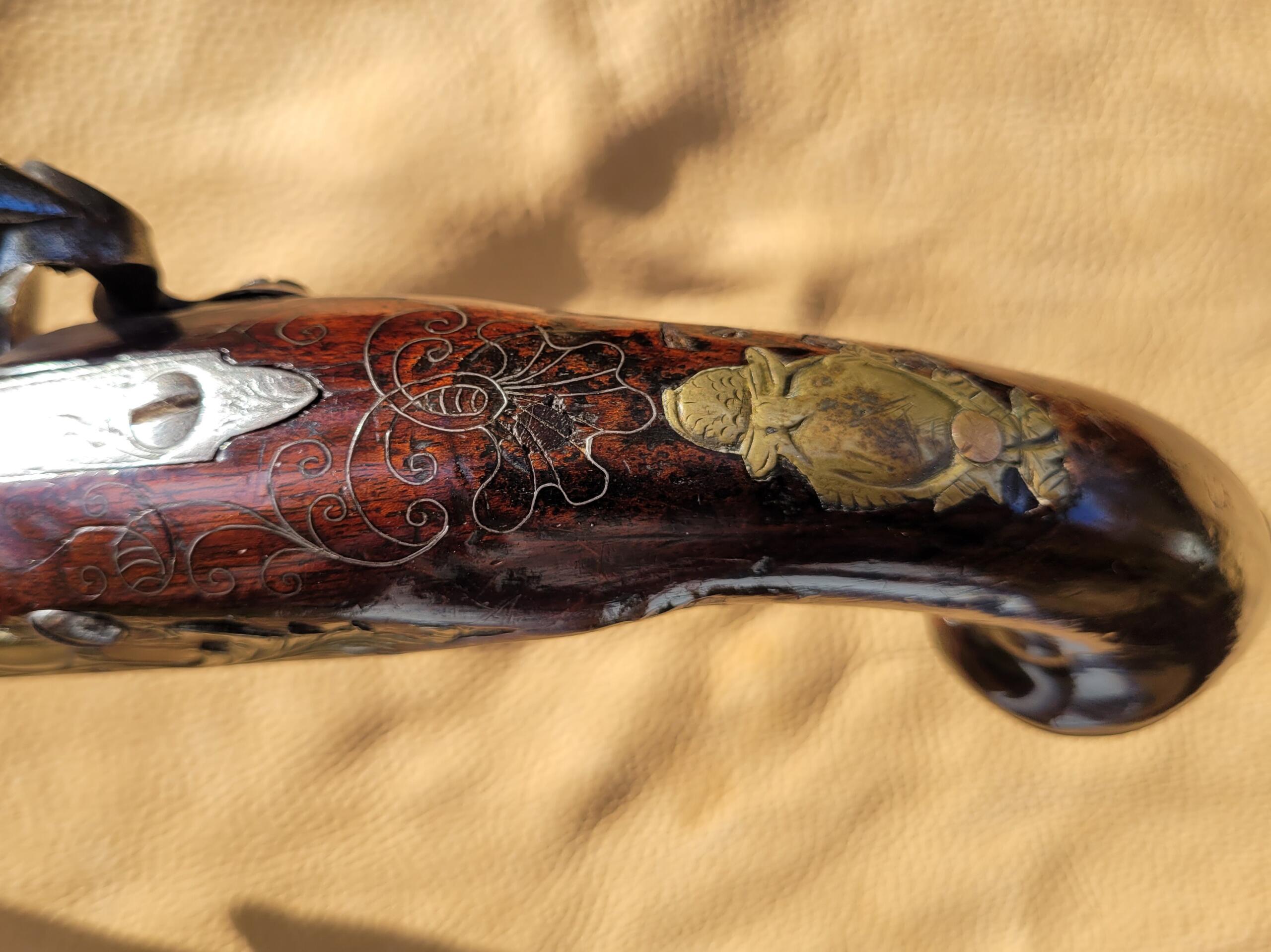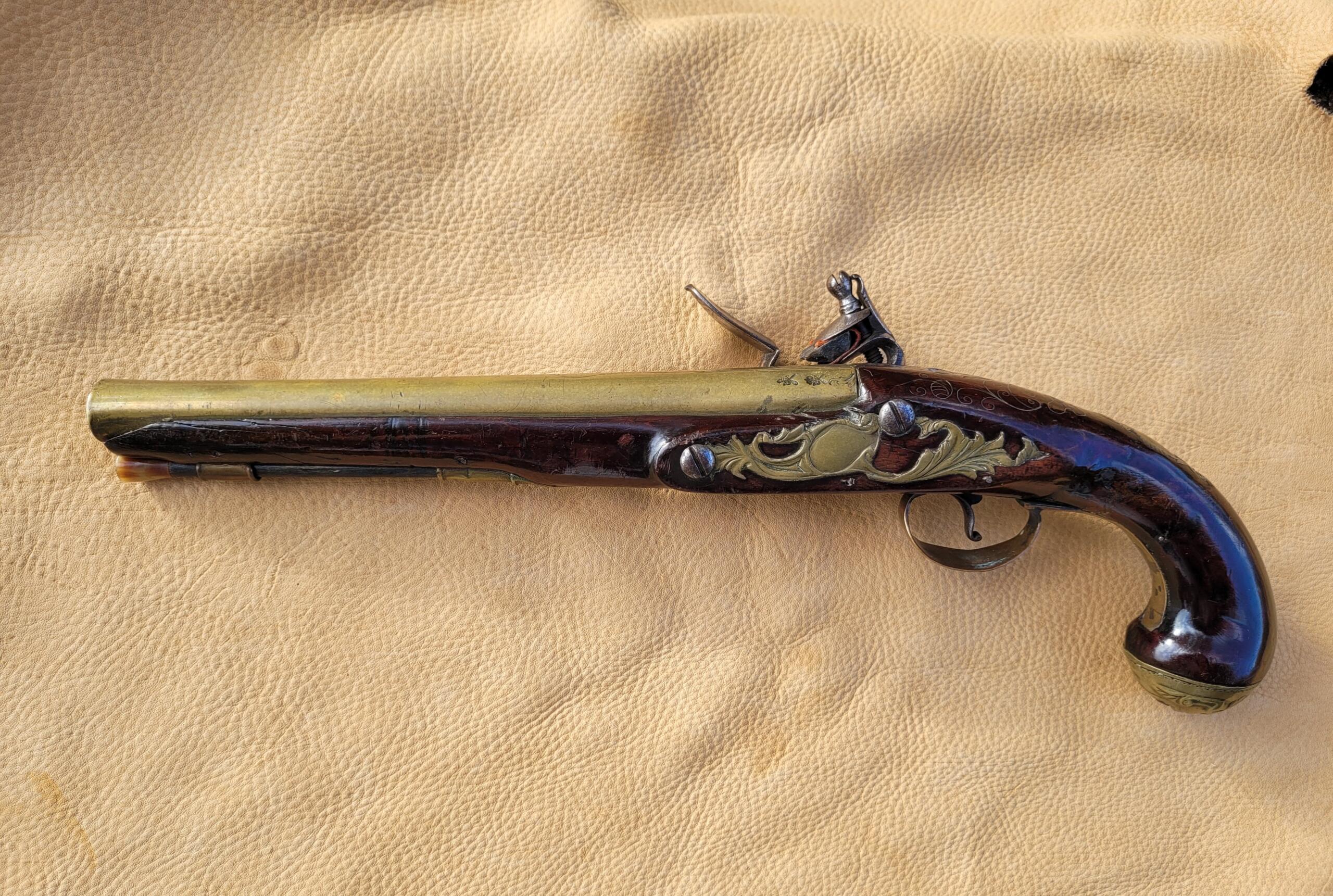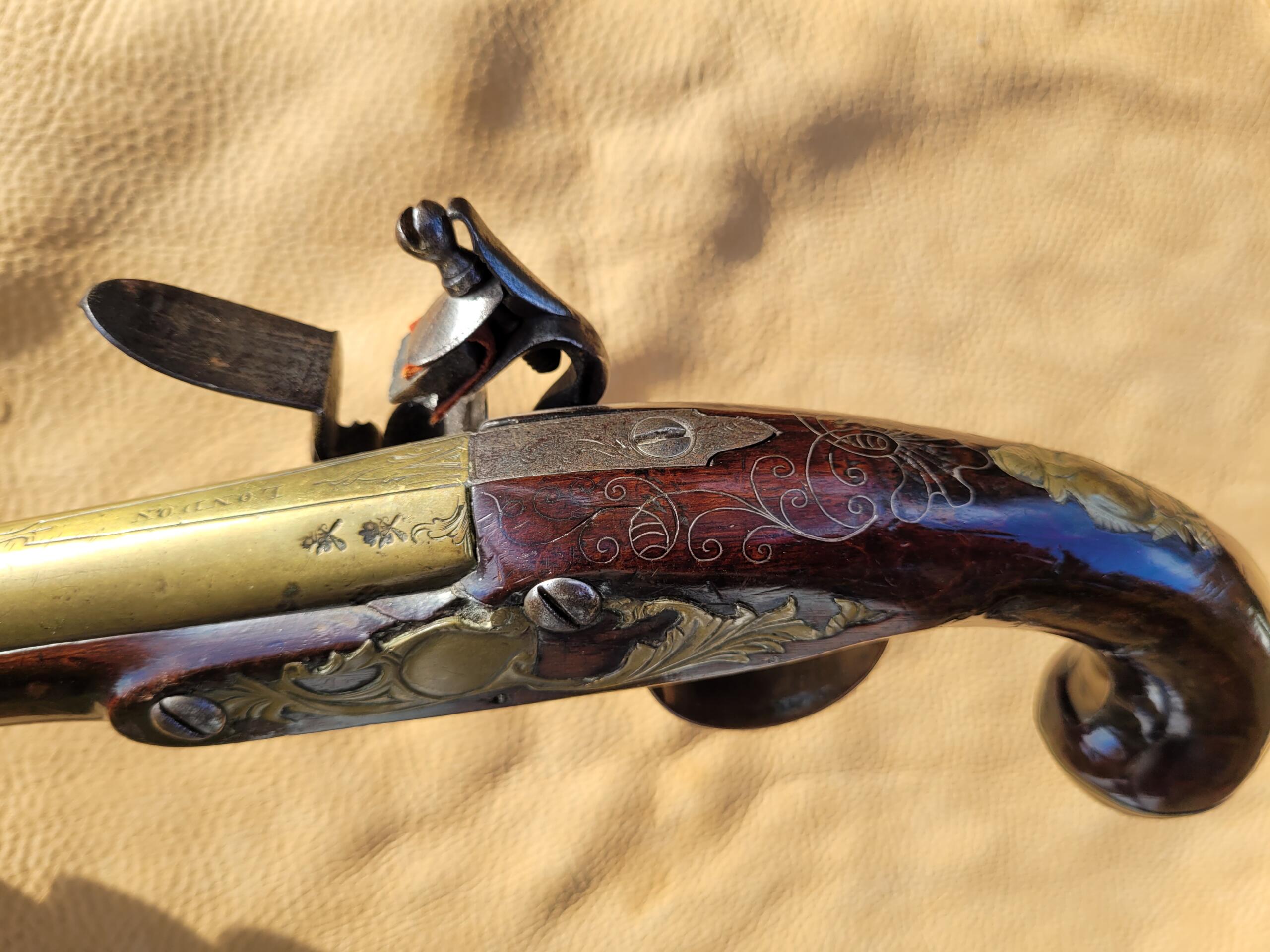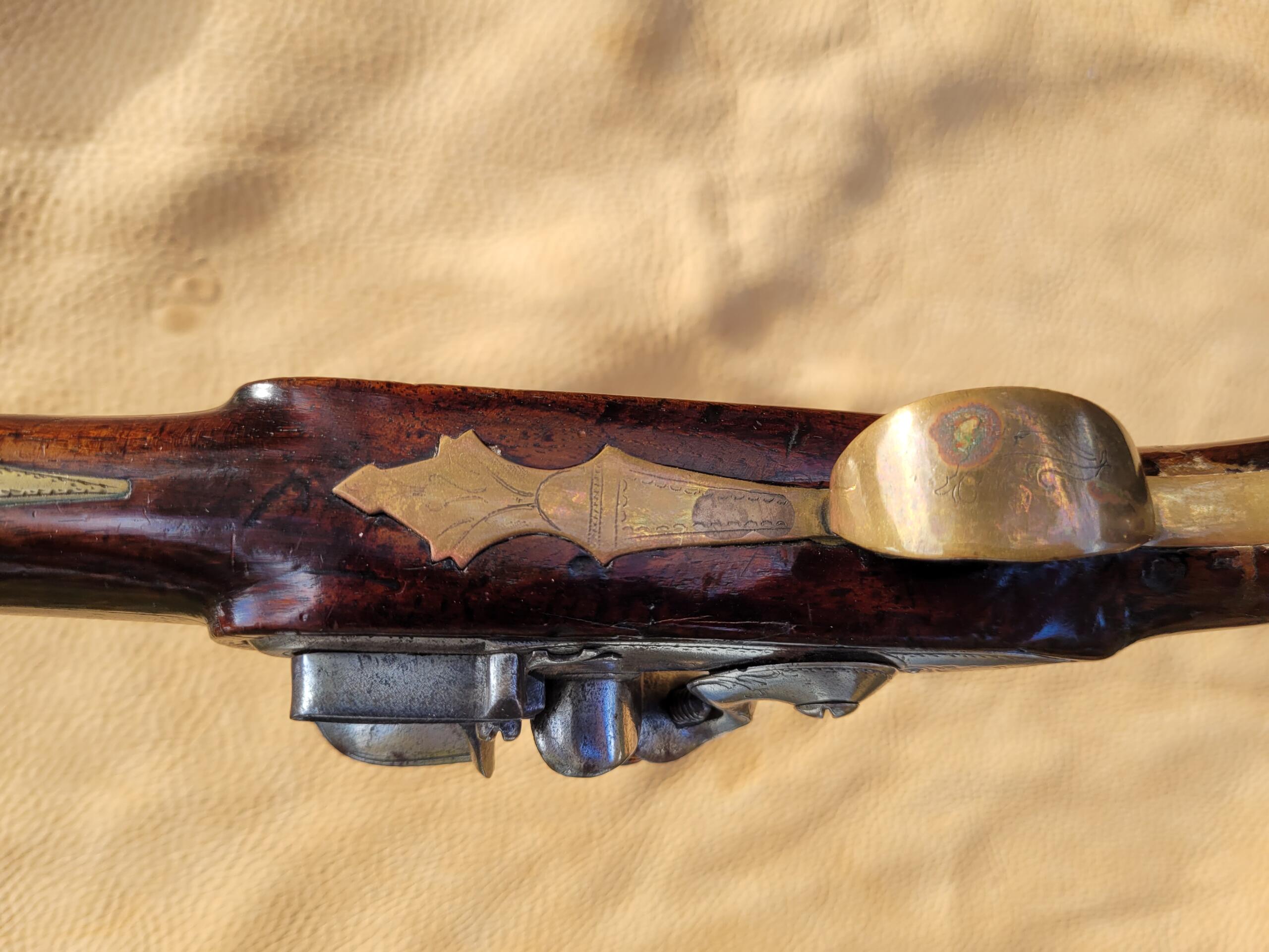 A nice example of an English officer’s or livery pistol with round face lock marked “ADAMS”. The round 9″ barrel, is bored a smooth .62 cal., and is engraved “LONDON” on the top in a teardrop finial. Tower of London private proof marks. Brass pommel cap with grotesque face. Bone tipped rammers with iron worms. Floral brass sideplate. Tang has silver wire inlay in a shell motif and brass thumbpiece. Stock shows numerous repairs, cracks, and chips throughout. Trigger guard is a replacement in the correct style but formed from brass sheet. Mechanically fine. Overall, a nice piece, circa 1760s.