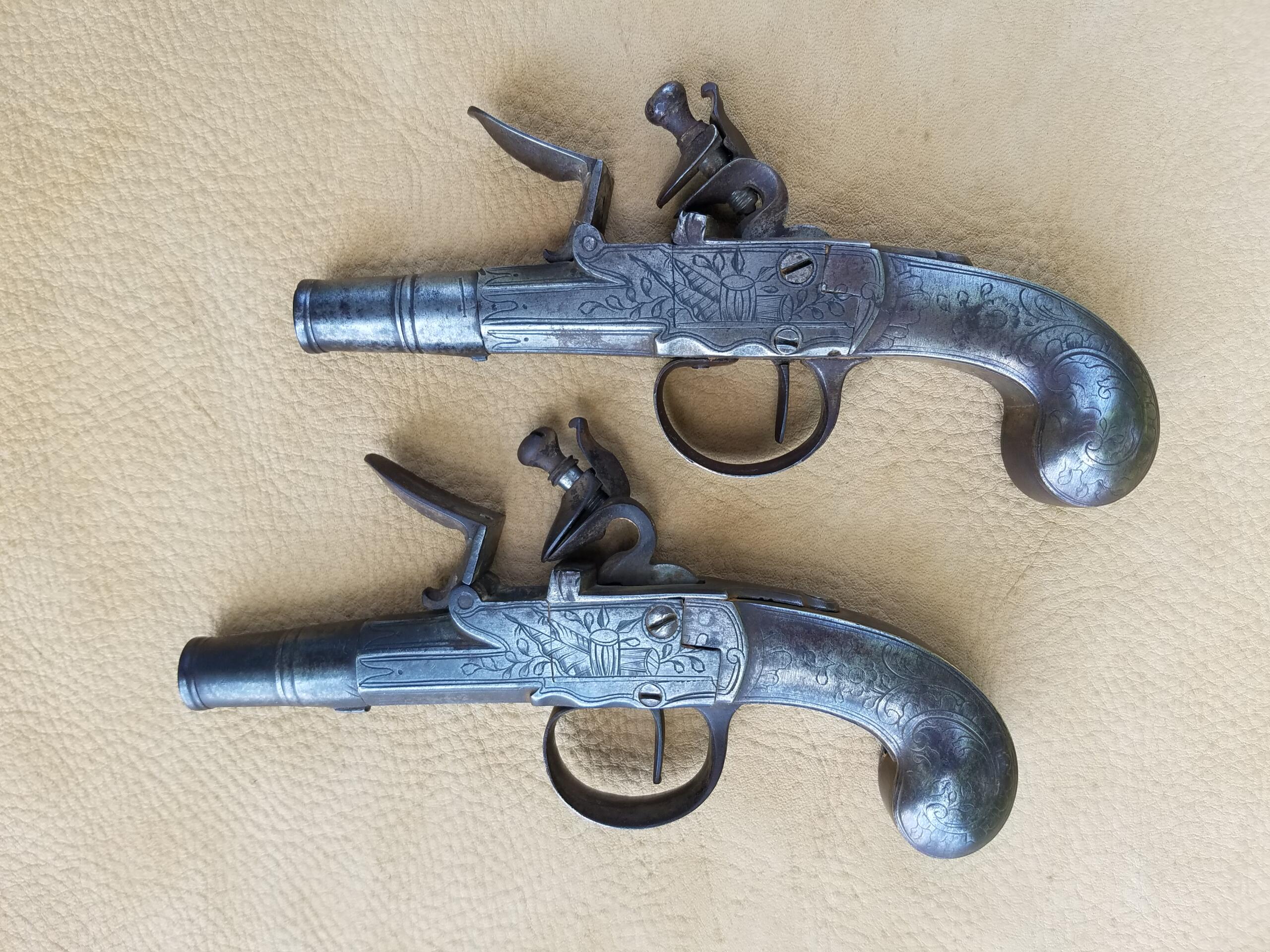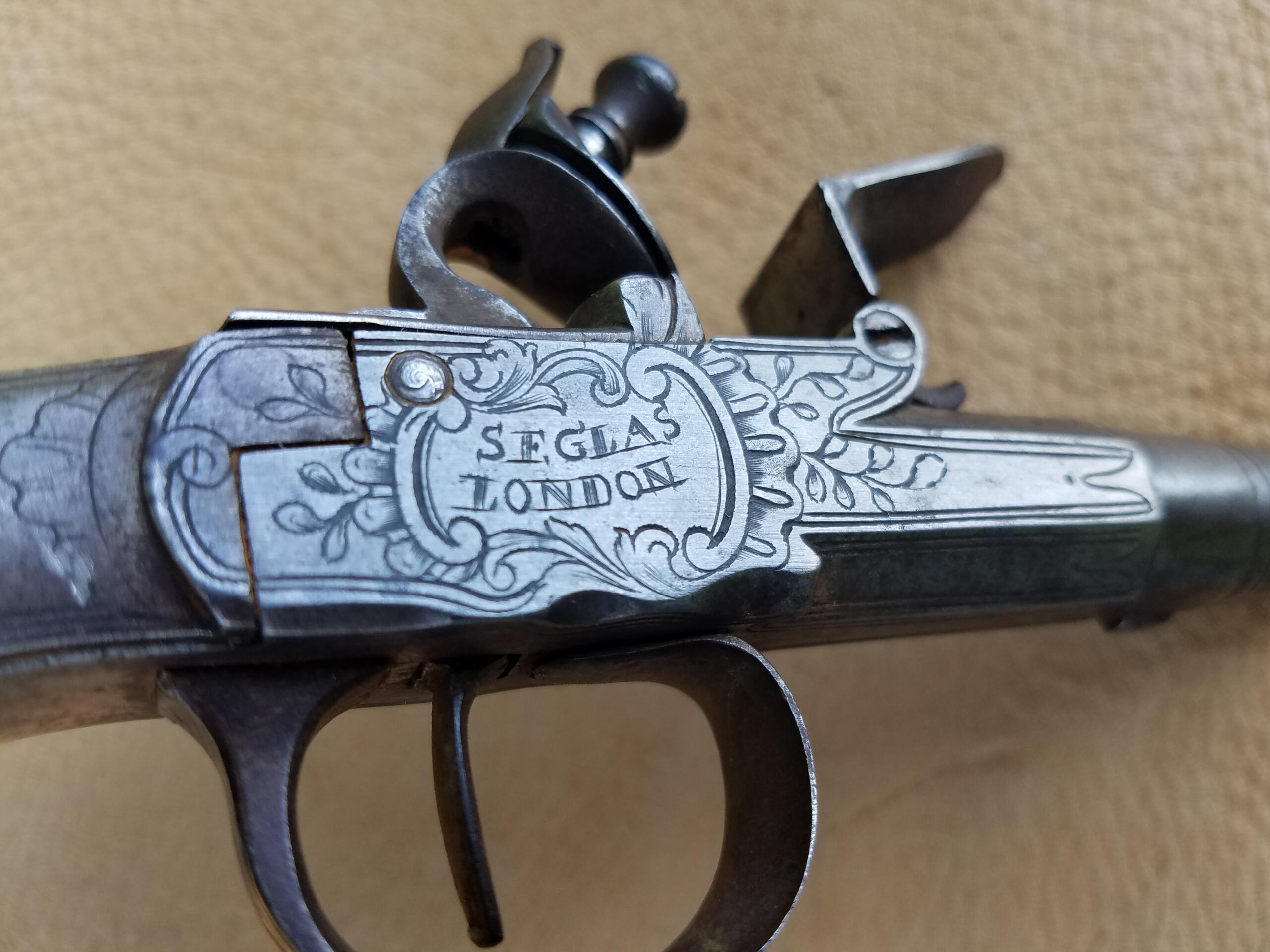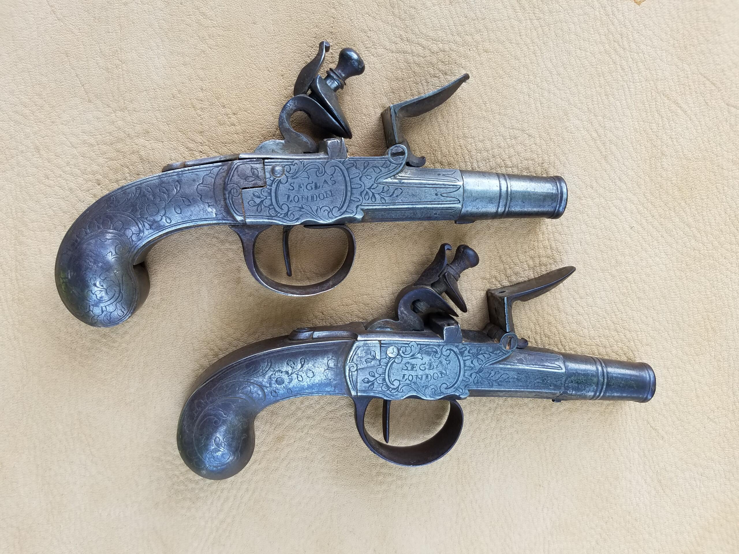 A beautiful little pair of 18th c. all-metal pocket pistols with screw off barrels. Engraved “SEGLAS LONDON” one side, panoply of arms on the other, and featuring floral engraving throughout. The iron has aged to a very pleasant gray patina. Barrels are .40 cal, and pistols are 5 3/4″ overall in length. Condition is very good. One pistol does require the trigger to be pushed forward for the hammer to engage at full-cock. The other pistol is mechanically excellant. Overall, a rare, matched pair of a relatively scarce all-metal type pistol.