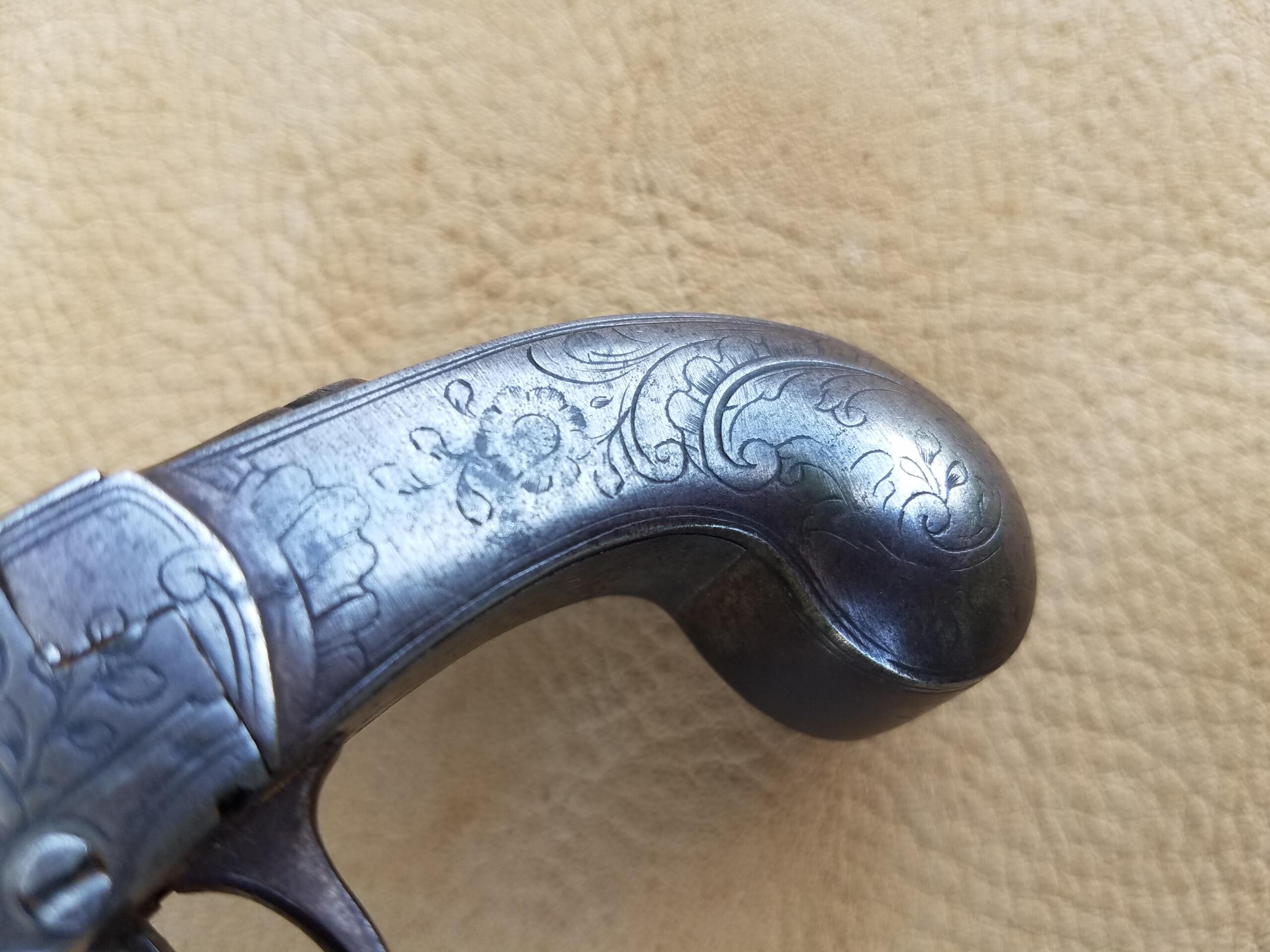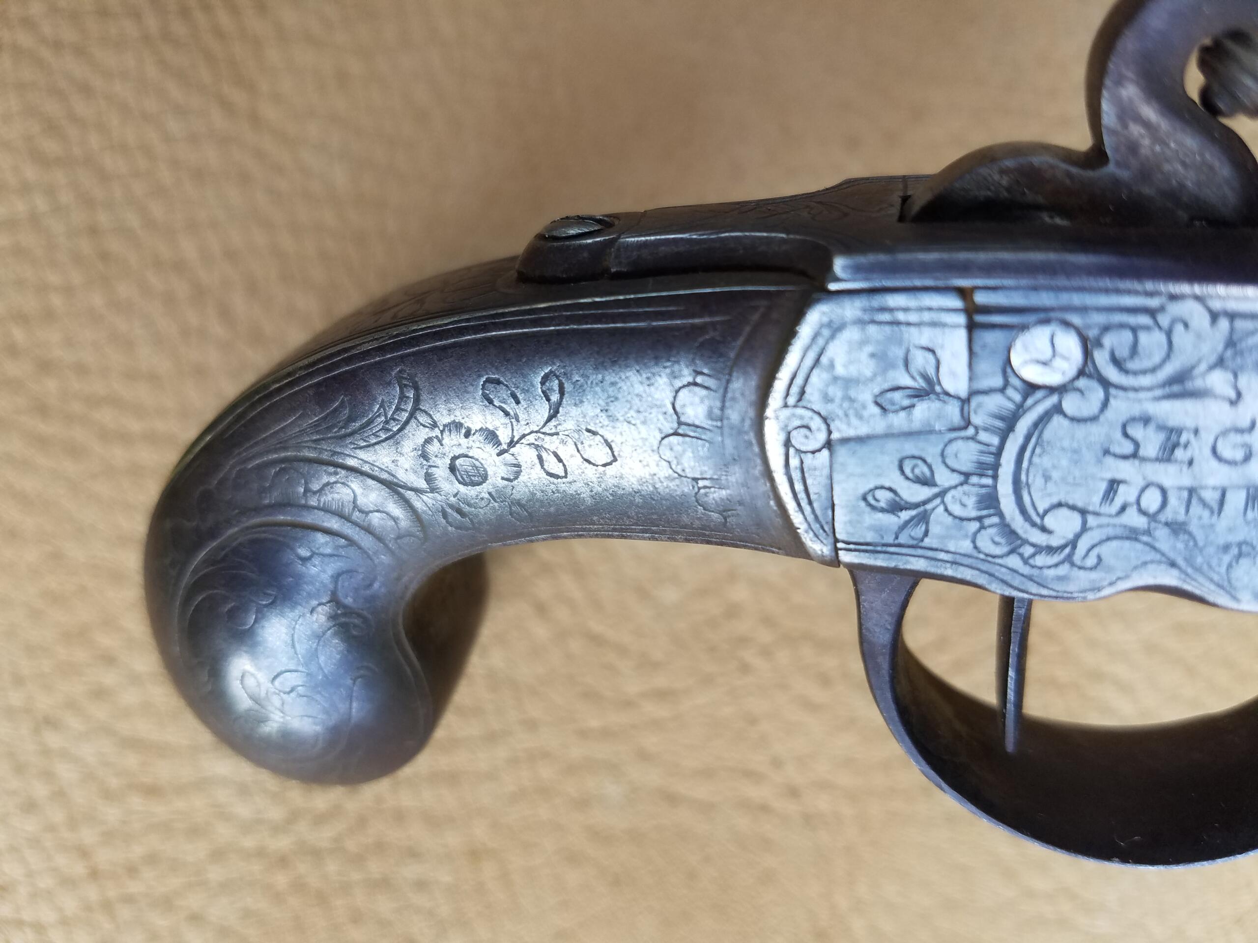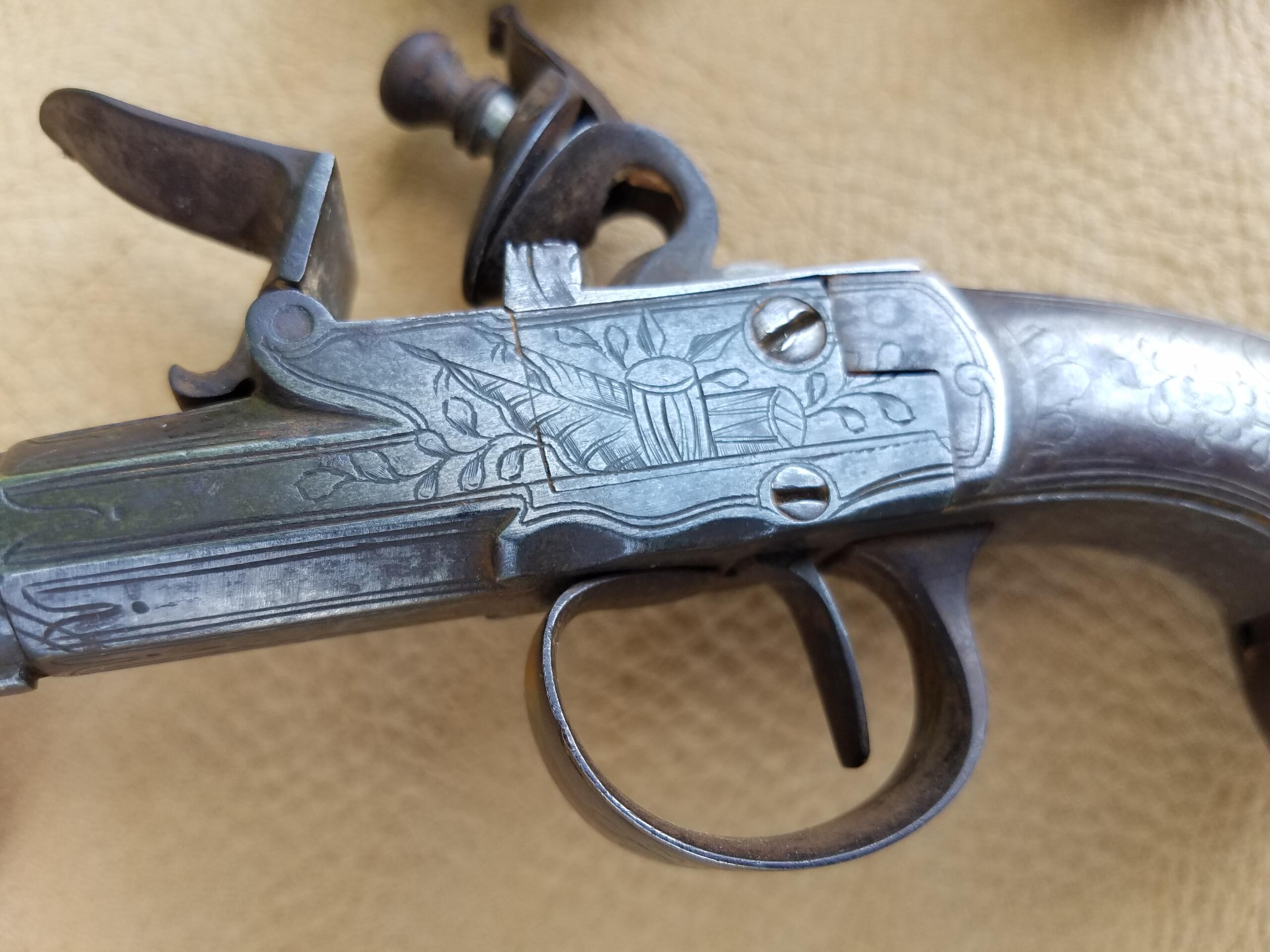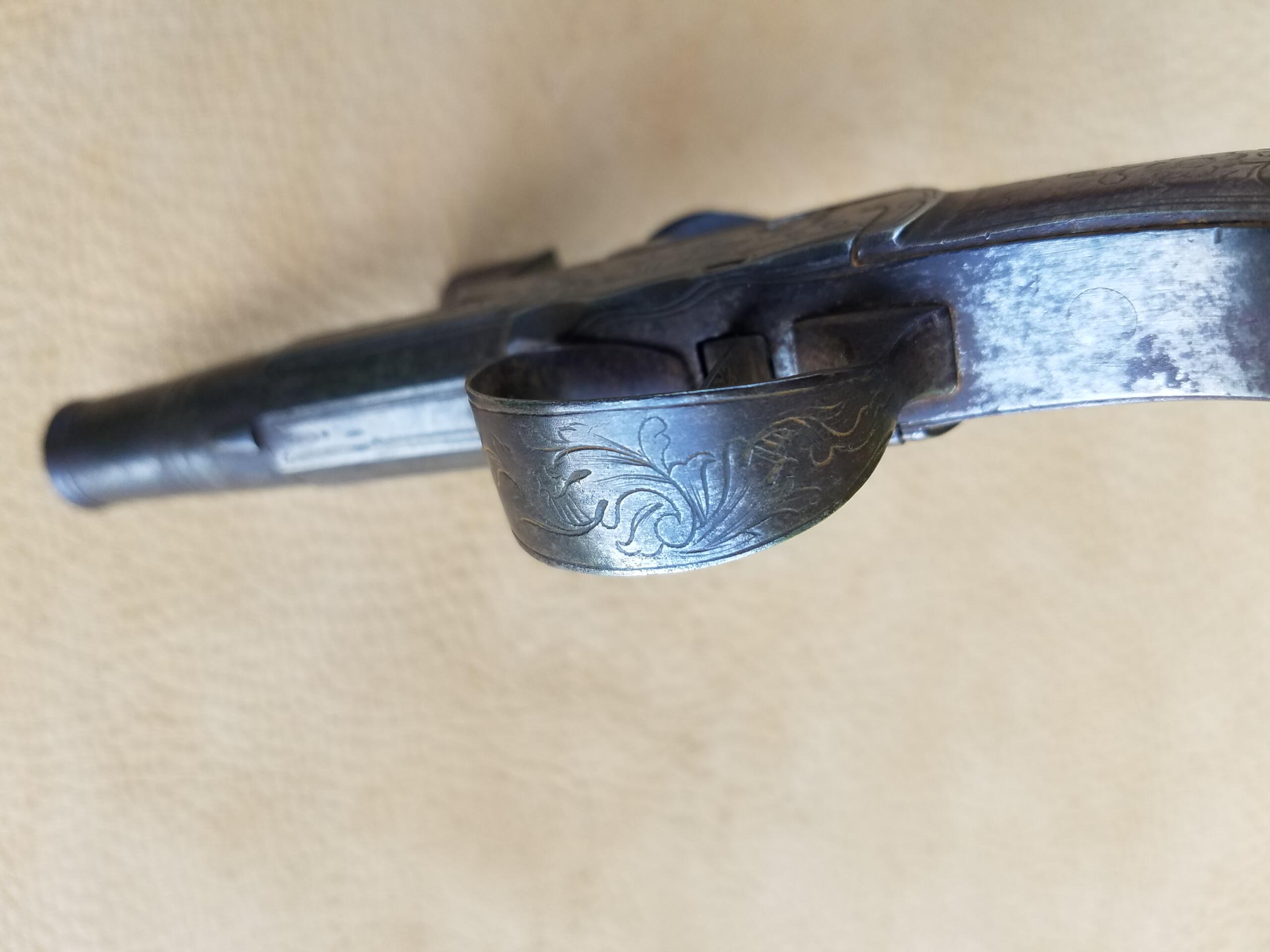 A beautiful little pair of 18th c. all-metal pocket pistols with screw off barrels. Engraved “SEGLAS LONDON” one side, panoply of arms on the other, and featuring floral engraving throughout. The iron has aged to a very pleasant gray patina. Barrels are .40 cal, and pistols are 5 3/4″ overall in length. Condition is very good. One pistol does require the trigger to be pushed forward for the hammer to engage at full-cock. The other pistol is mechanically excellant. Overall, a rare, matched pair of a relatively scarce all-metal type pistol.