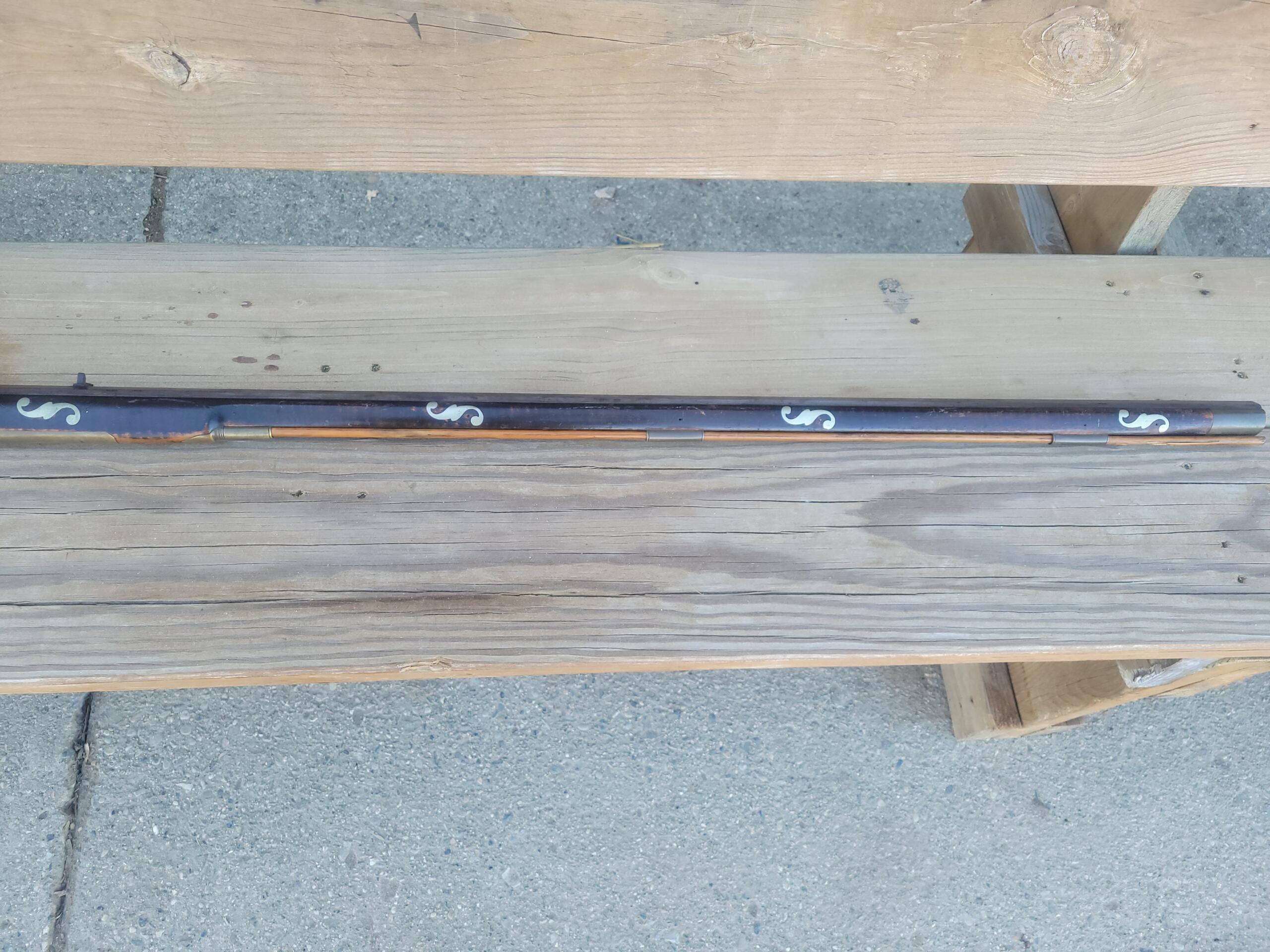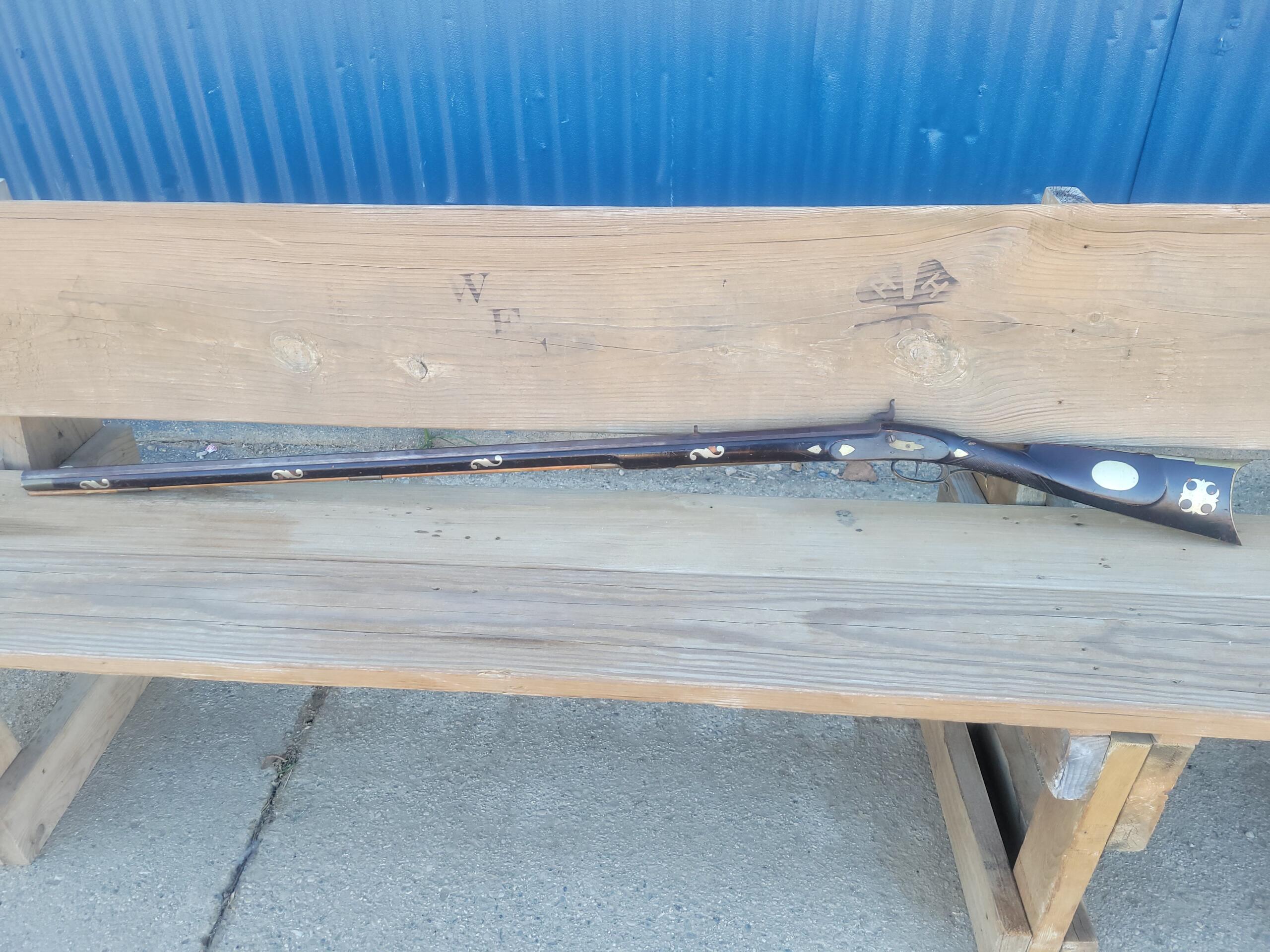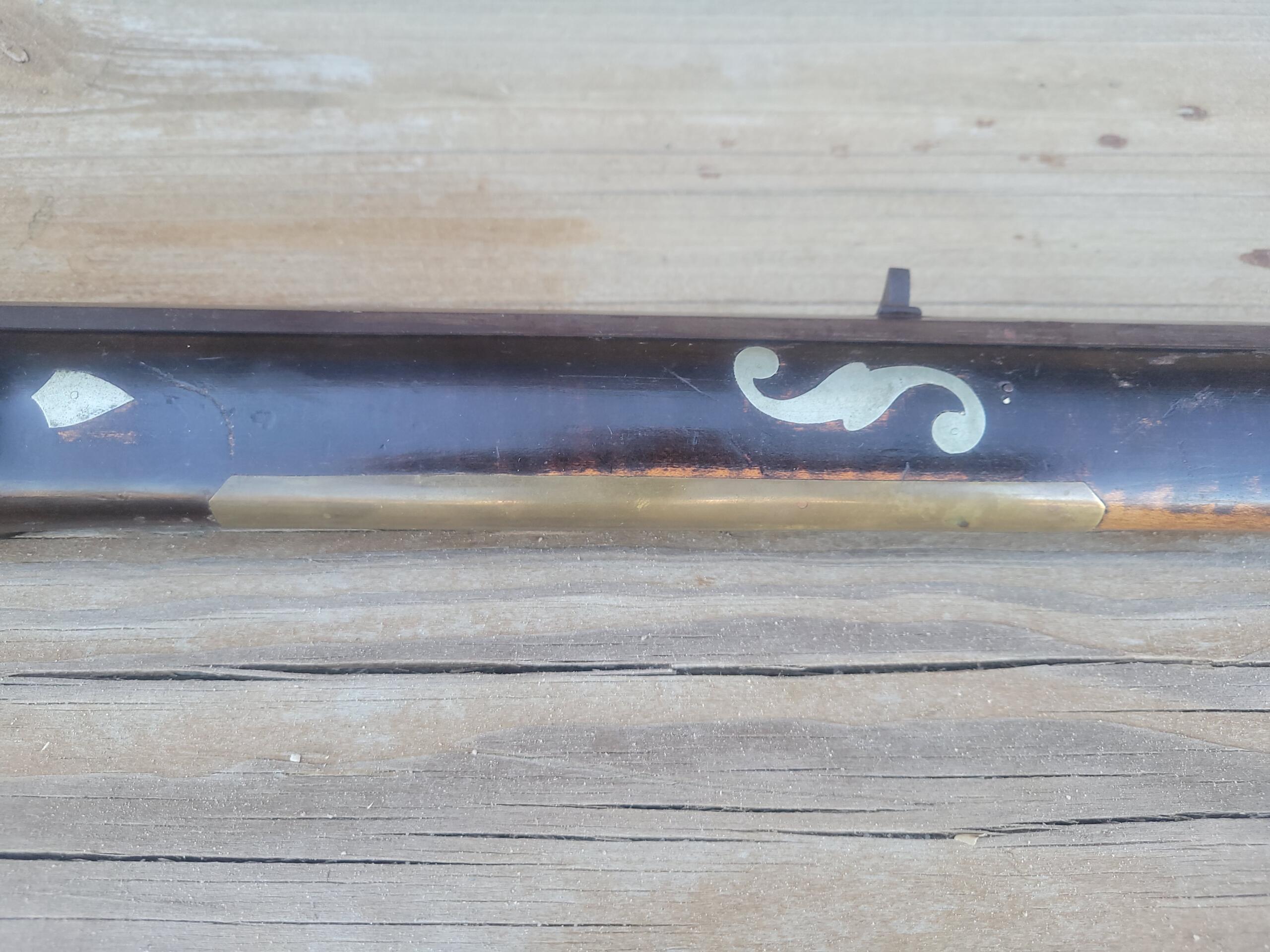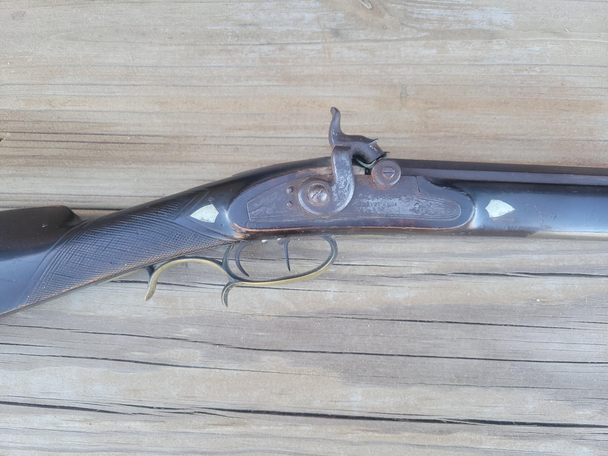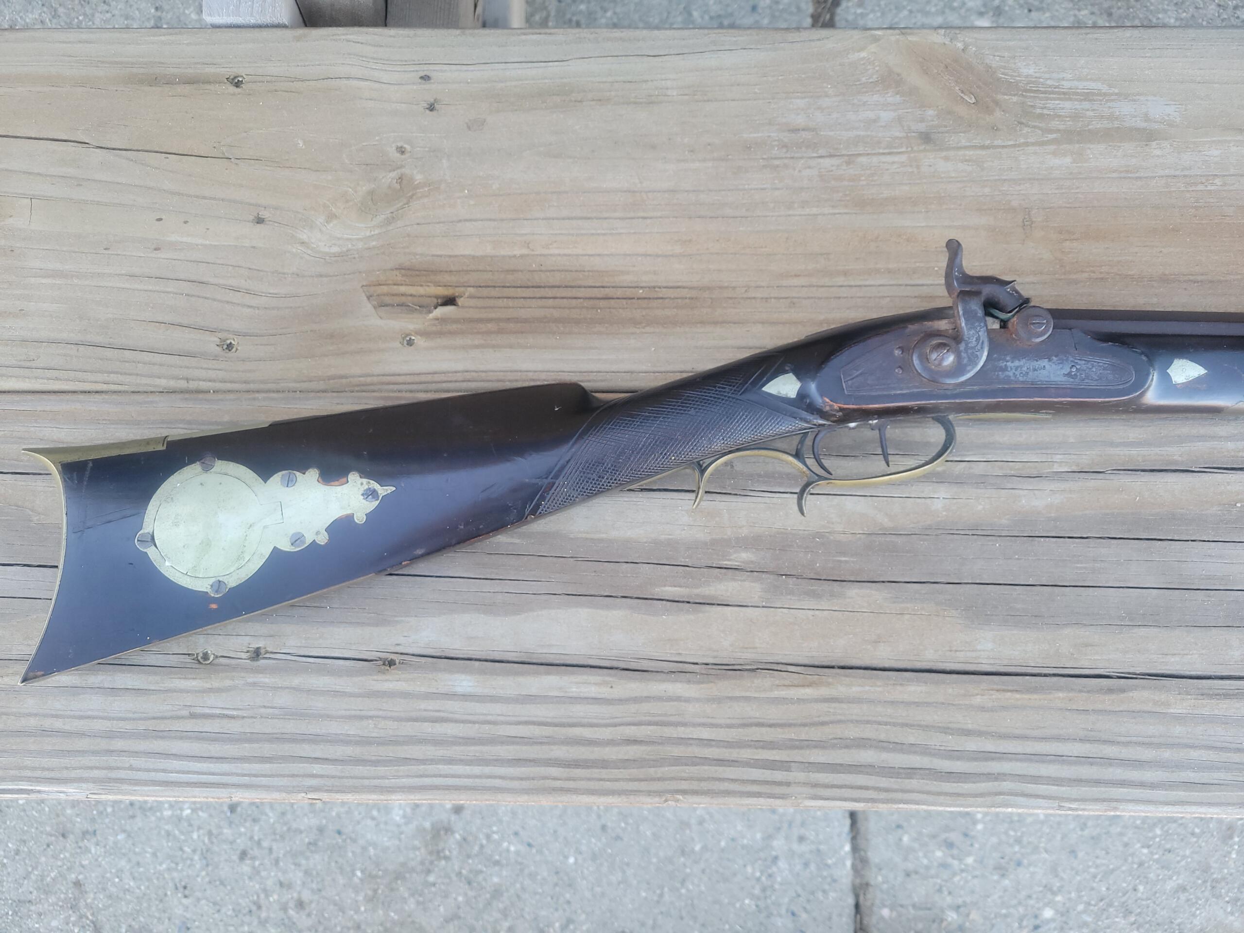 Beautiful longrifle in excellent, untouched condition. 44 1/2″ barrel, unsigned, Truitt Bros. lock from Philadelphia. Large capbox, attractive inlays everywhere, checkered wrist.