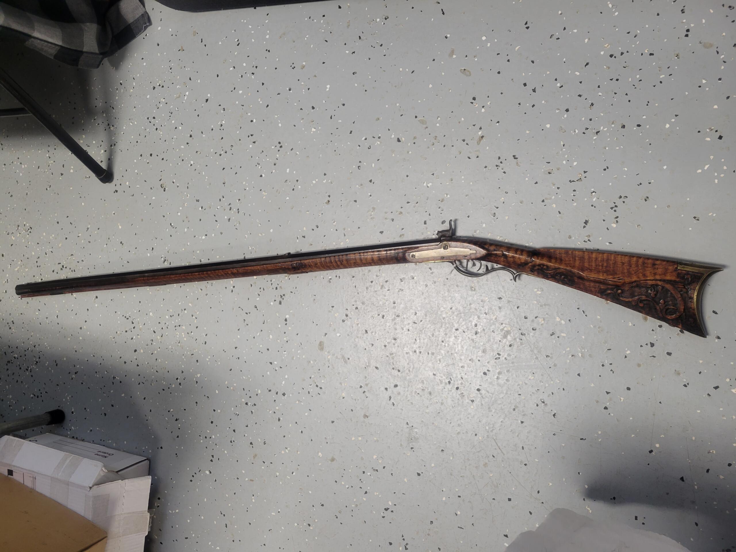 Unsigned, but with similarities to Peter White’s work. Beautiful patchbox, nice carving in multiple areas. Barrel and forestock stretched about six inches.