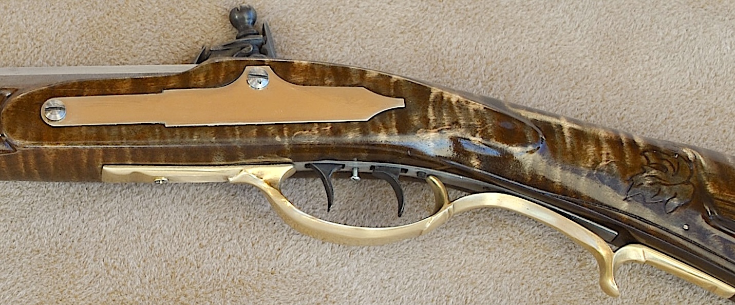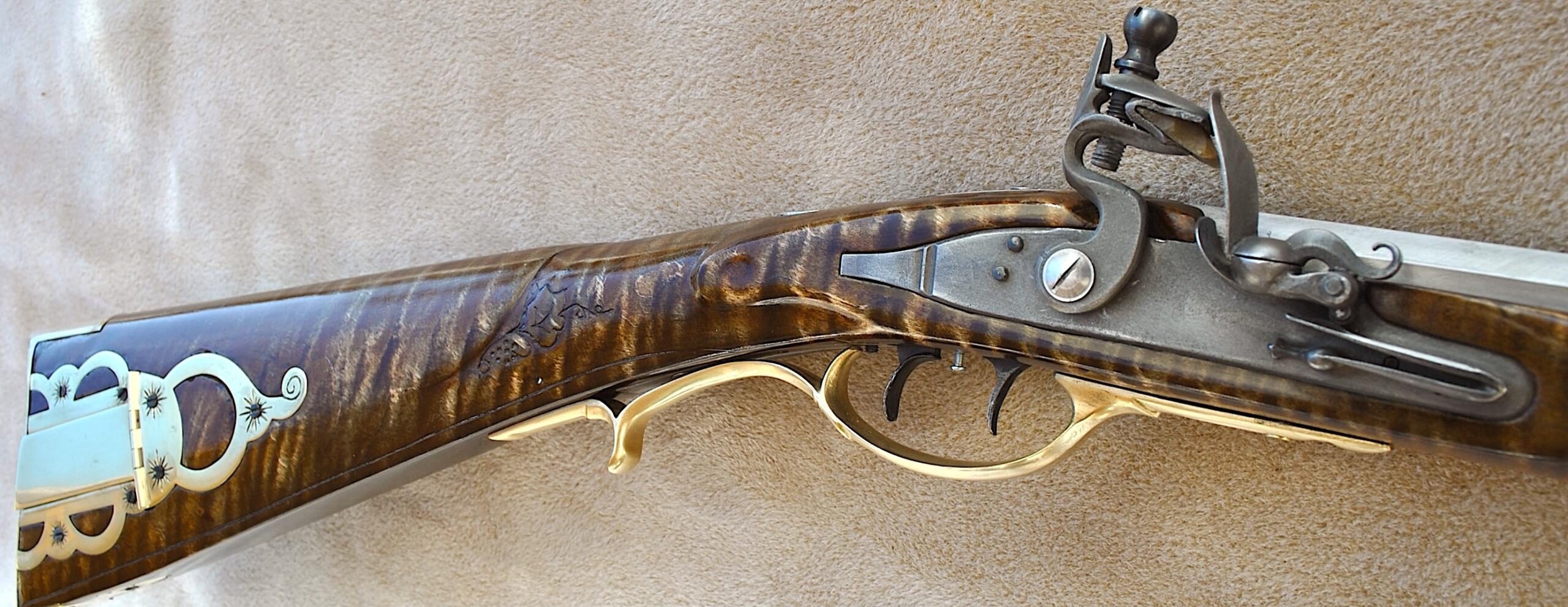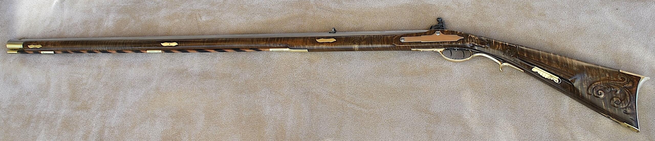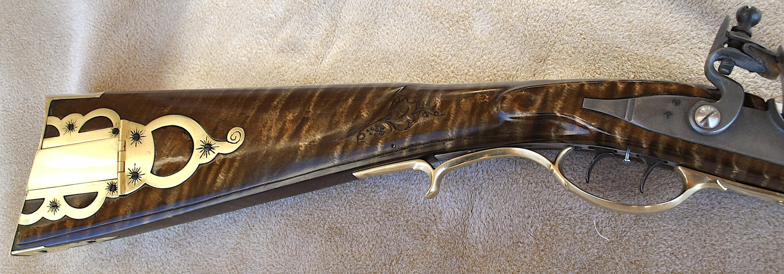 This Bedford 36 caliber rifle was built to showcase the aesthetic appeal of it’s length of 42 inch Colerain barrel. It is set in a curly maple #4 stock with stripes and banded colors. The stable stock and comfortable comb, matted to a light double trigger, minimizes shooting error. Being long, the barrel contributes to the consistent accuracy and grouping of target hits. The barrel is mated to an L&R Bedford double trigger and L&R Bedford lock. The rear trigger has an even easy pull and is 13 ¼ inches from the butt plate while the front is 14 ¼ inches. The sleek trigger guard and silver side plate accent the length and shape of the rifle. The butt plate, trigger guard, thimbles, nose cap, 6 discrete inlays, and toe piece are brass. A touch hole cleaner is underside of the cheek rest. A cleaning rod and striped hickory ram rod with jag tip is included. The patch box and toe plate have been engraved and there is an oak leaf relief carving on the butt. Along the fore-stock and wrist are incised grape motifs. All elements of this rifle contribute to its consistent medium to long range accuracy and hunting performance. This rifle is offered at $2,150. Please contact me at patchbox1776@gmail.com for more information about the build qualities or for more pictures. Free shipping to anywhere in the continental USA.