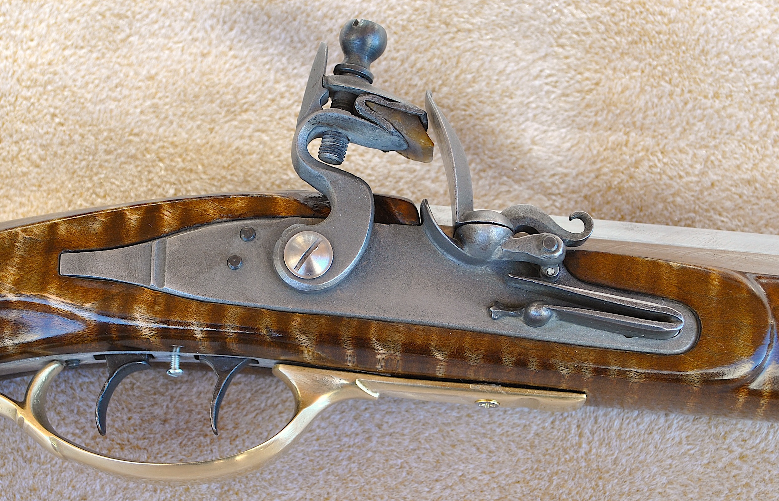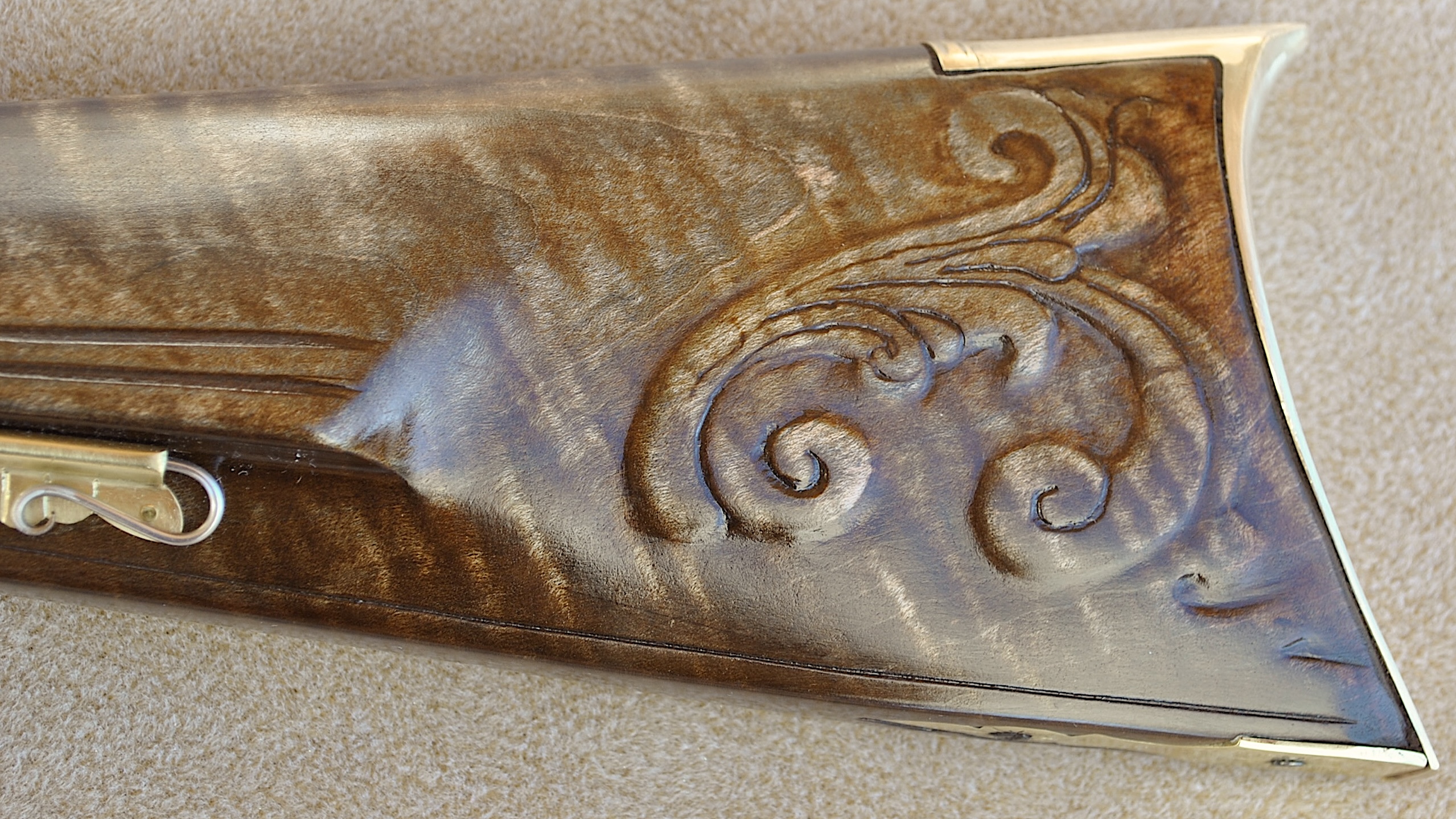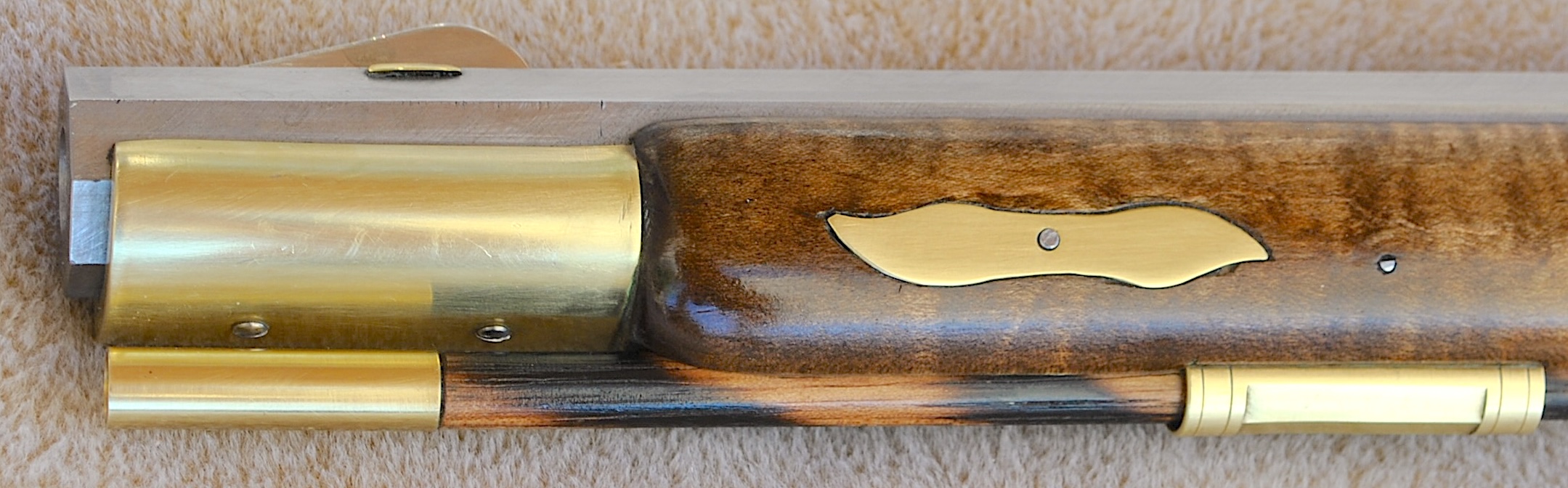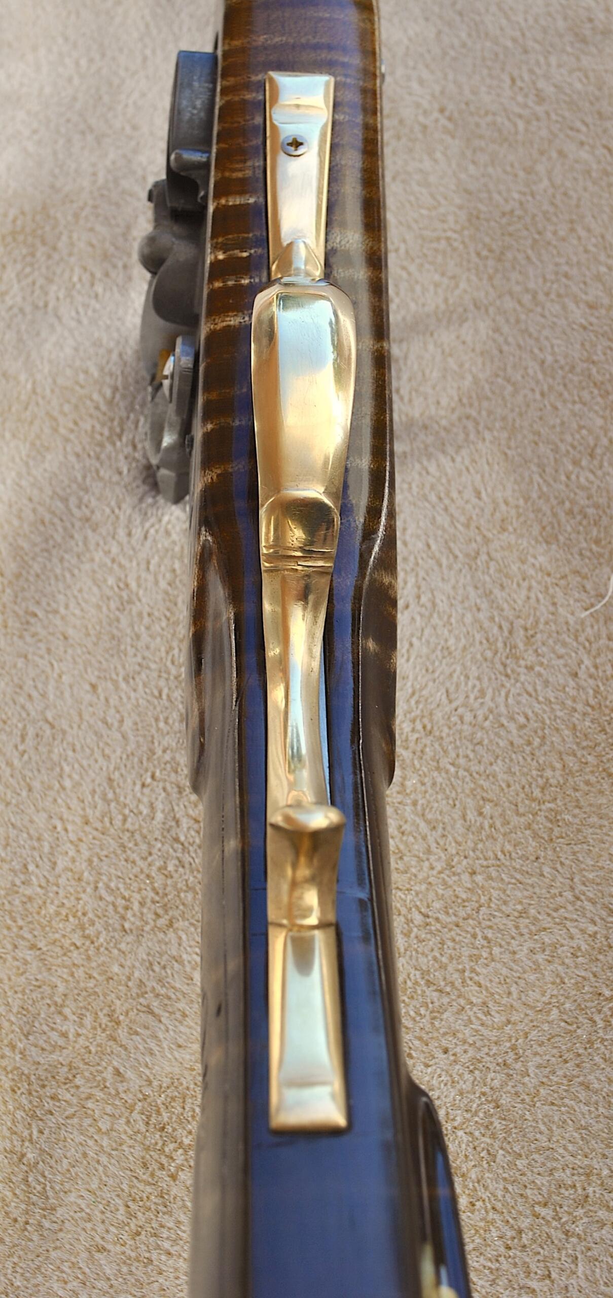This Bedford 36 caliber rifle was built to showcase the aesthetic appeal of it’s length of 42 inch Colerain barrel. It is set in a curly maple #4 stock with stripes and banded colors. The stable stock and comfortable comb, matted to a light double trigger, minimizes shooting error. Being long, the barrel contributes to the consistent accuracy and grouping of target hits. The barrel is mated to an L&R Bedford double trigger and L&R Bedford lock. The rear trigger has an even easy pull and is 13 ¼ inches from the butt plate while the front is 14 ¼ inches. The sleek trigger guard and silver side plate accent the length and shape of the rifle. The butt plate, trigger guard, thimbles, nose cap, 6 discrete inlays, and toe piece are brass. A touch hole cleaner is underside of the cheek rest. A cleaning rod and striped hickory ram rod with jag tip is included. The patch box and toe plate have been engraved and there is an oak leaf relief carving on the butt. Along the fore-stock and wrist are incised grape motifs. All elements of this rifle contribute to its consistent medium to long range accuracy and hunting performance. This rifle is offered at $2,150. Please contact me at patchbox1776@gmail.com for more information about the build qualities or for more pictures. Free shipping to anywhere in the continental USA.