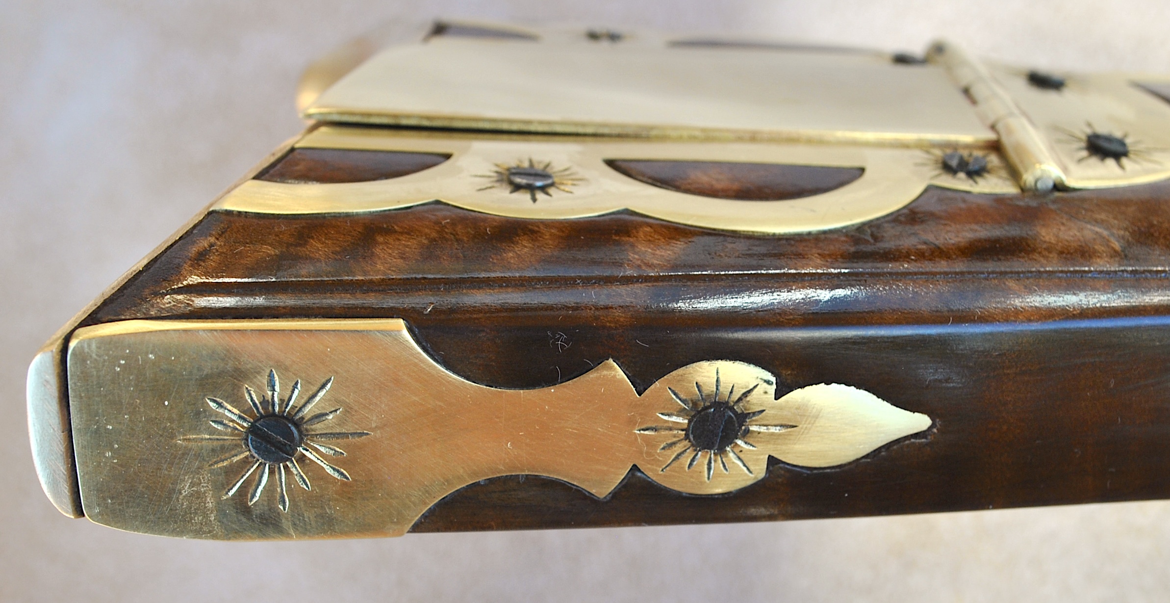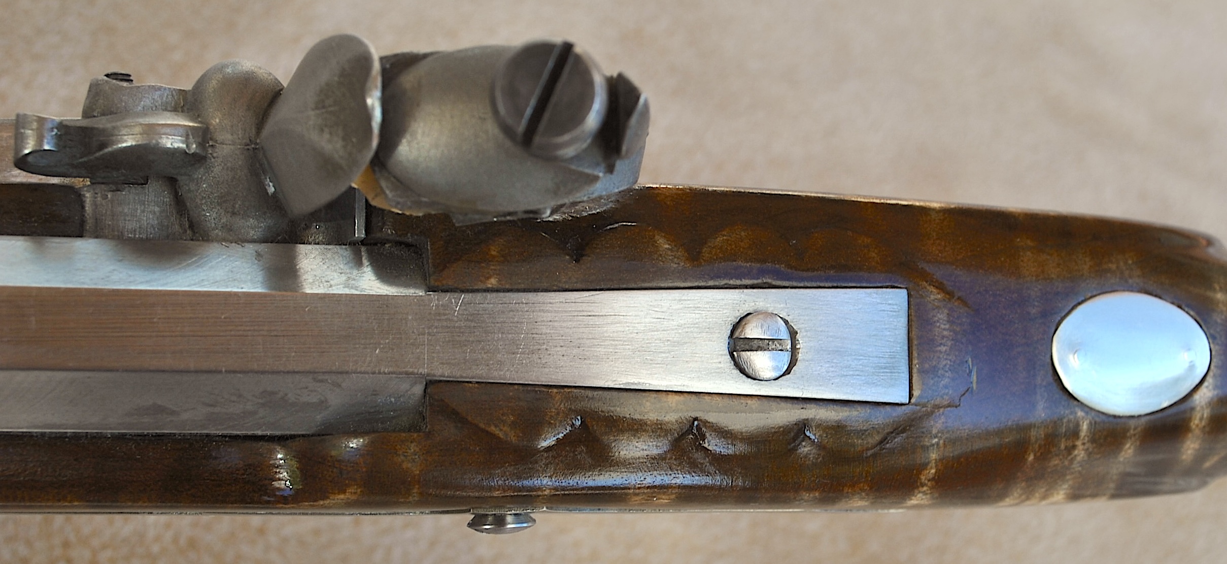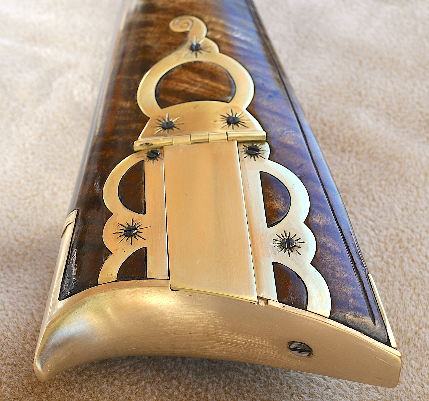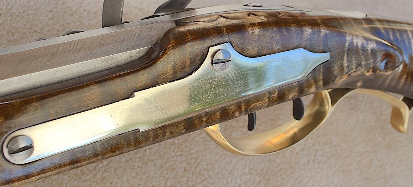This Bedford 36 caliber rifle was built to showcase the aesthetic appeal of it’s length of 42 inch Colerain barrel. It is set in a curly maple #4 stock with stripes and banded colors. The stable stock and comfortable comb, matted to a light double trigger, minimizes shooting error. Being long, the barrel contributes to the consistent accuracy and grouping of target hits. The barrel is mated to an L&R Bedford double trigger and L&R Bedford lock. The rear trigger has an even easy pull and is 13 ¼ inches from the butt plate while the front is 14 ¼ inches. The sleek trigger guard and silver side plate accent the length and shape of the rifle. The butt plate, trigger guard, thimbles, nose cap, 6 discrete inlays, and toe piece are brass. A touch hole cleaner is underside of the cheek rest. A cleaning rod and striped hickory ram rod with jag tip is included. The patch box and toe plate have been engraved and there is an oak leaf relief carving on the butt. Along the fore-stock and wrist are incised grape motifs. All elements of this rifle contribute to its consistent medium to long range accuracy and hunting performance. This rifle is offered at $2,150. Please contact me at patchbox1776@gmail.com for more information about the build qualities or for more pictures. Free shipping to anywhere in the continental USA.