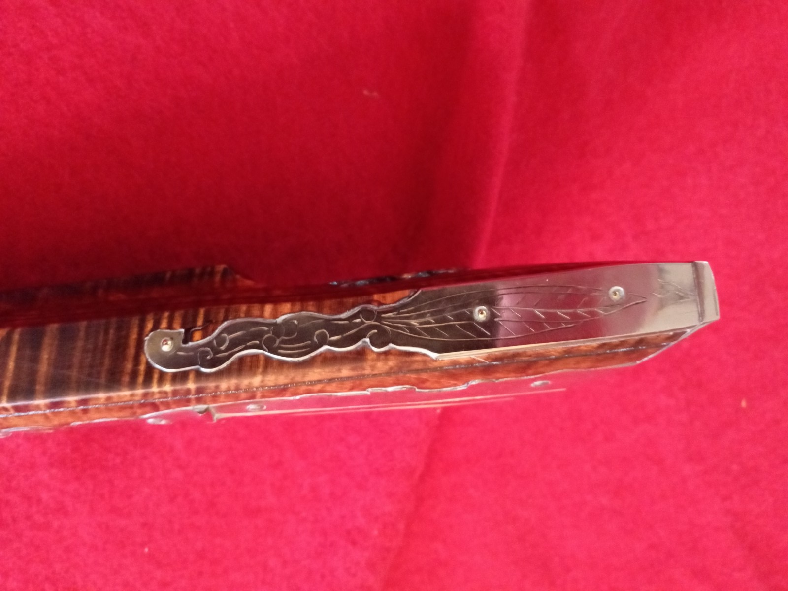 This German Silver rifle has a 40 inch barrel In 54 caliber. The siler lock is browned as well as the barrel. The rifle has double set triggers, G S engraved patchbox, six G S inlays along the barrel, G S chevron nose cap, engraved side plate and toe plate. The rifle has incised and relief carving as well as wire inlays. The rifle is stocked in beautiful tiger stripe maple. The rifle is numbered 103 below the signature of the builder. For more information contact Ken at klsrifles@Q.com or phone 520 818 1756