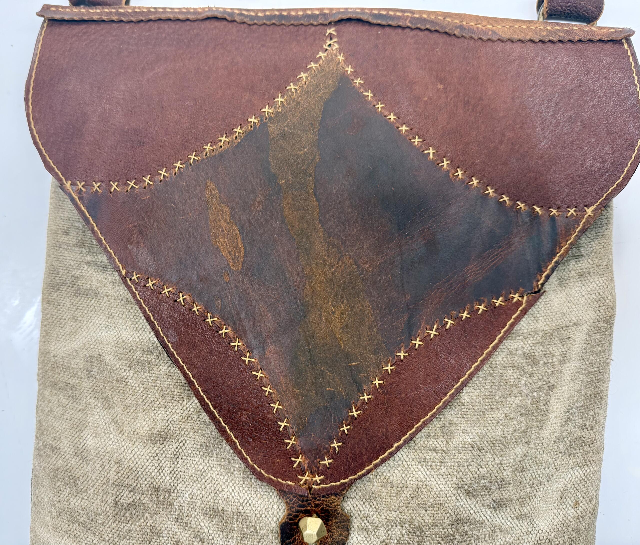 This bag is larger than my usual, measuring a generous 14” x 11½”. The front is waxed hemp bound in leather, with a leather welt at the seam for added structure and durability.
