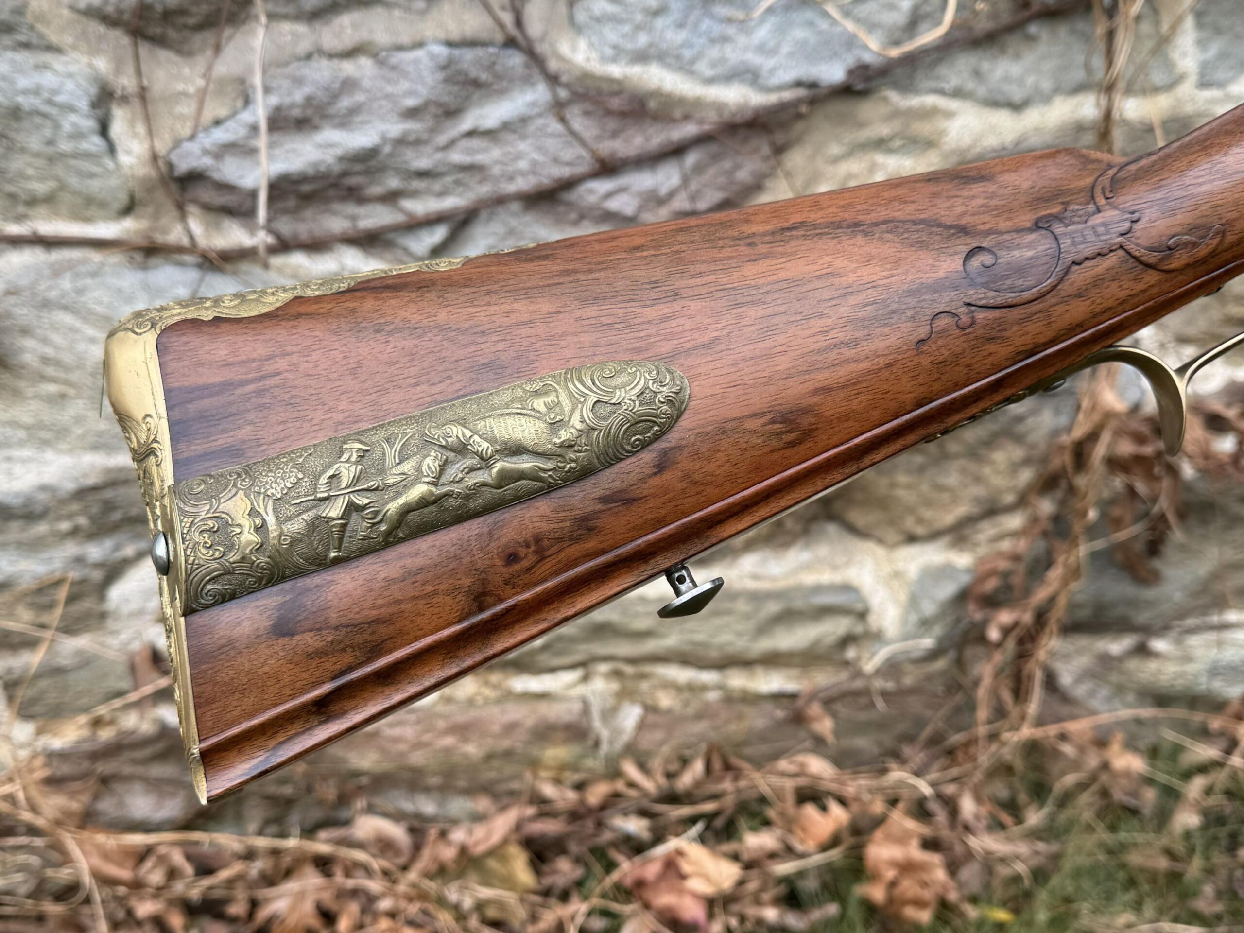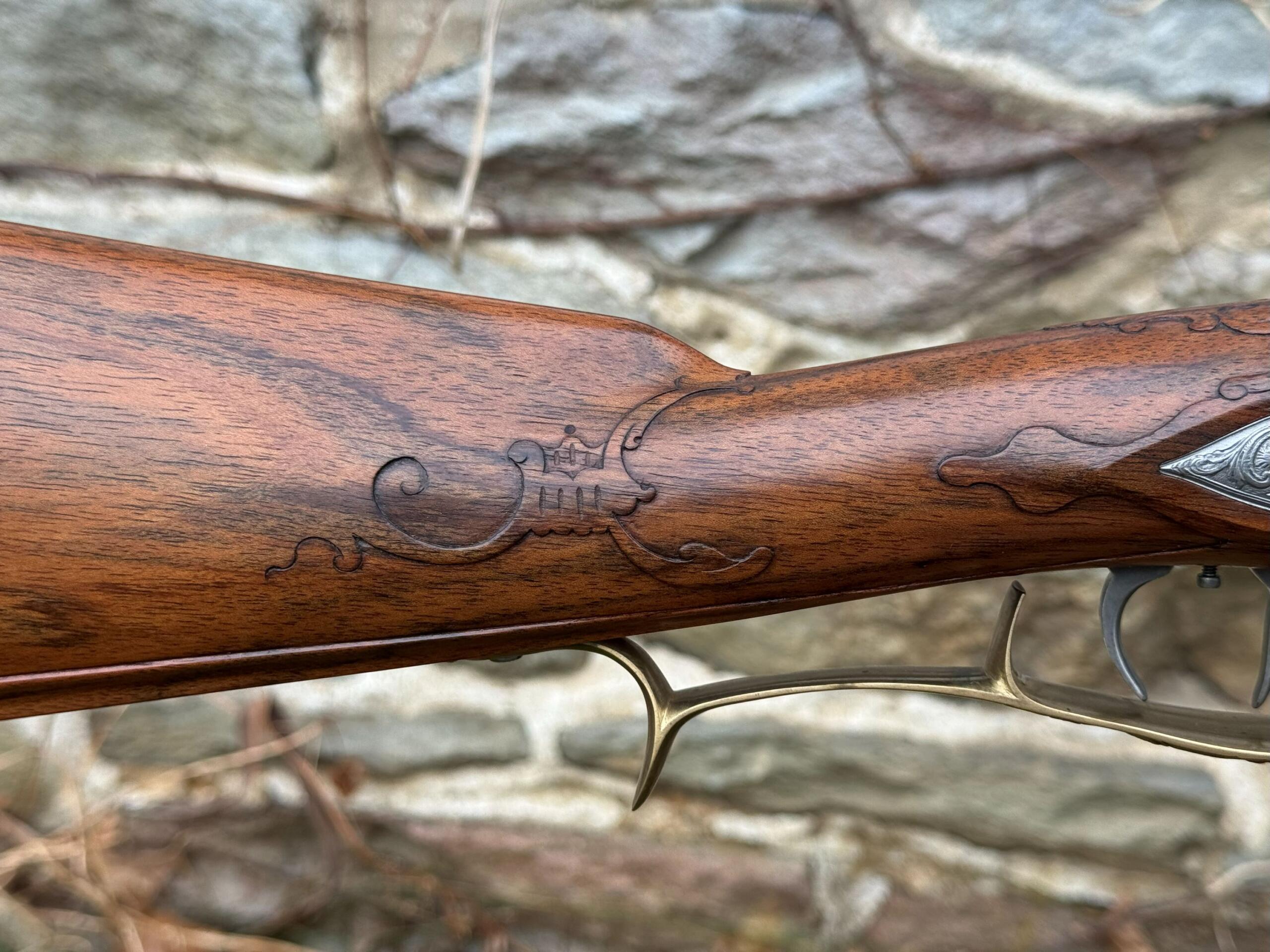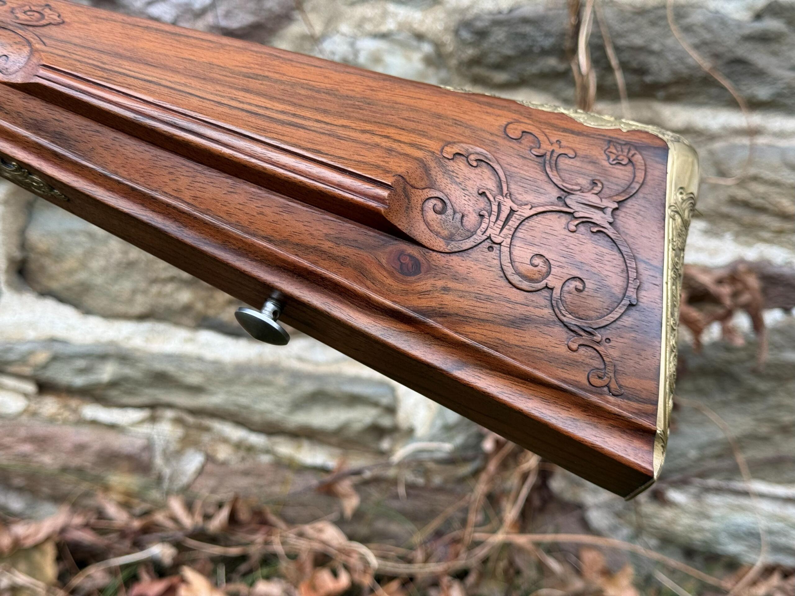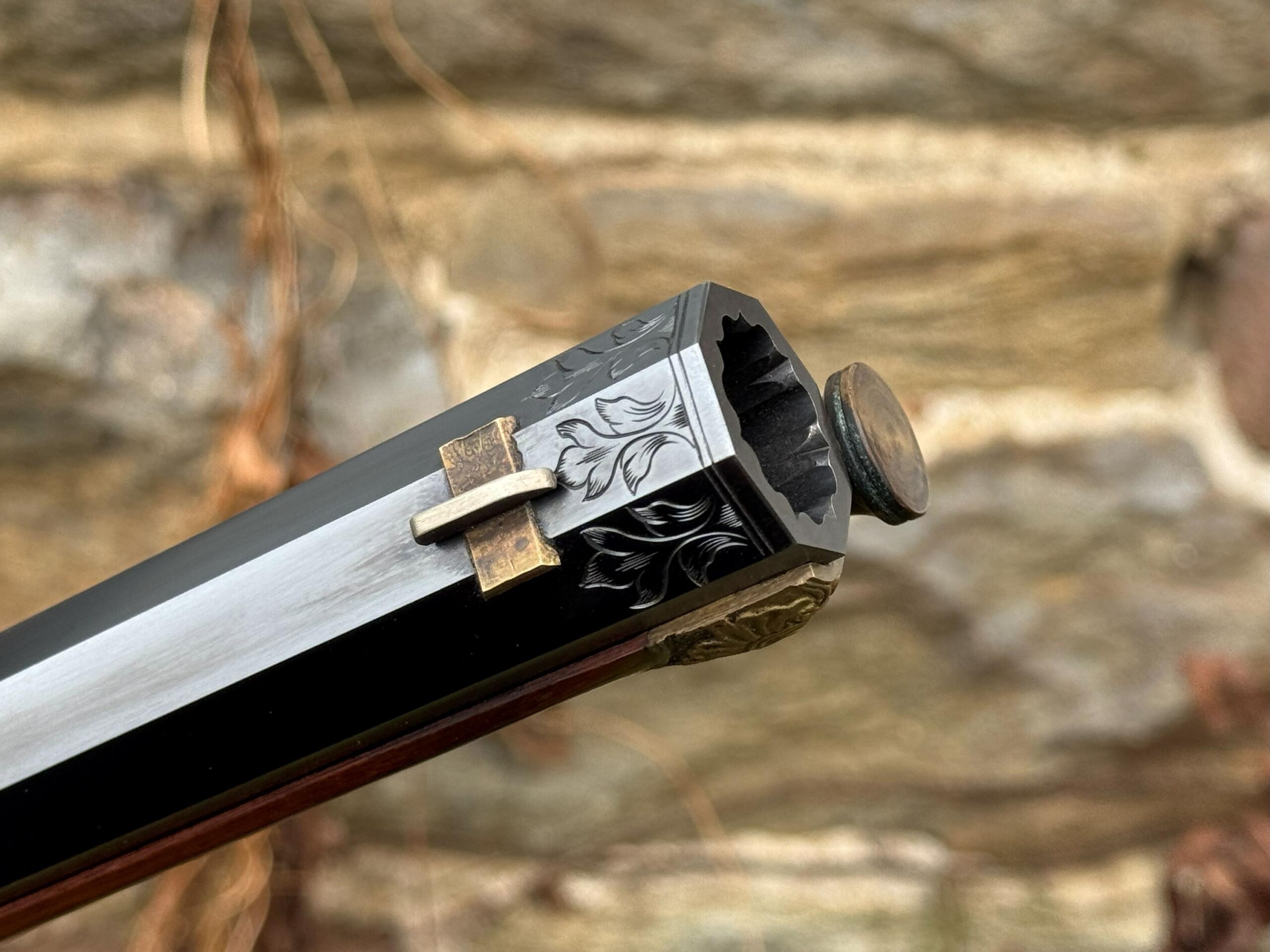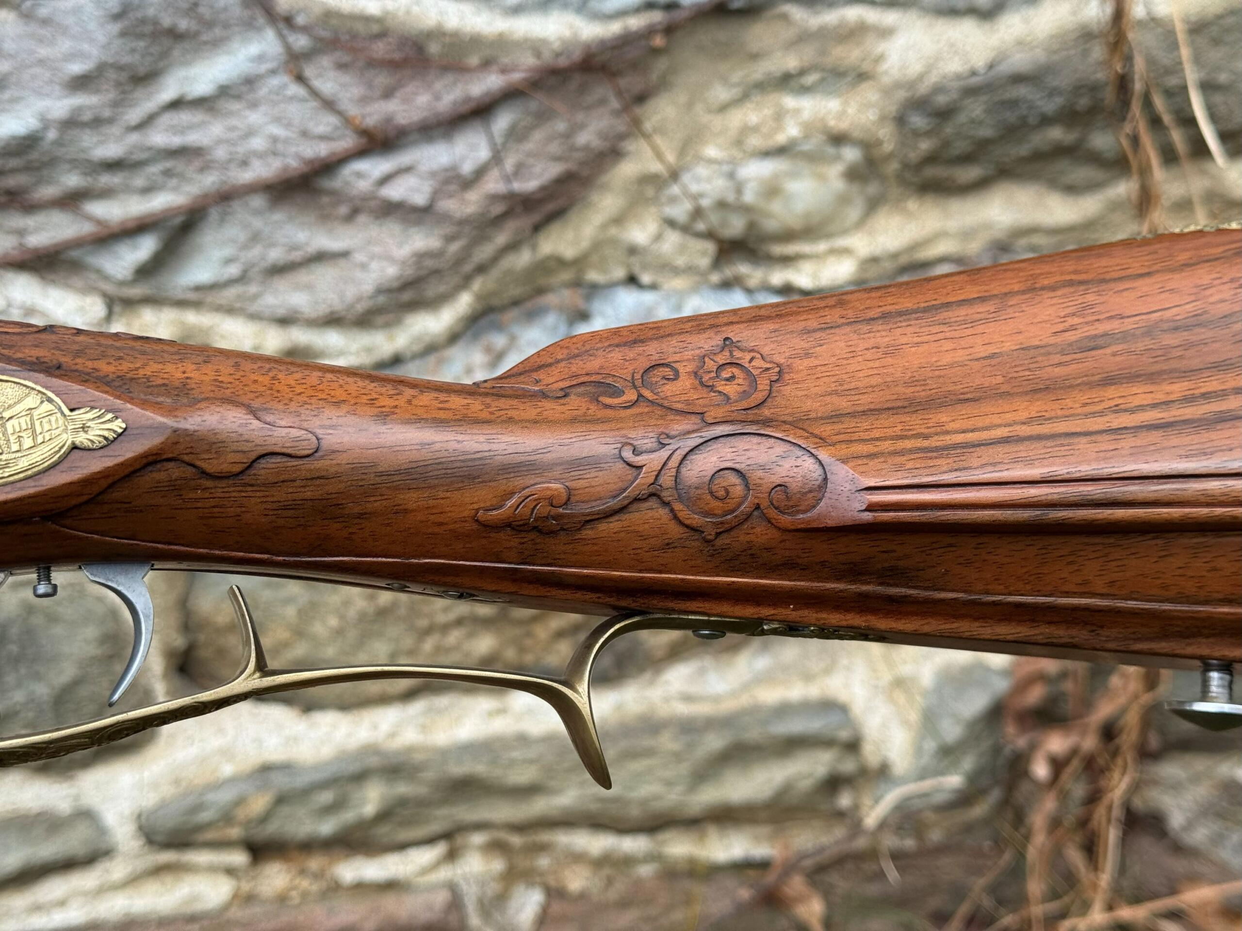 The barrel measures 32″ in length and features 7 groove round bottom rifling with a file decorated muzzle. The rifle measures 48″ in overall length and weighs in at 8lbs 3ozs.