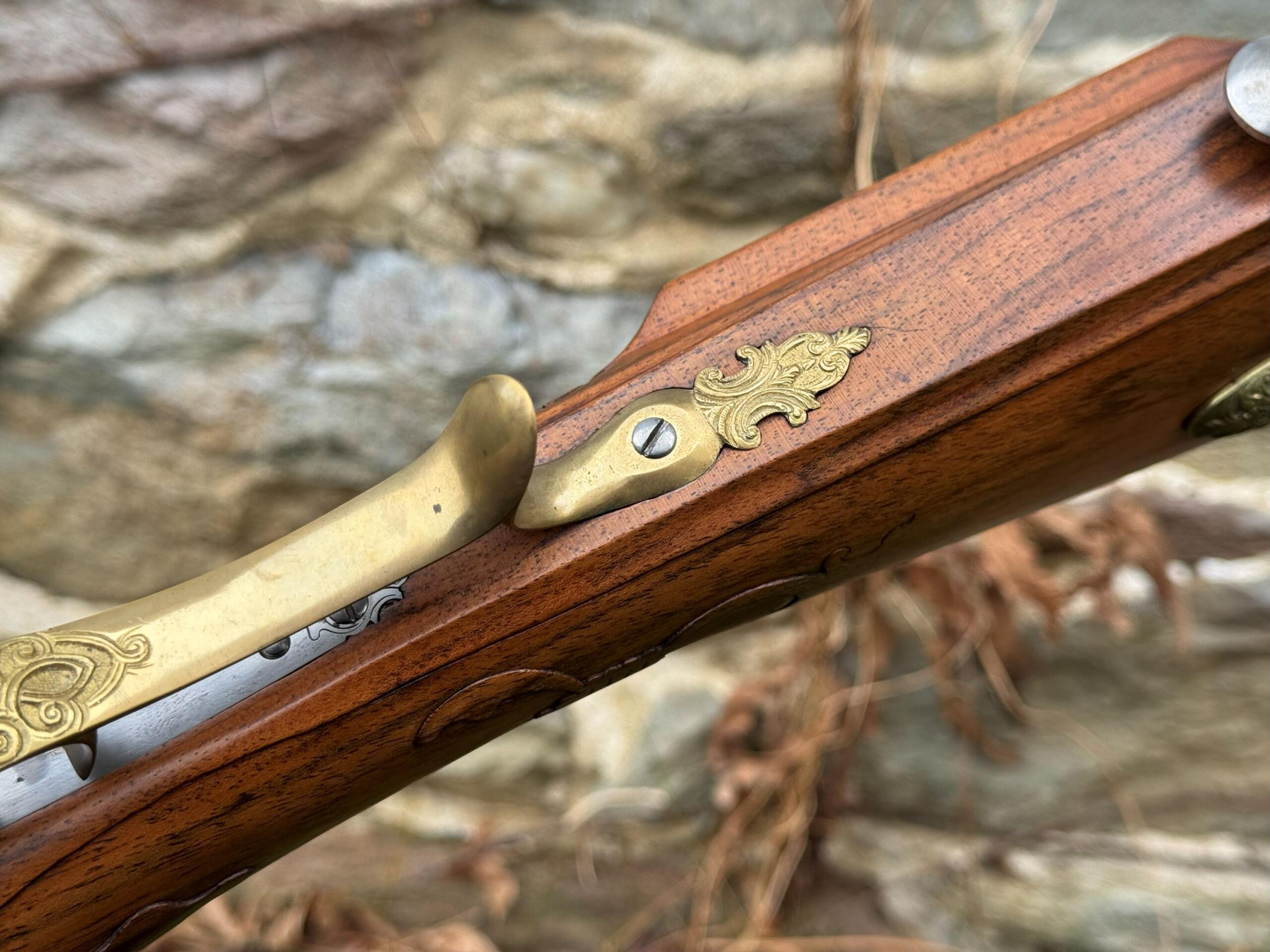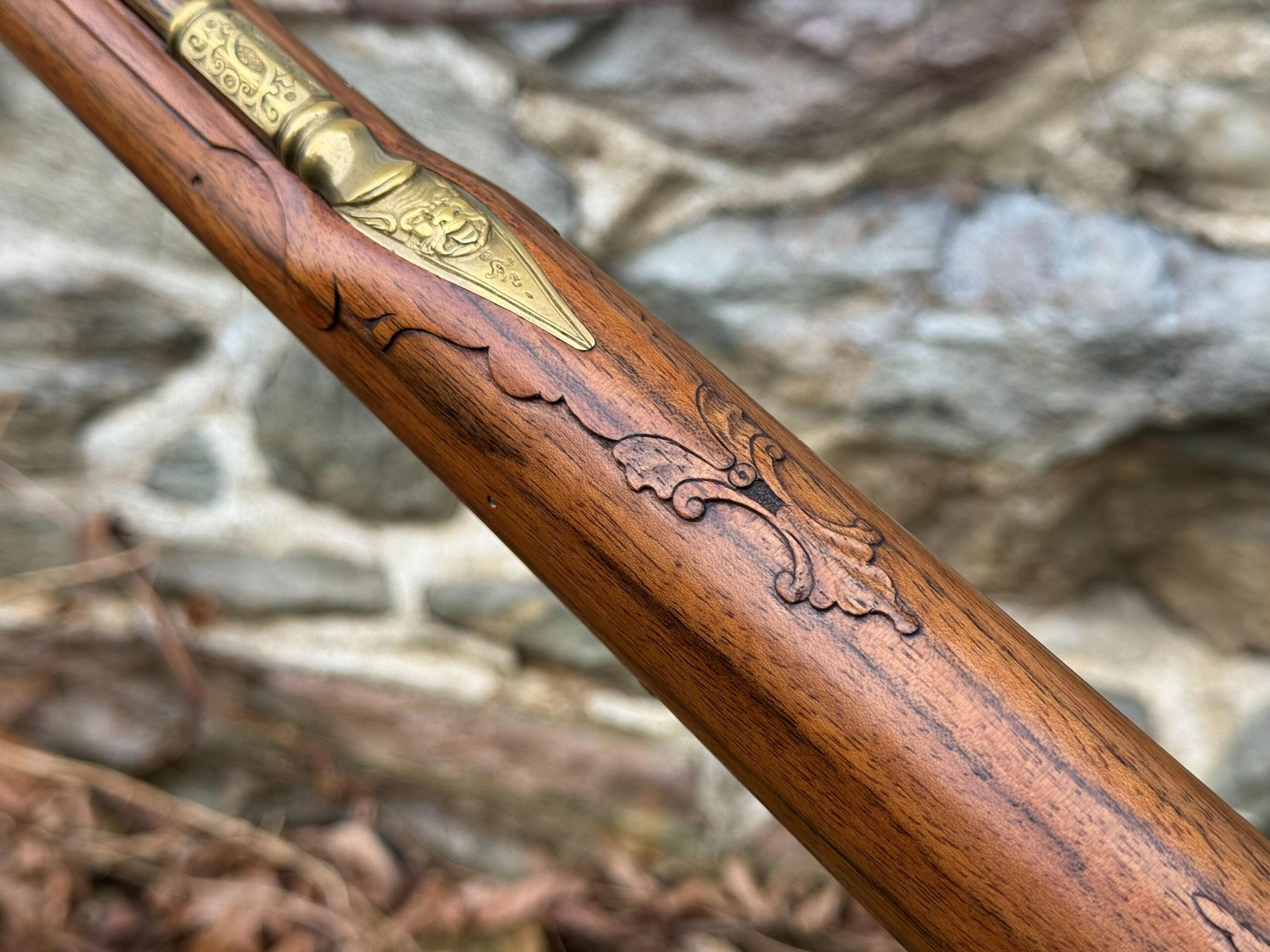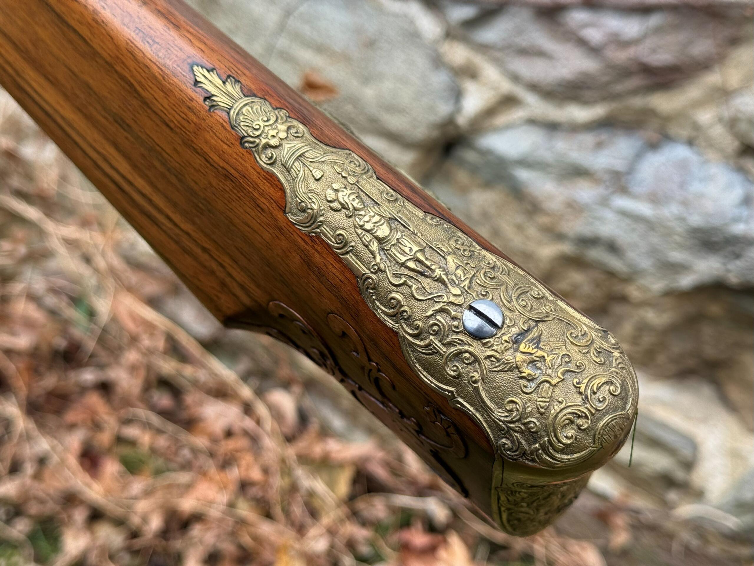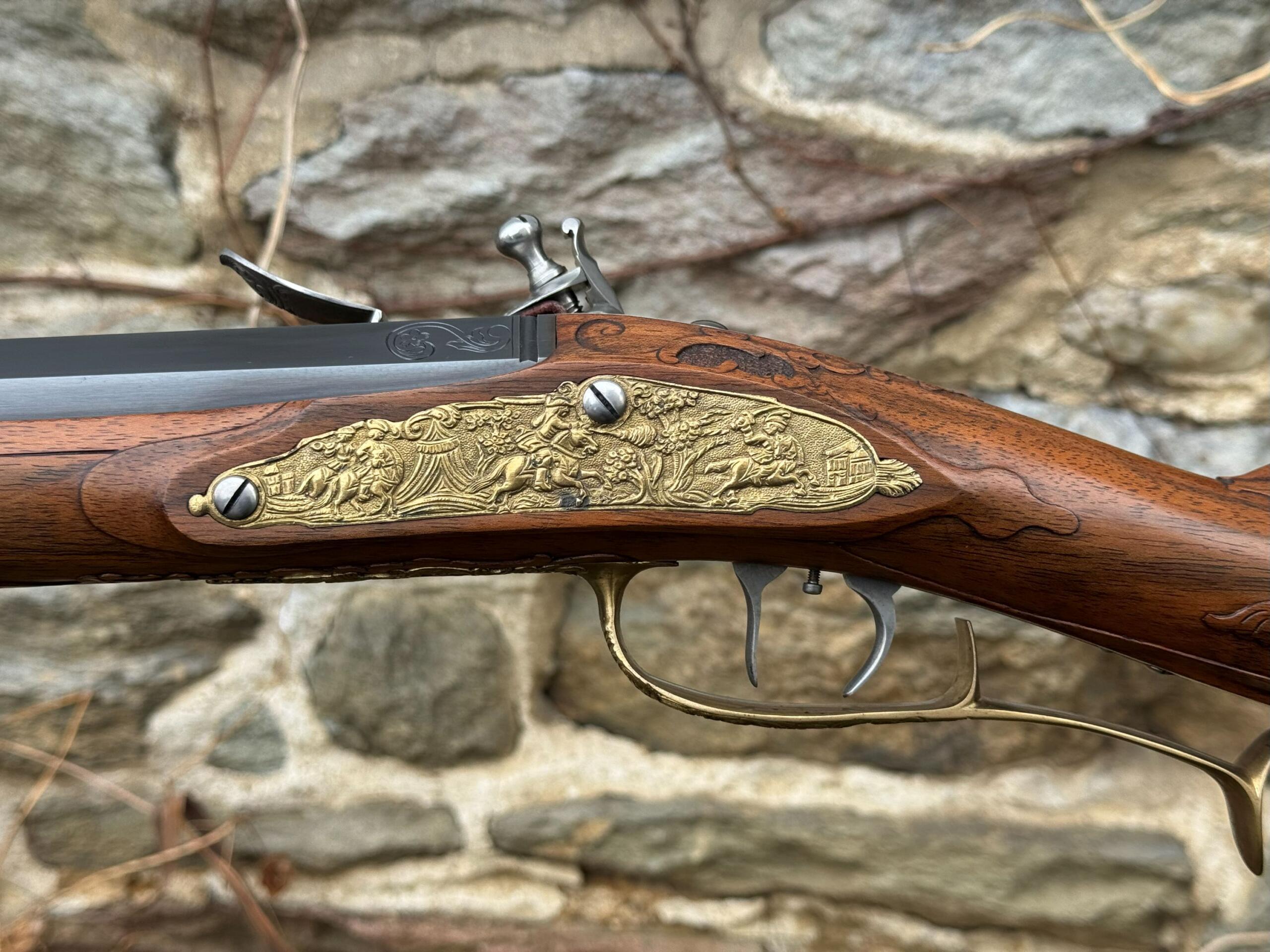 The barrel measures 32″ in length and features 7 groove round bottom rifling with a file decorated muzzle. The rifle measures 48″ in overall length and weighs in at 8lbs 3ozs.