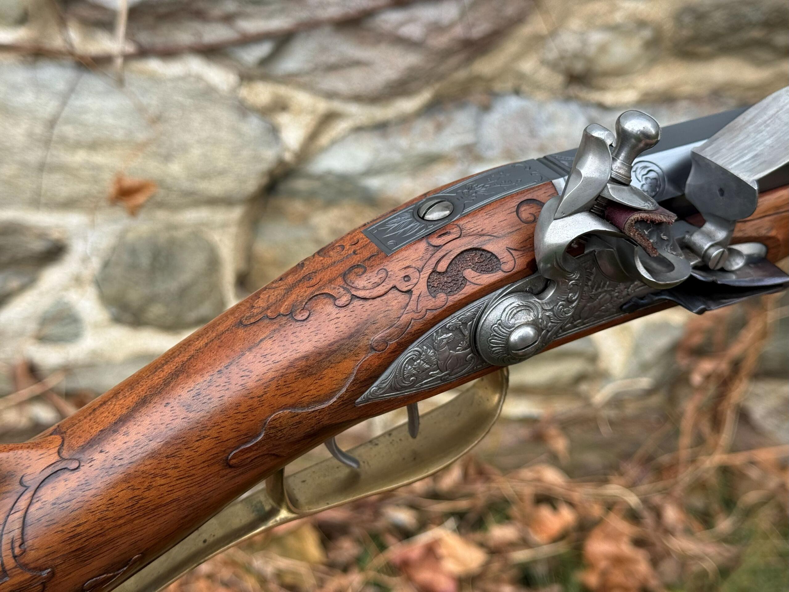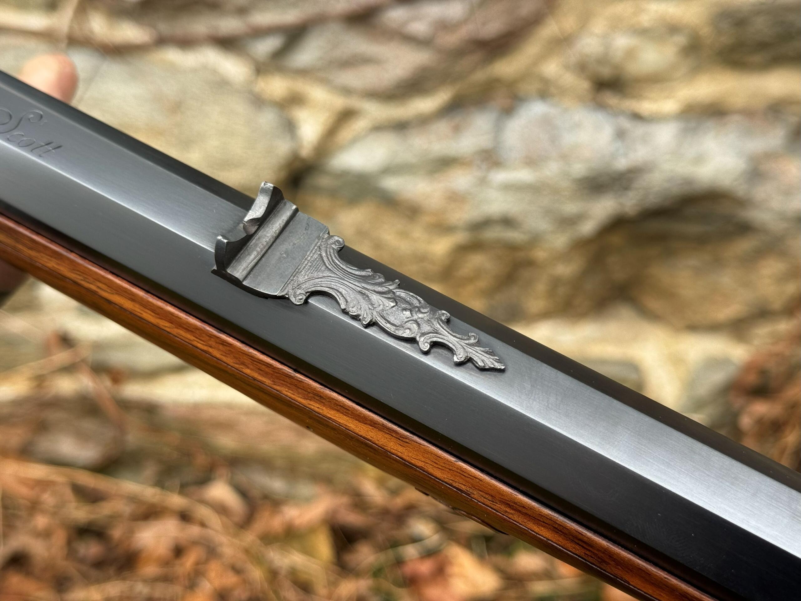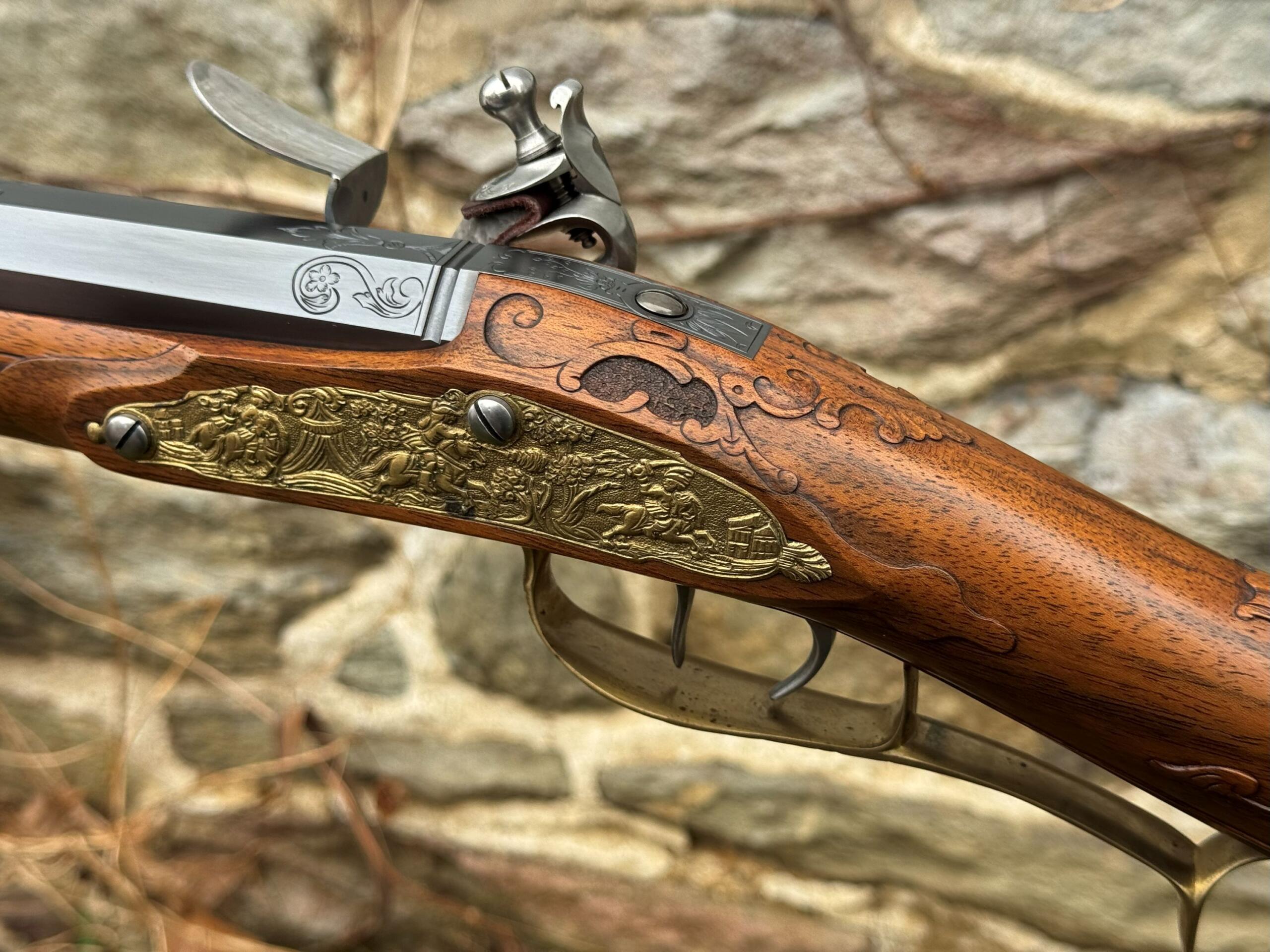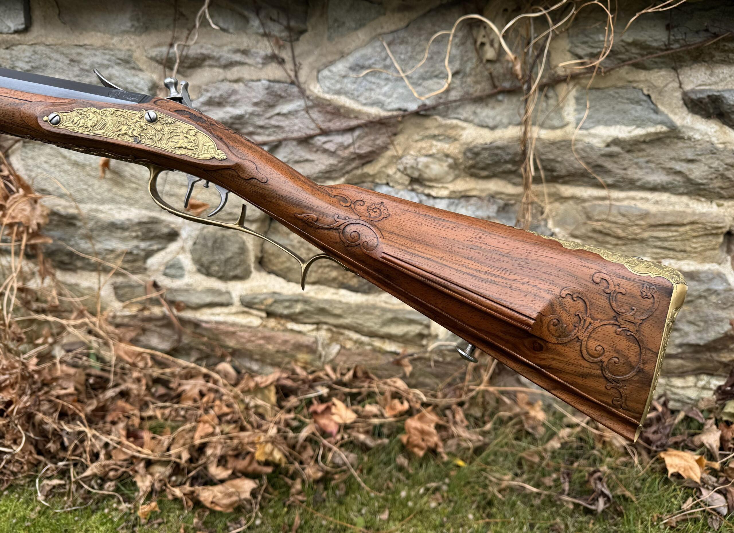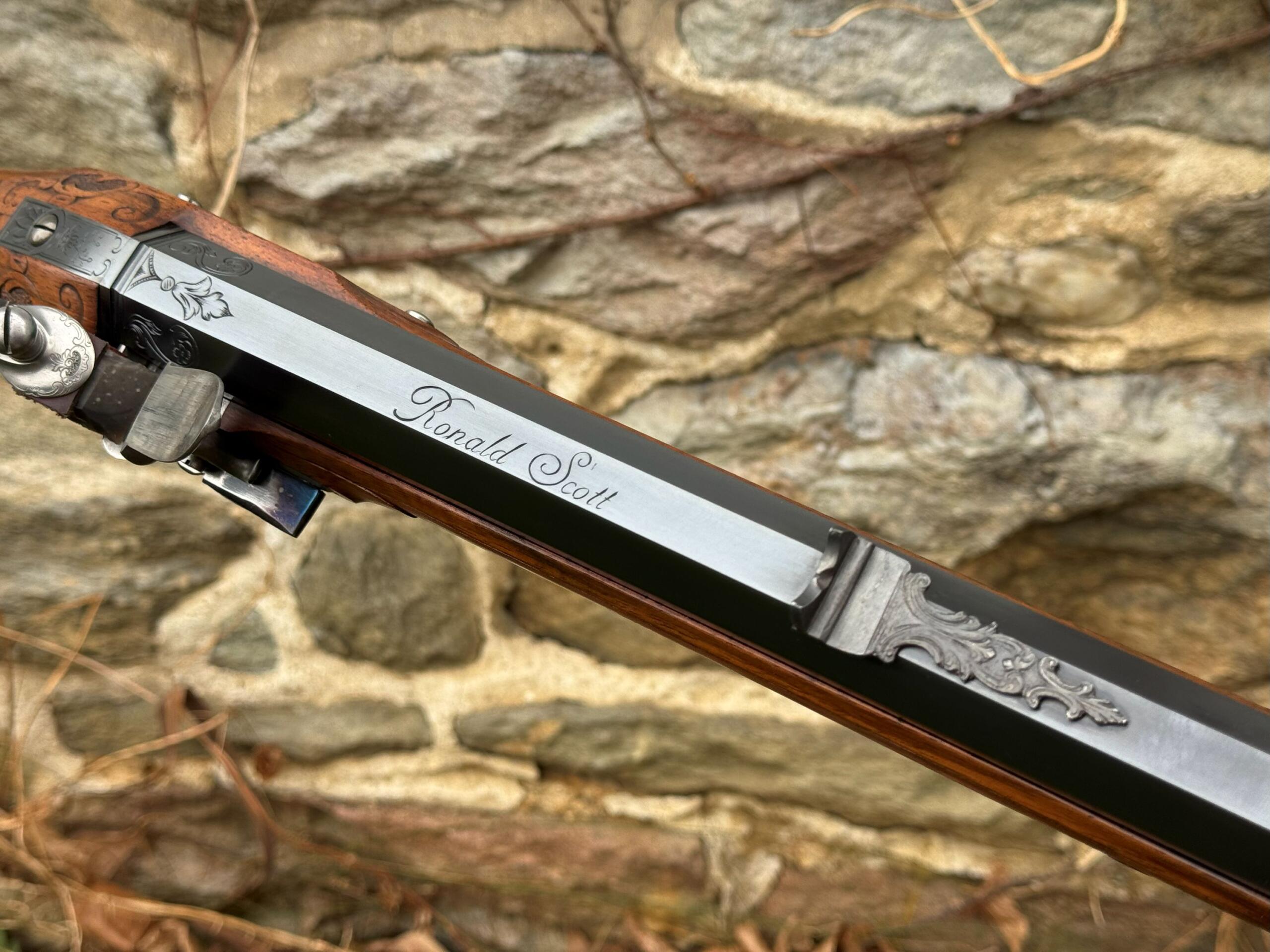 The barrel measures 32″ in length and features 7 groove round bottom rifling with a file decorated muzzle. The rifle measures 48″ in overall length and weighs in at 8lbs 3ozs.