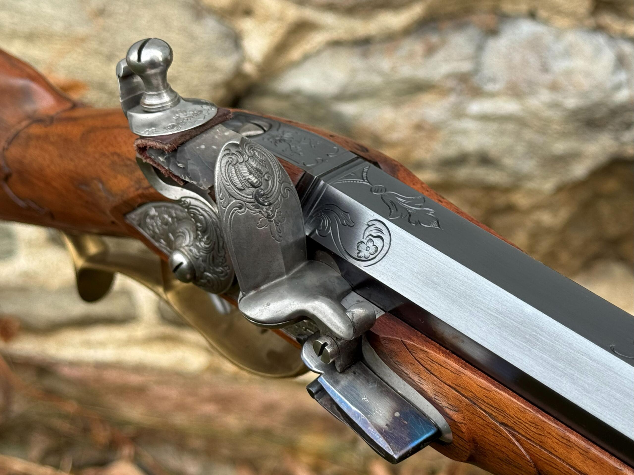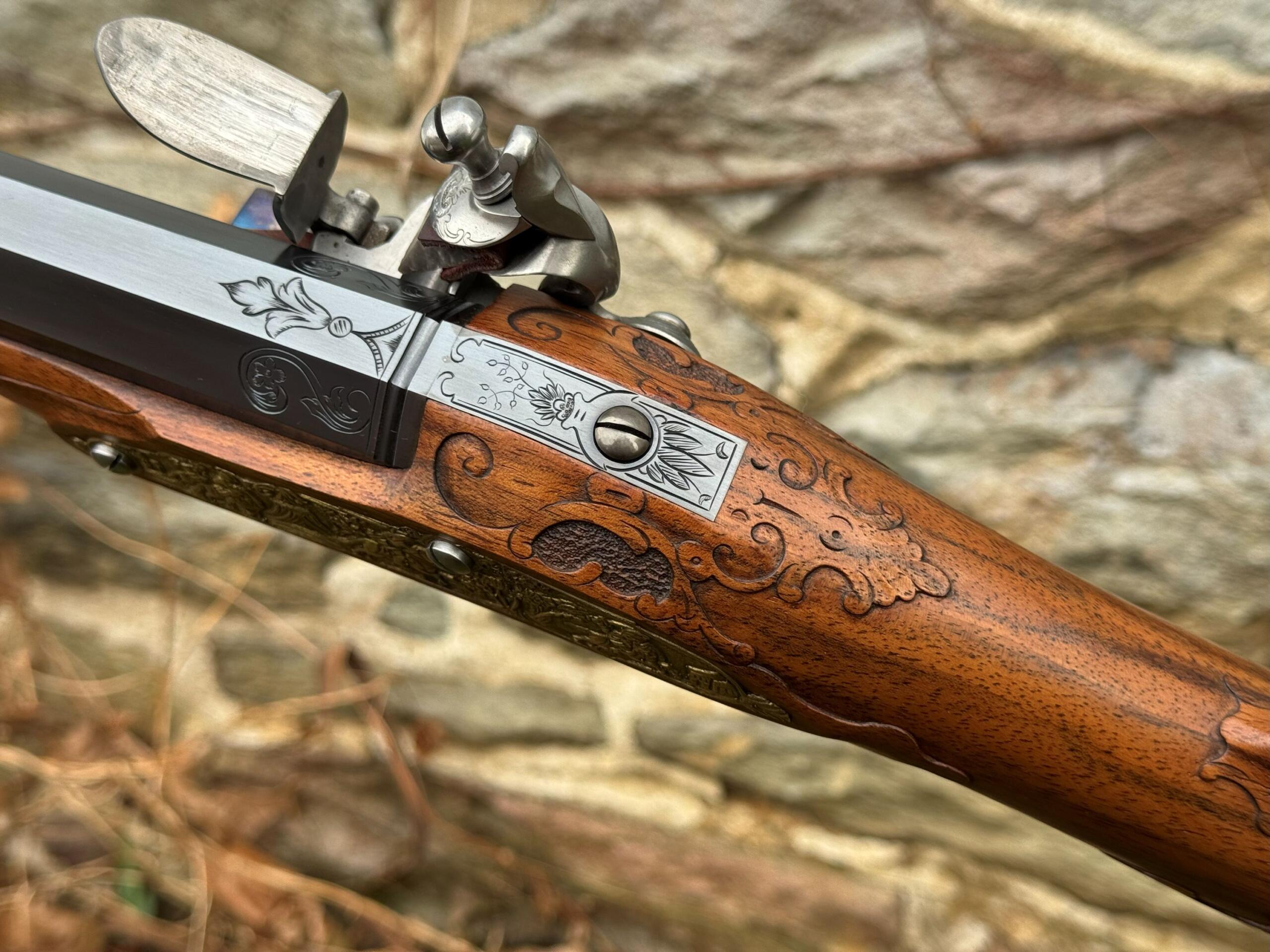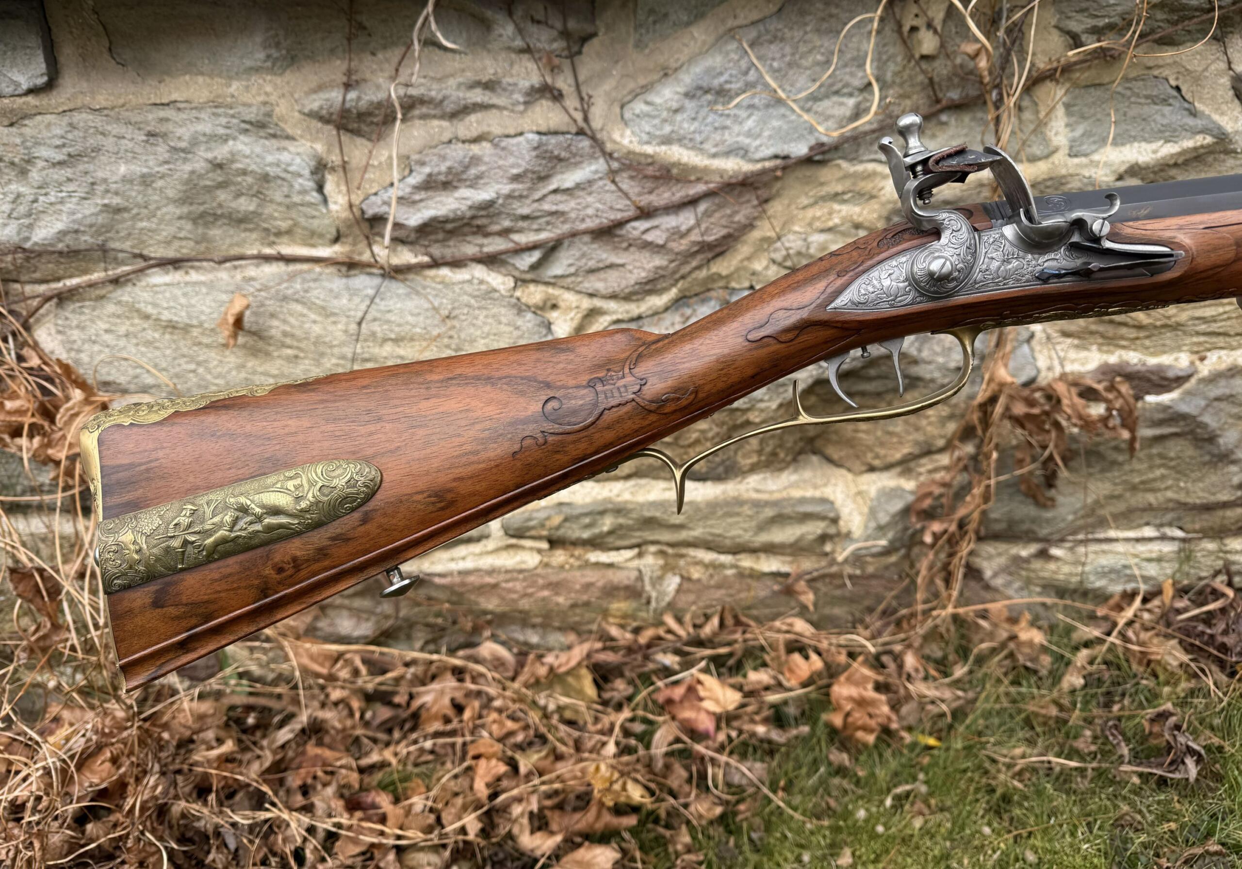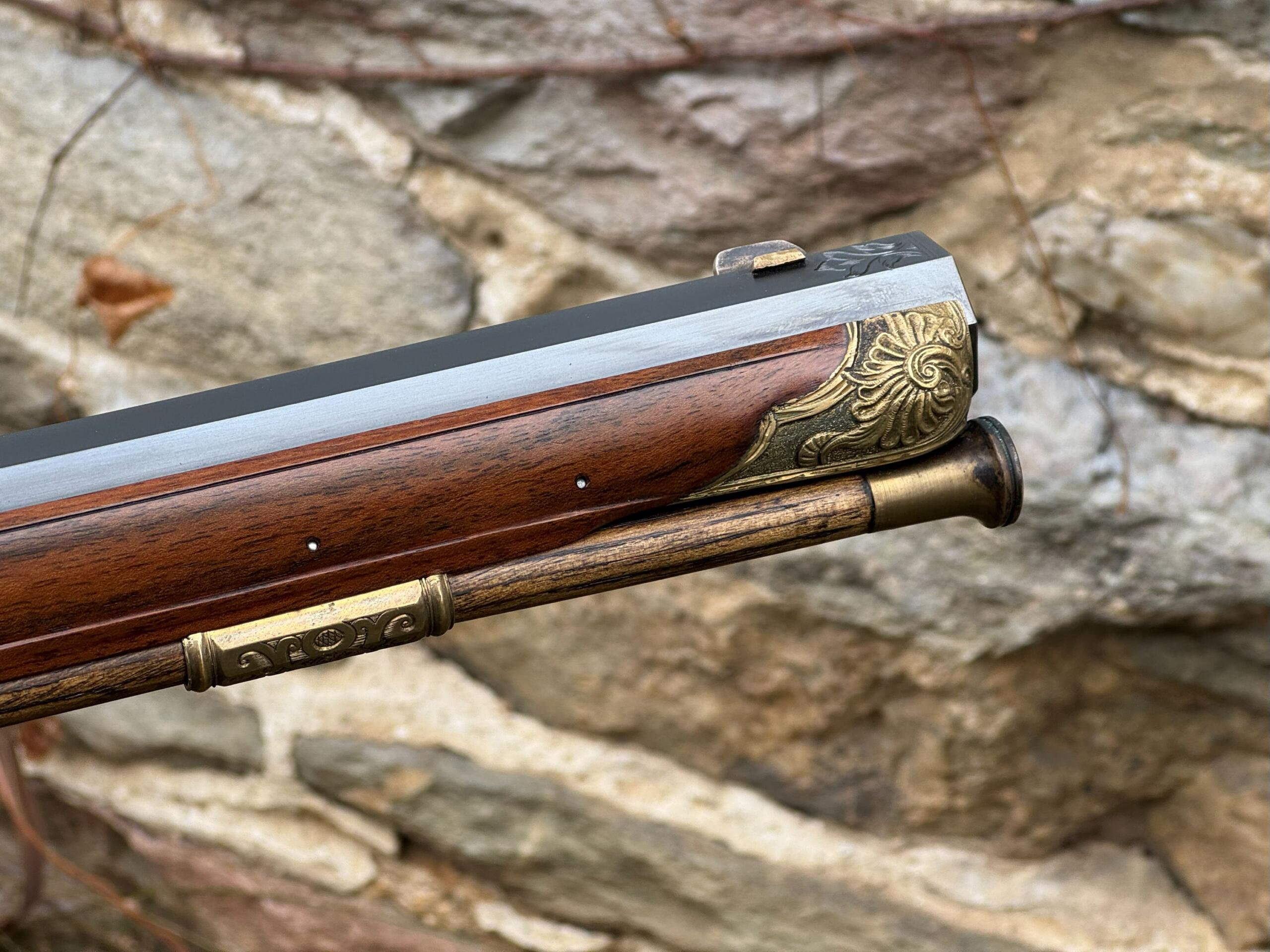The barrel measures 32″ in length and features 7 groove round bottom rifling with a file decorated muzzle. The rifle measures 48″ in overall length and weighs in at 8lbs 3ozs.