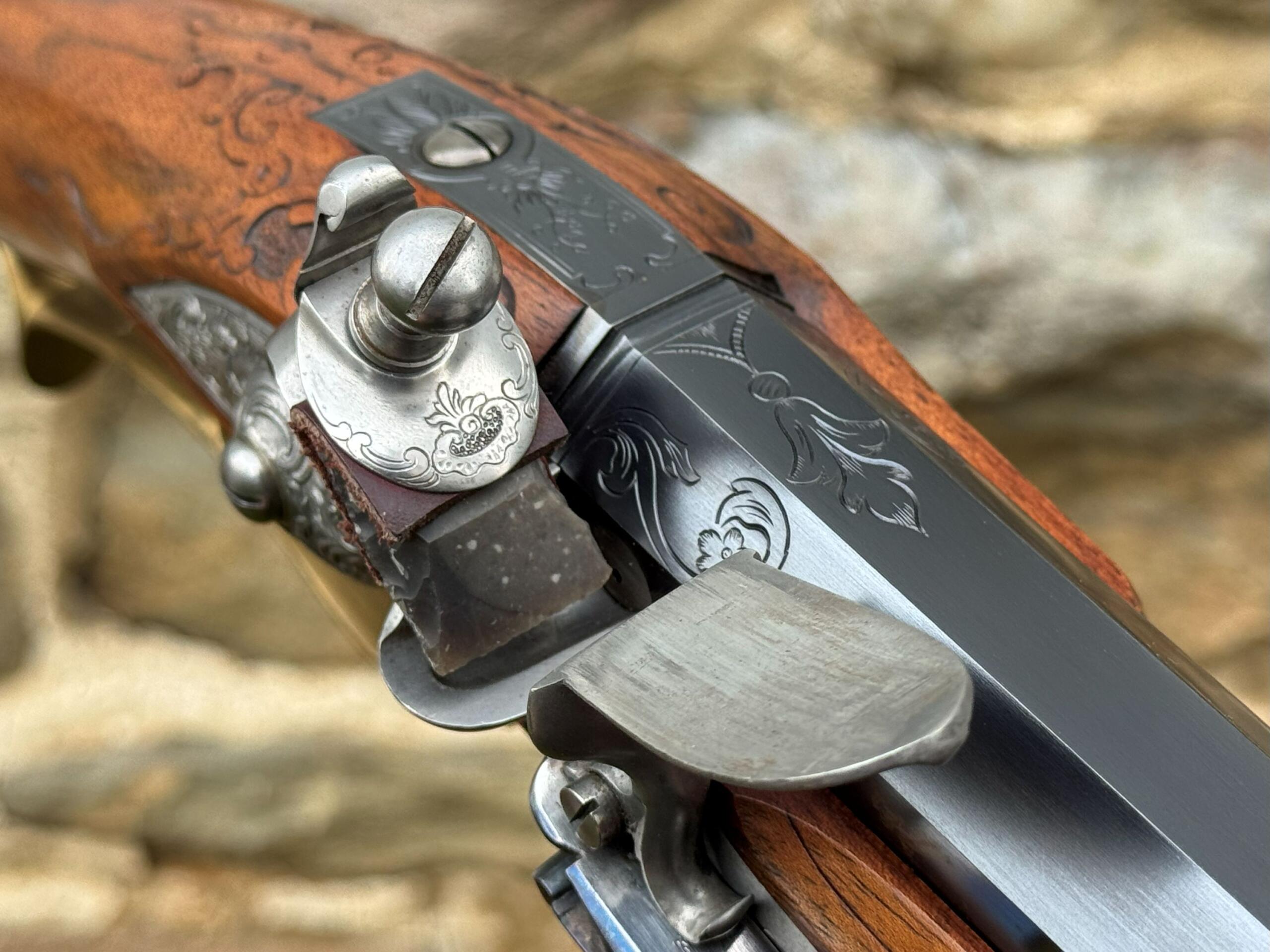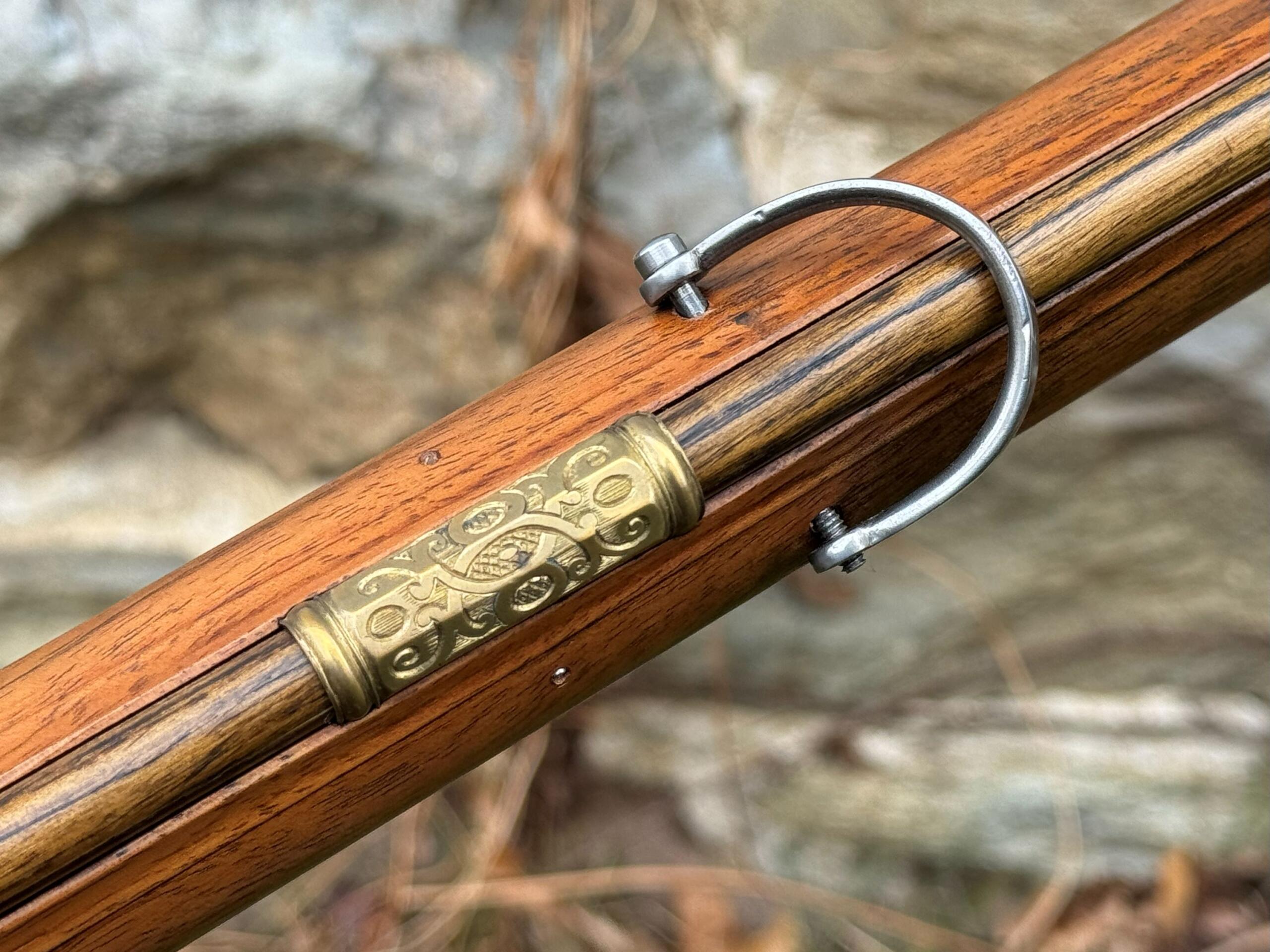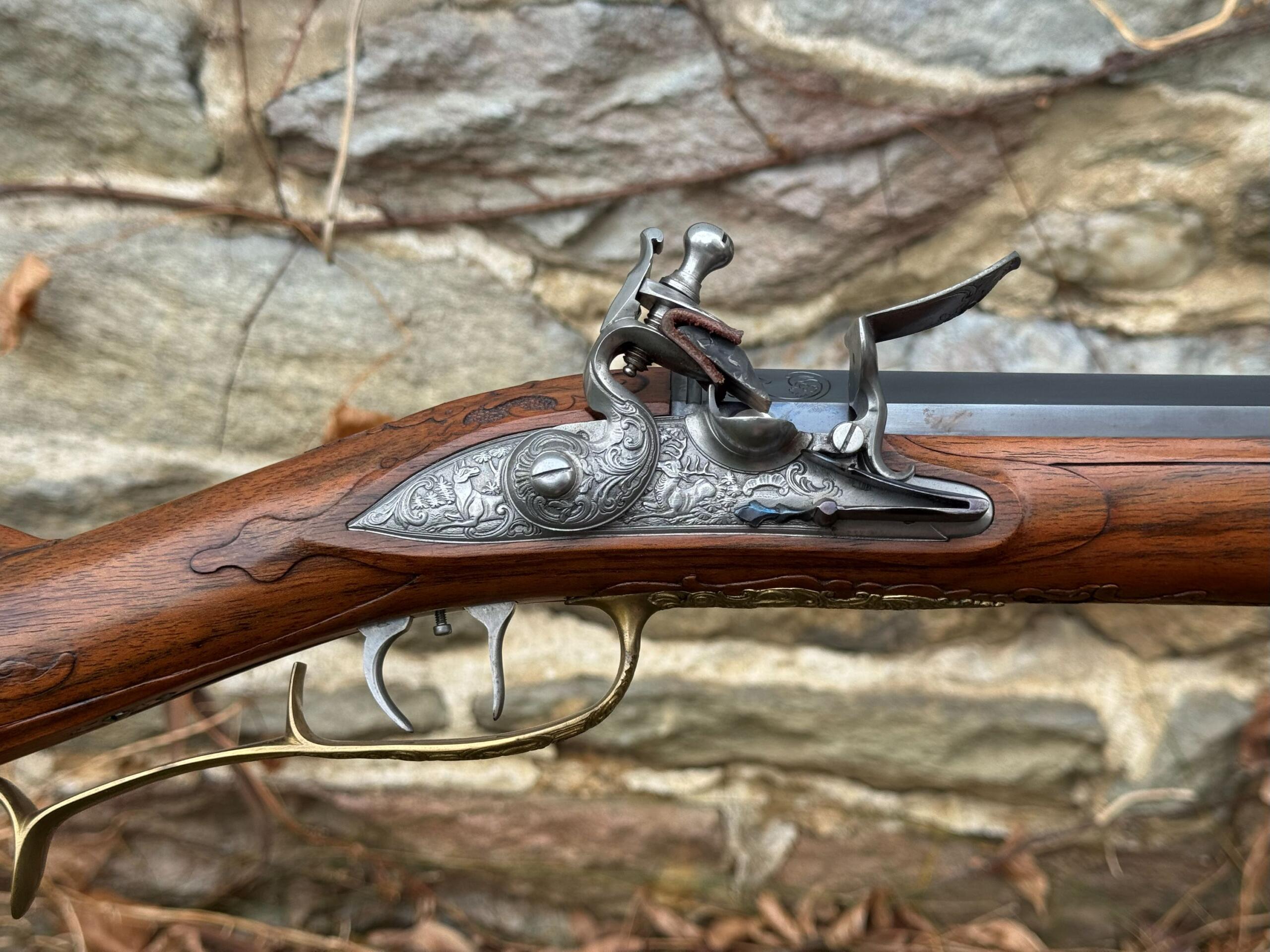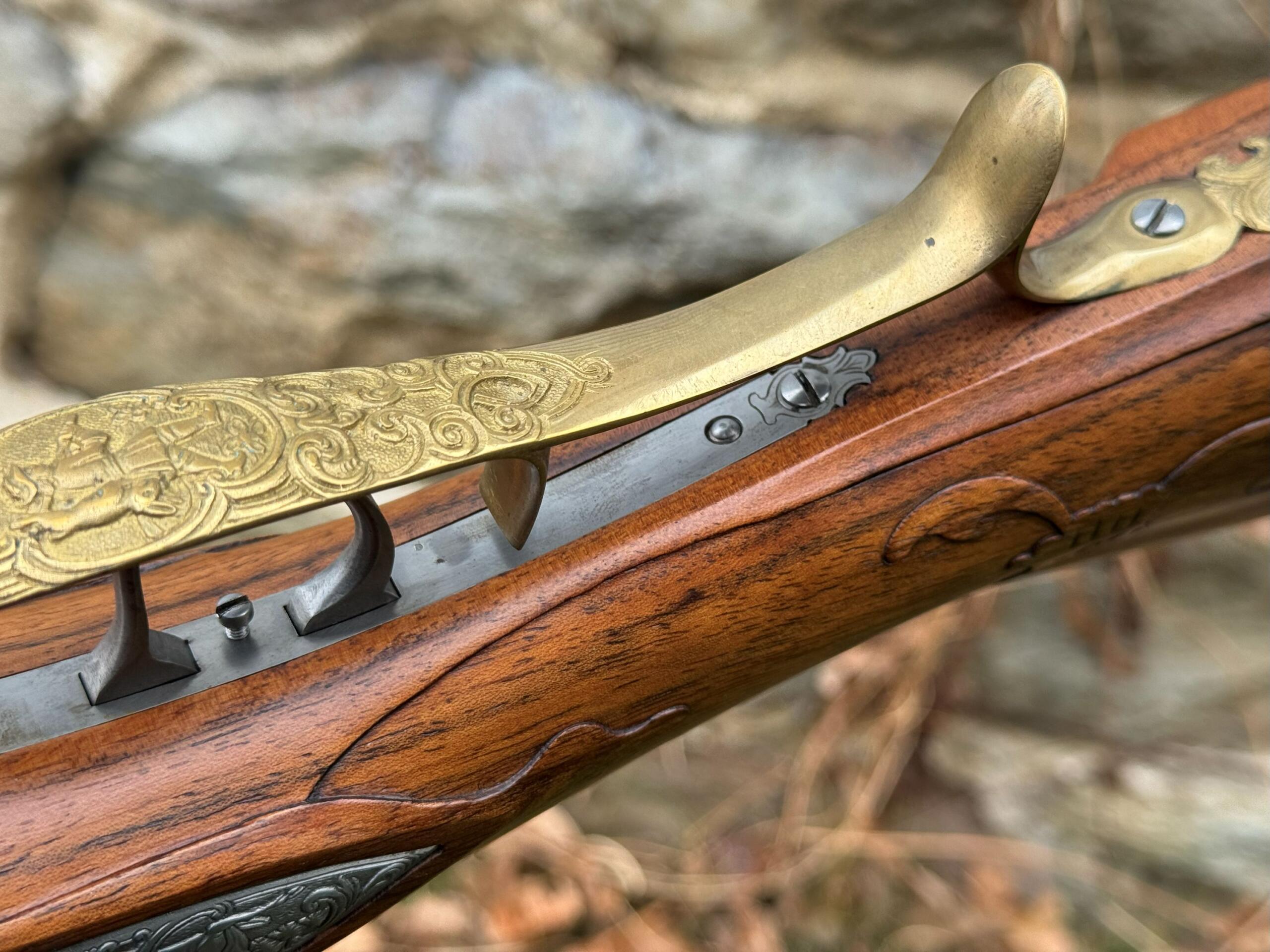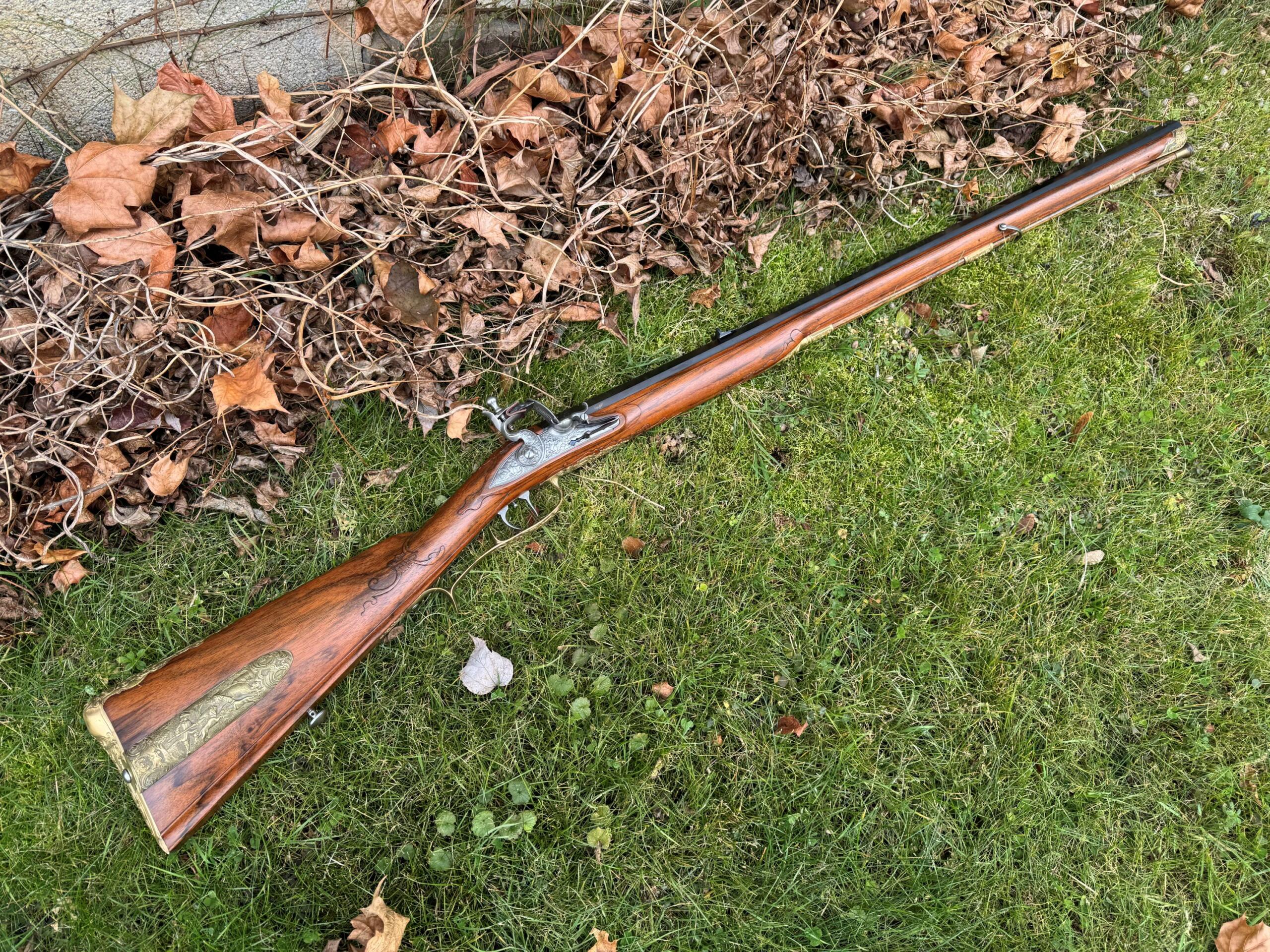 The barrel measures 32″ in length and features 7 groove round bottom rifling with a file decorated muzzle. The rifle measures 48″ in overall length and weighs in at 8lbs 3ozs.