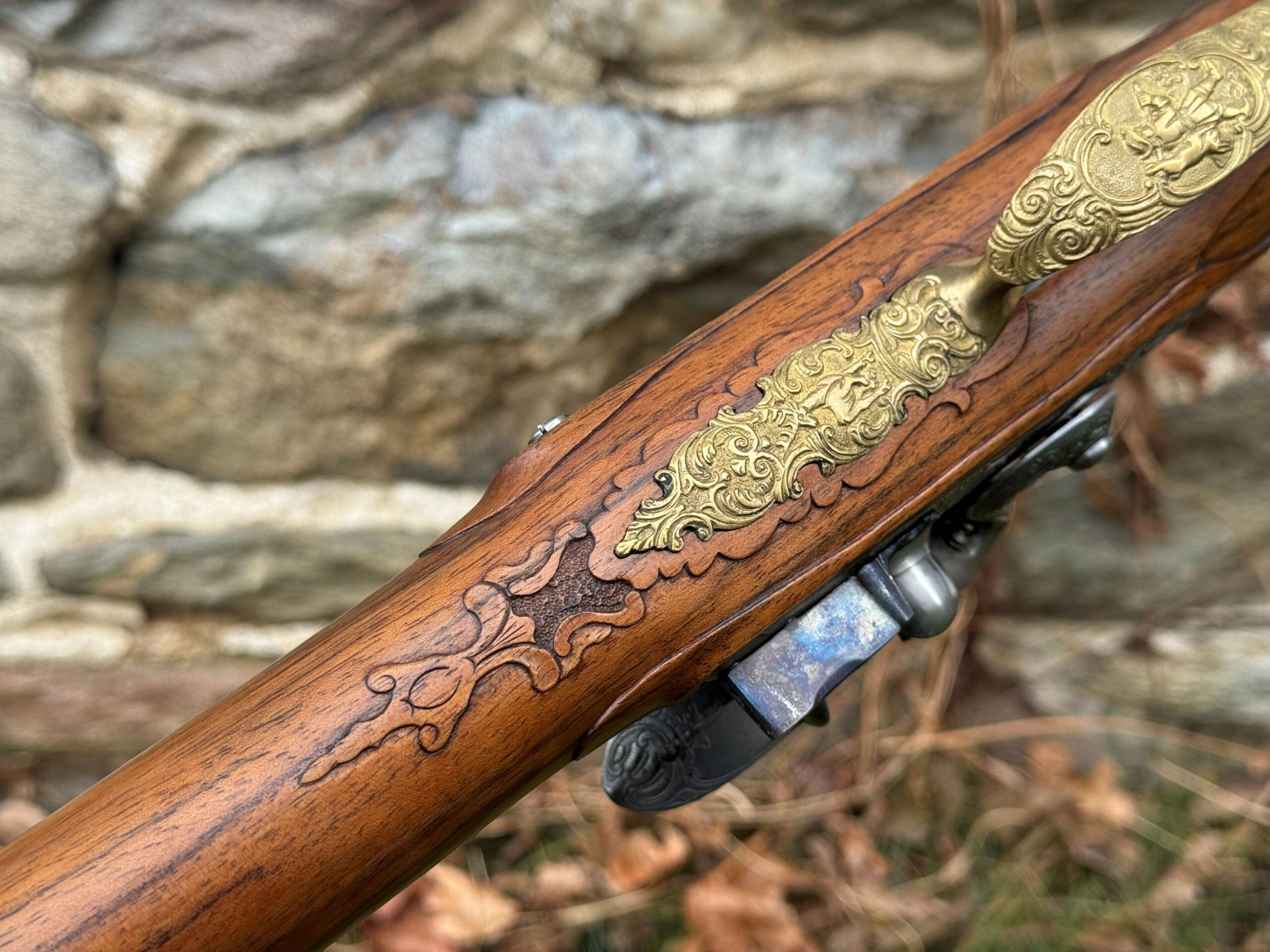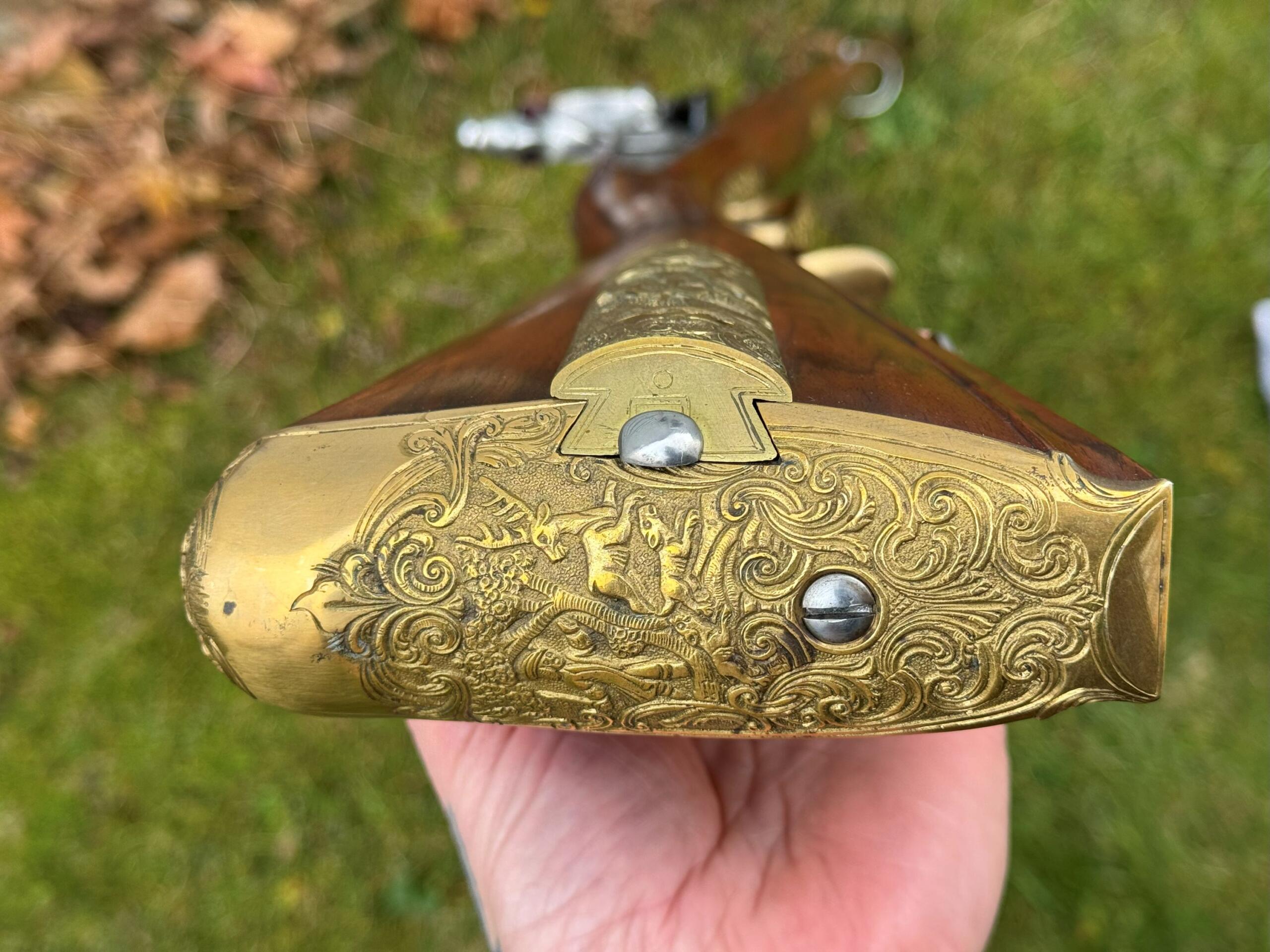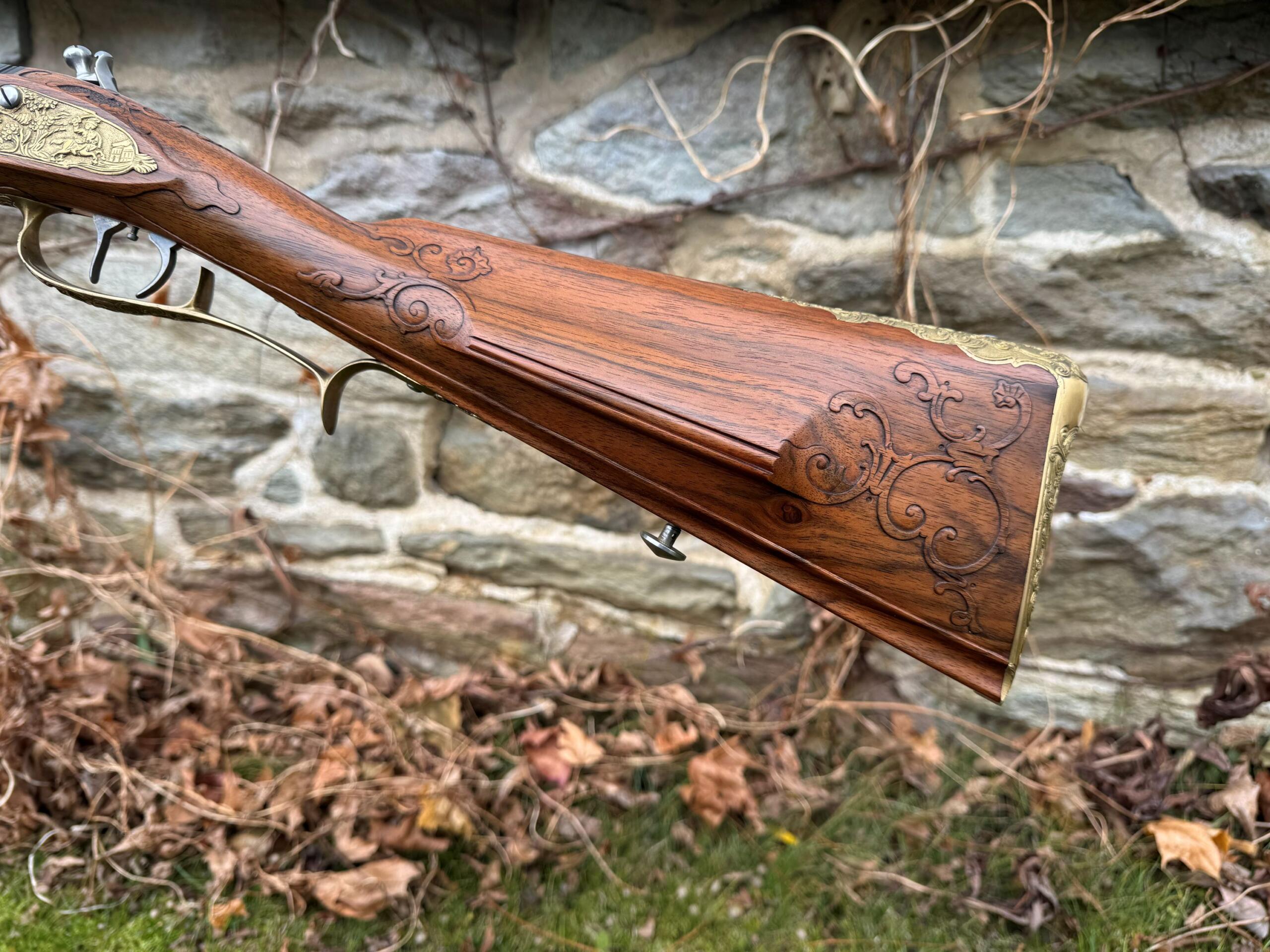 Here we have a beautiful .75 caliber, custom built German Jaeger by Ron Scott. There was no detail left out on this build as you can see by the photos, it is a fully decorated example that features deep relief brass mounts, hand chiseled relief and incised carvings on the European Walnut stock, and hand engraved motifs throughout all surfaces. This is an extremely fine example of one of Rons German rifles, and it remains in brand new unfired condition as it has been stored away in a private collection.