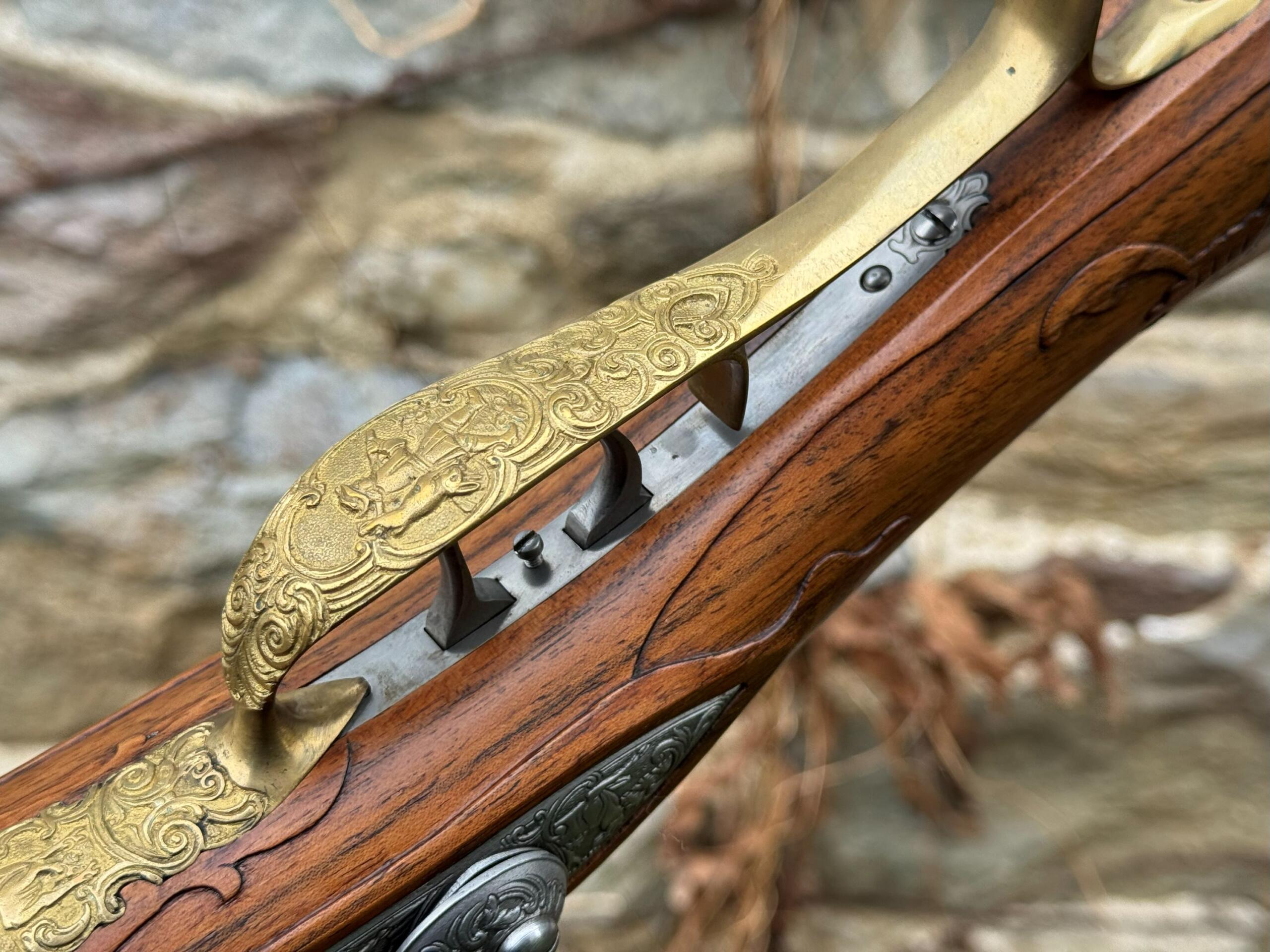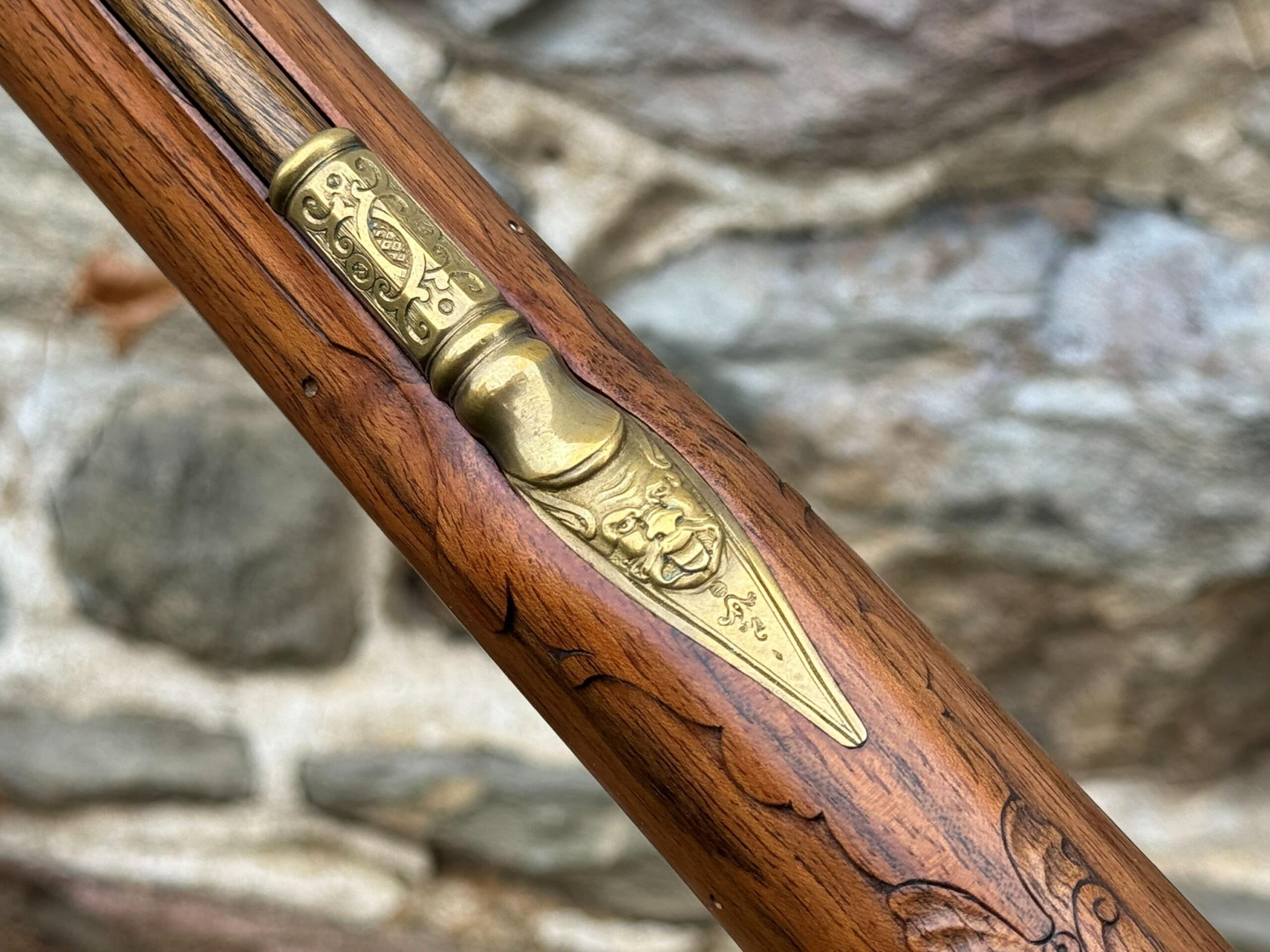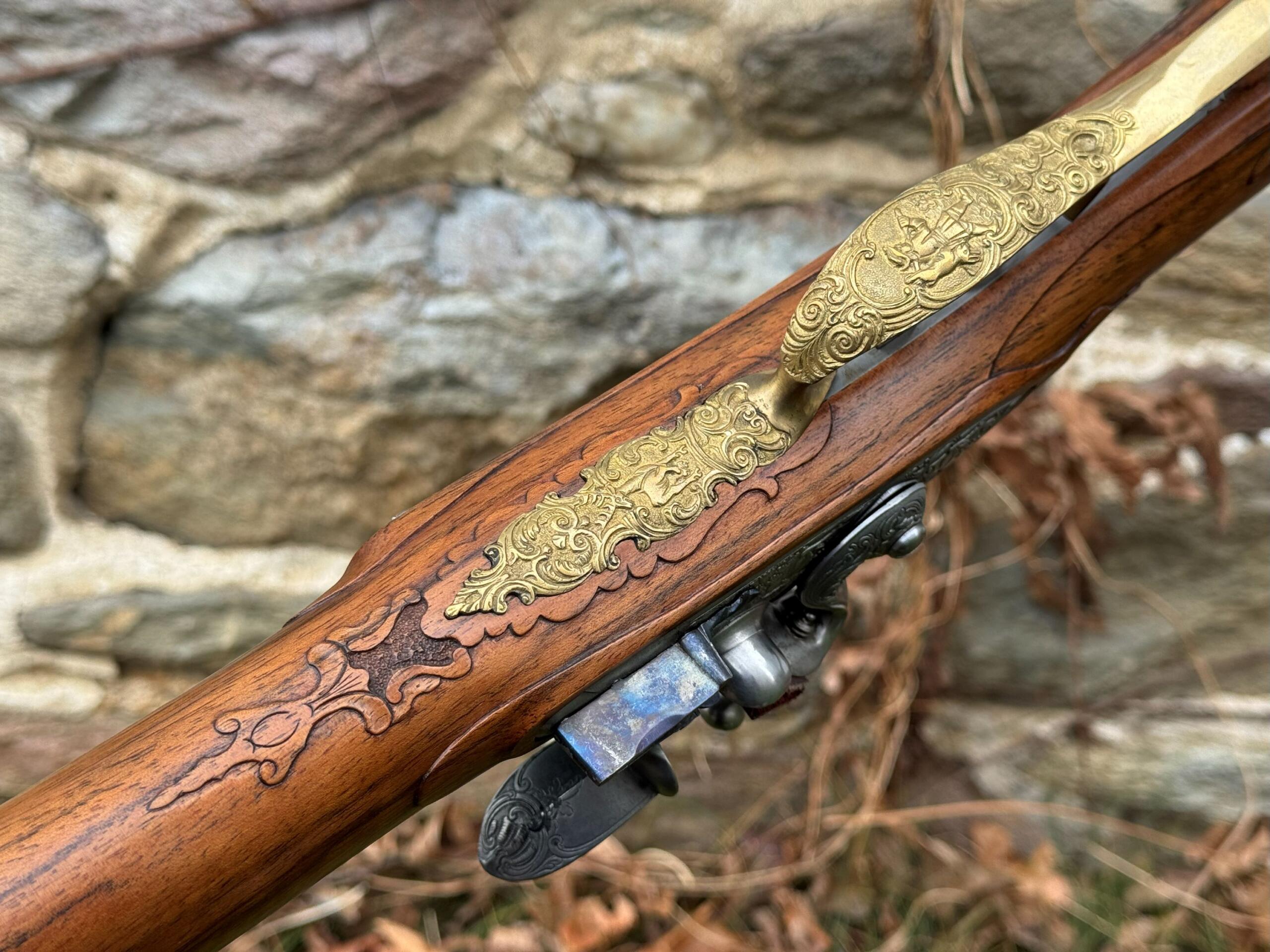 Here we have a beautiful .75 caliber, custom built German Jaeger by Ron Scott. There was no detail left out on this build as you can see by the photos, it is a fully decorated example that features deep relief brass mounts, hand chiseled relief and incised carvings on the European Walnut stock, and hand engraved motifs throughout all surfaces. This is an extremely fine example of one of Rons German rifles, and it remains in brand new unfired condition as it has been stored away in a private collection.