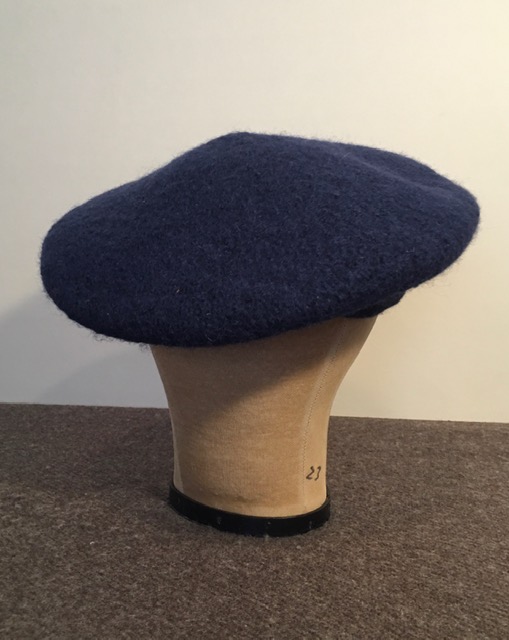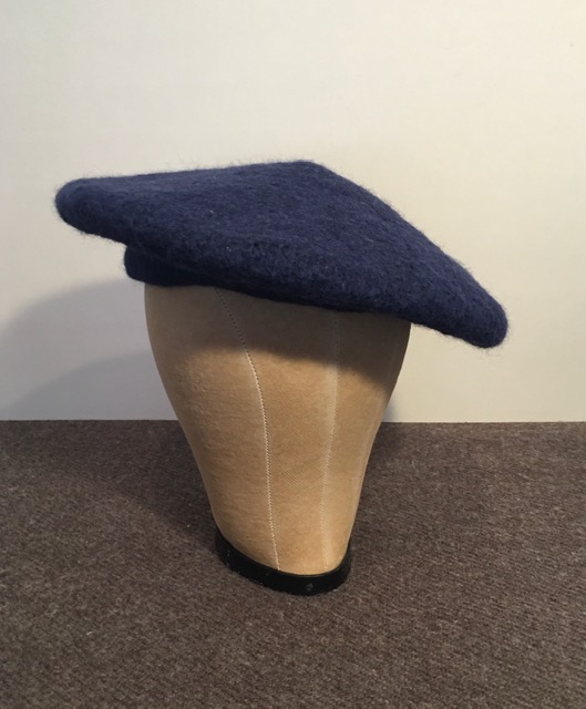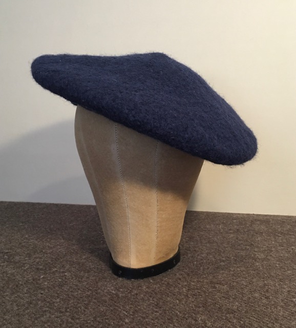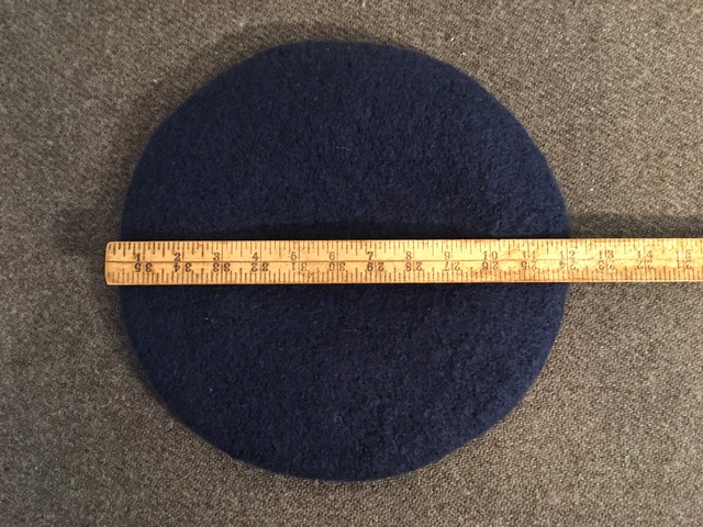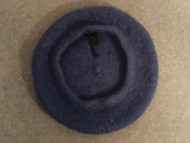 For sale is this Scots Bonnet hand knitted and fulled by Gloria Holmes. It is in excellent condition having been work to only a couple of events and never “in weather”. It could be termed a “Broad Bonnet” as it has a 12″ crown. The color is in a darker blue shade, almost “navy”. It was made to fit a 7 5/8″ hat size and it fits me snugly and with the drawstring in the band can be made to fit somewhat smaller.