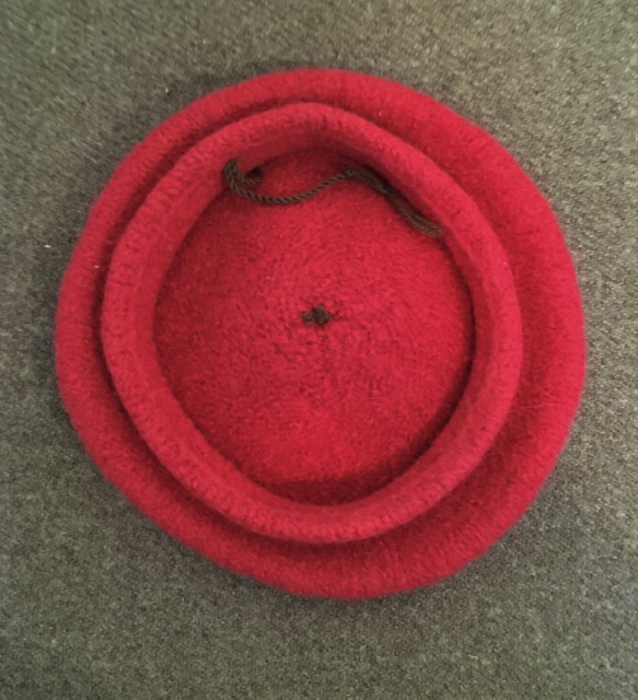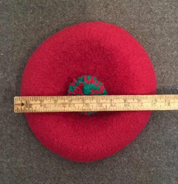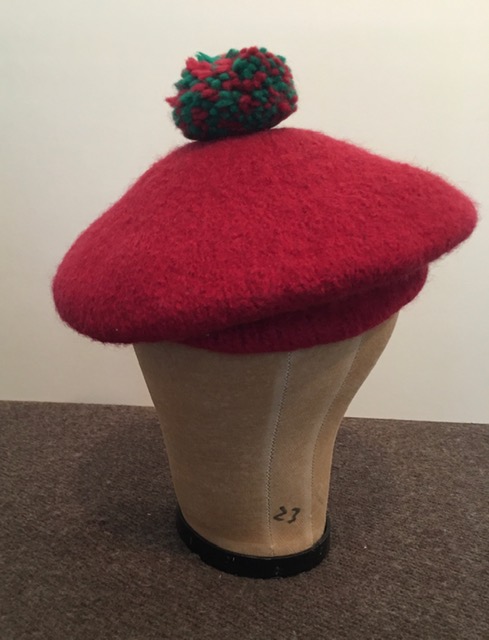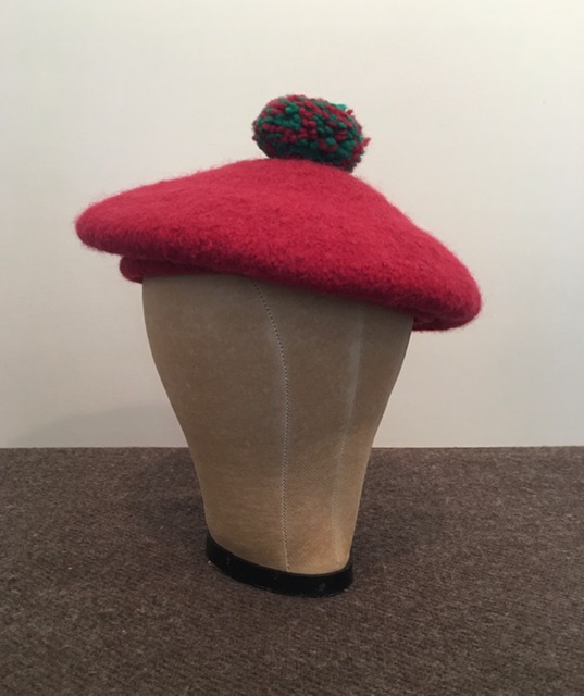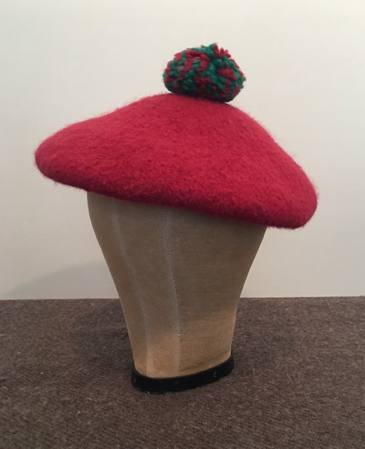 For sale is this Scots Bonnet hand knitted and fulled by Gloria Holmes. It is in excellent condition having been work to only a couple of events and never “in weather”. I have wetted it and draped it onto a wig head to give it a bit of “drape”. The color is in a Madder or Brick Red which is hard to capture in the photos. It’s not a vibrant shade. It was made to fit a 7 5/8″ hat size and it fits me snugly and with the drawstring in the band can be made to fit somewhat smaller.