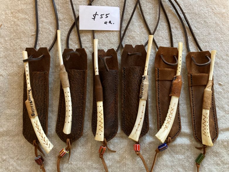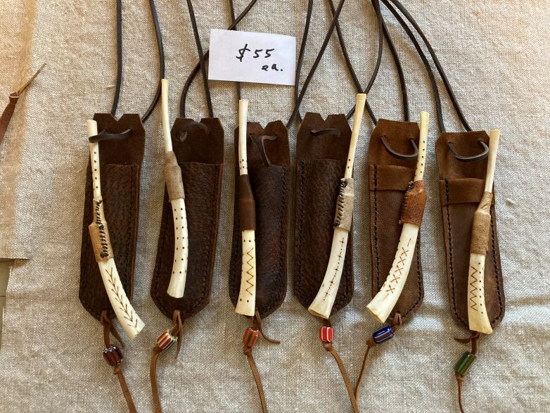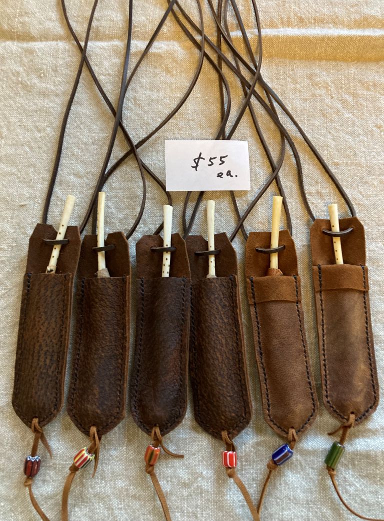 Six turkey wing bone calls with sheaths. Made by myself. Each call has been hand assembled and decorated with poker etched designs. Comes with a hand sewn neck sheath.