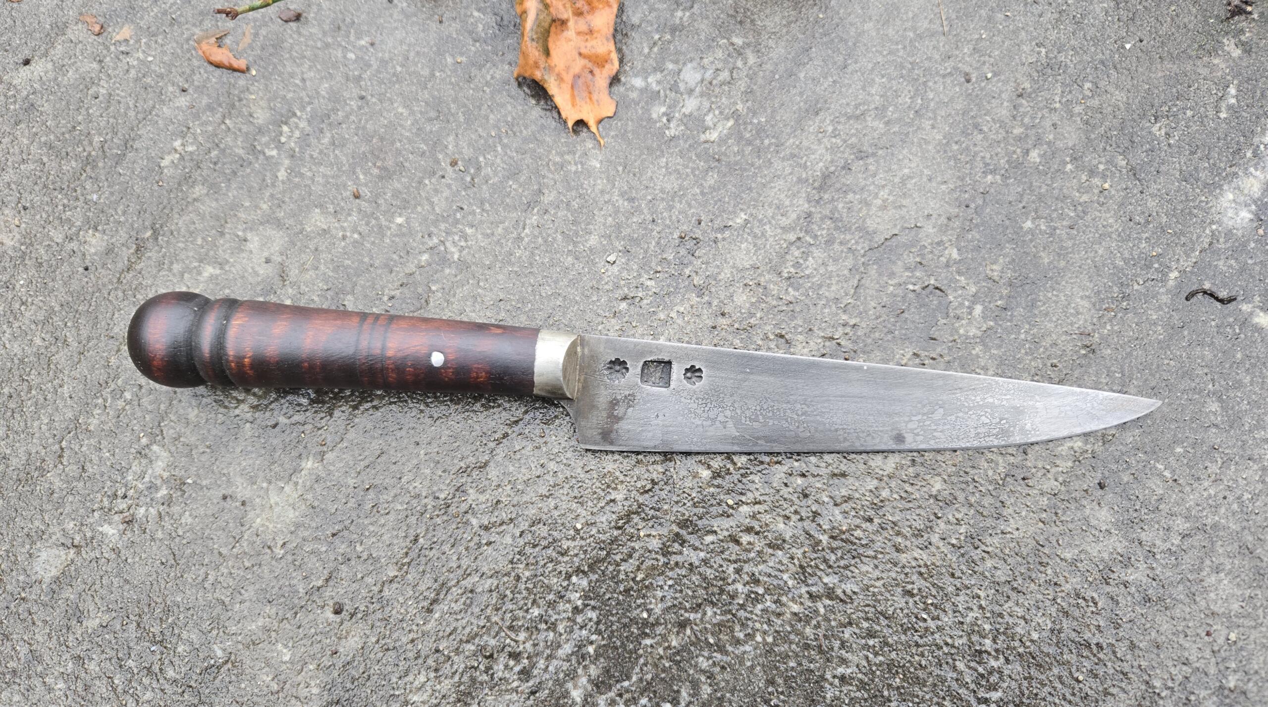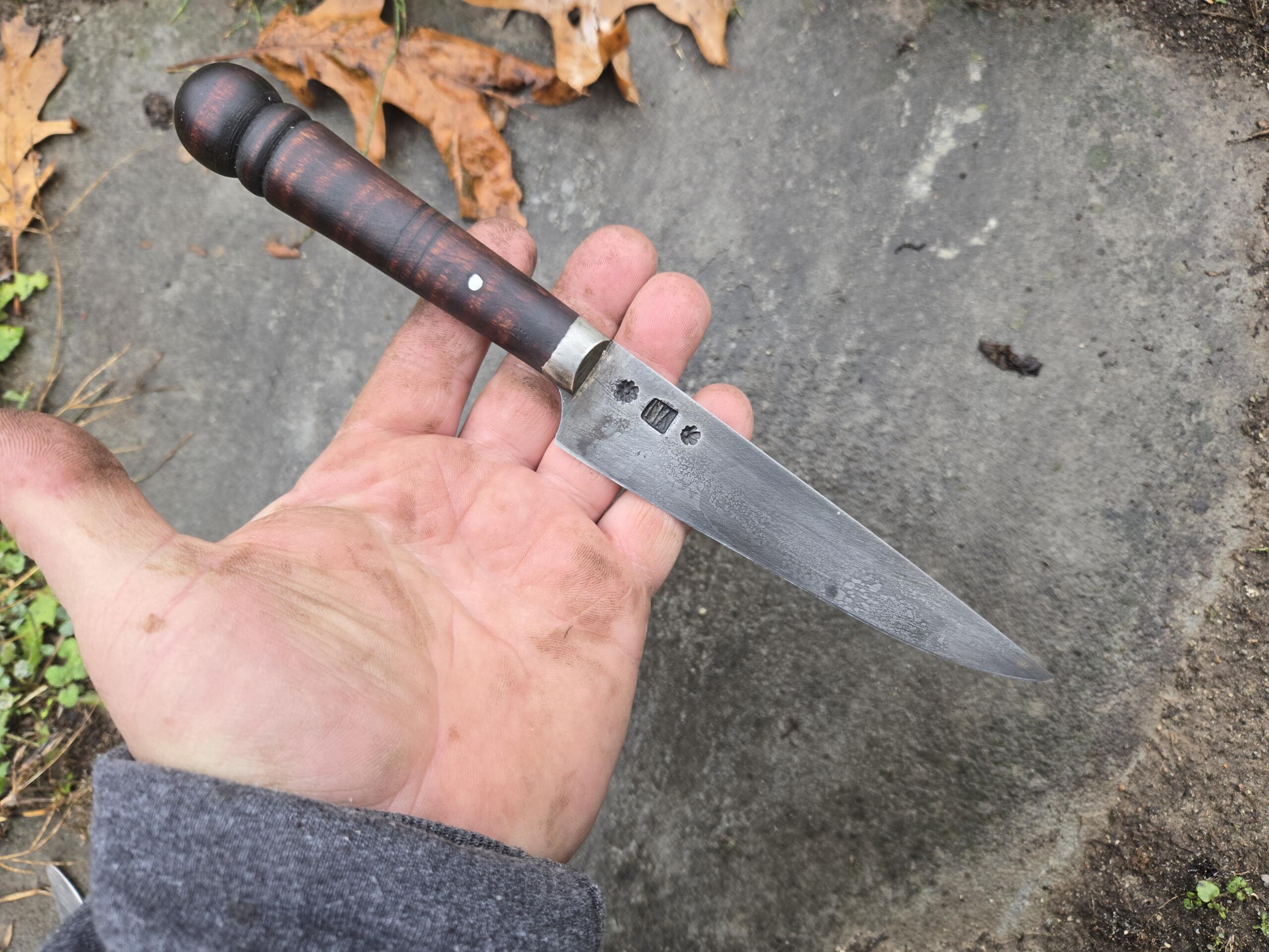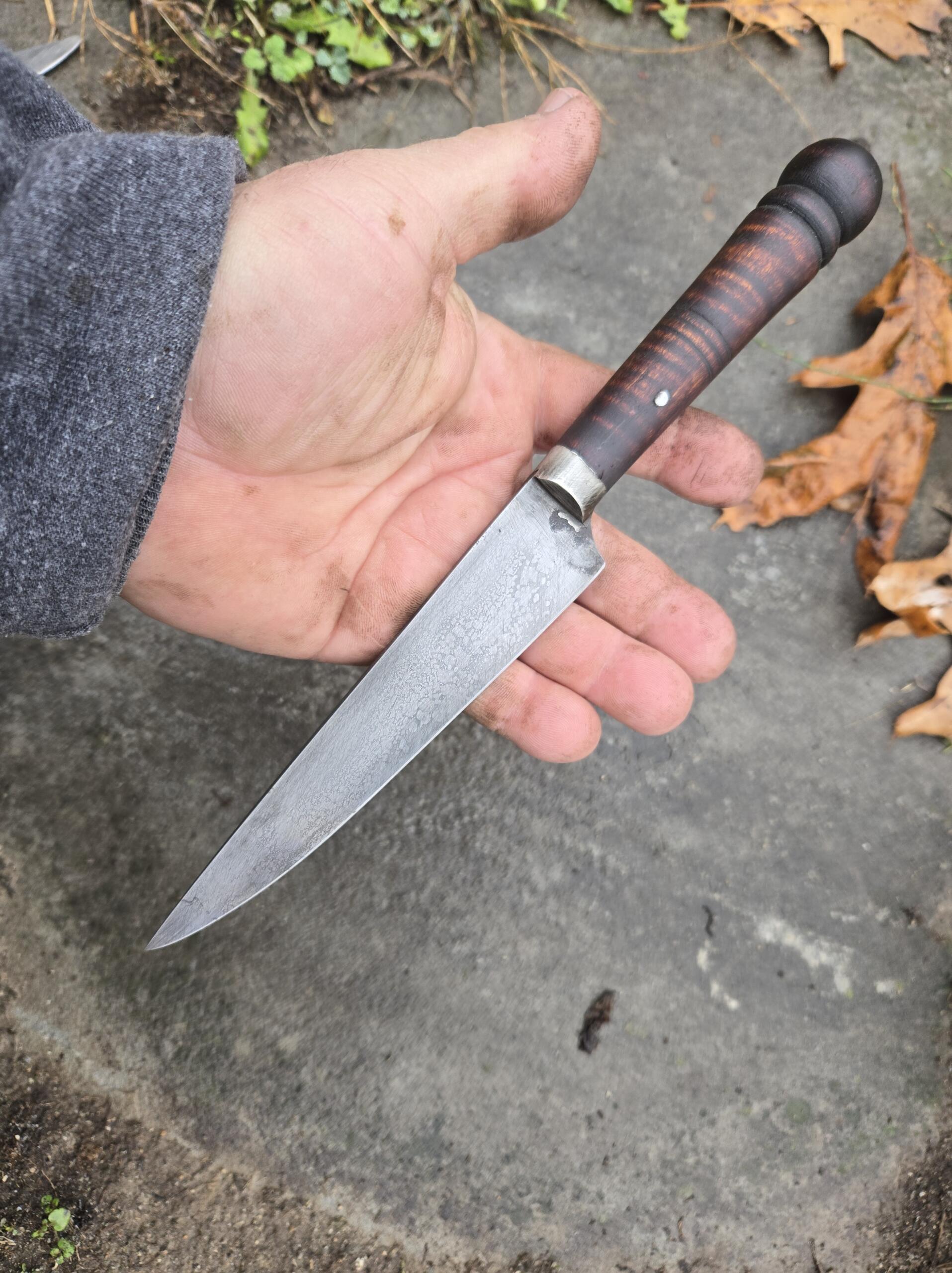 Hand forged knife by Nathan Allen. Blade forged from antique tool steel properly tempered to hold a keen edge. Turned curly maple handle with pewter bolster. Overall length 9 7/8″, blade length 5 7/8″, width 1 1/8″. Price includes shipping.