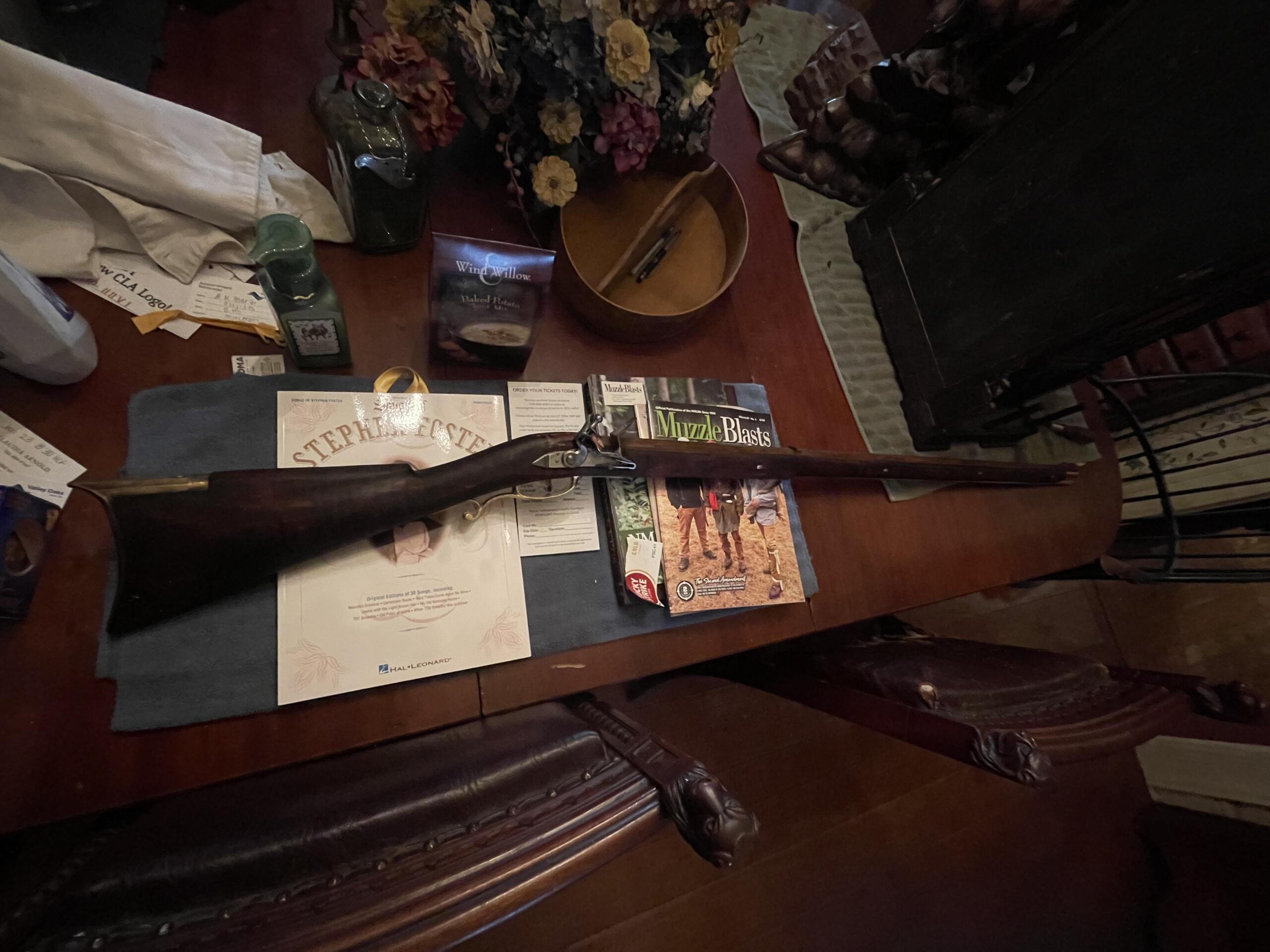40 caliber flintlock, trigger pull is 14 and a 1/4 inches, the gun ways 9 pounds, it is a plain gun. My contact is 765-426-1323, or my email is aaronkoehlermarsh@gmail.com. Thanks for looking.