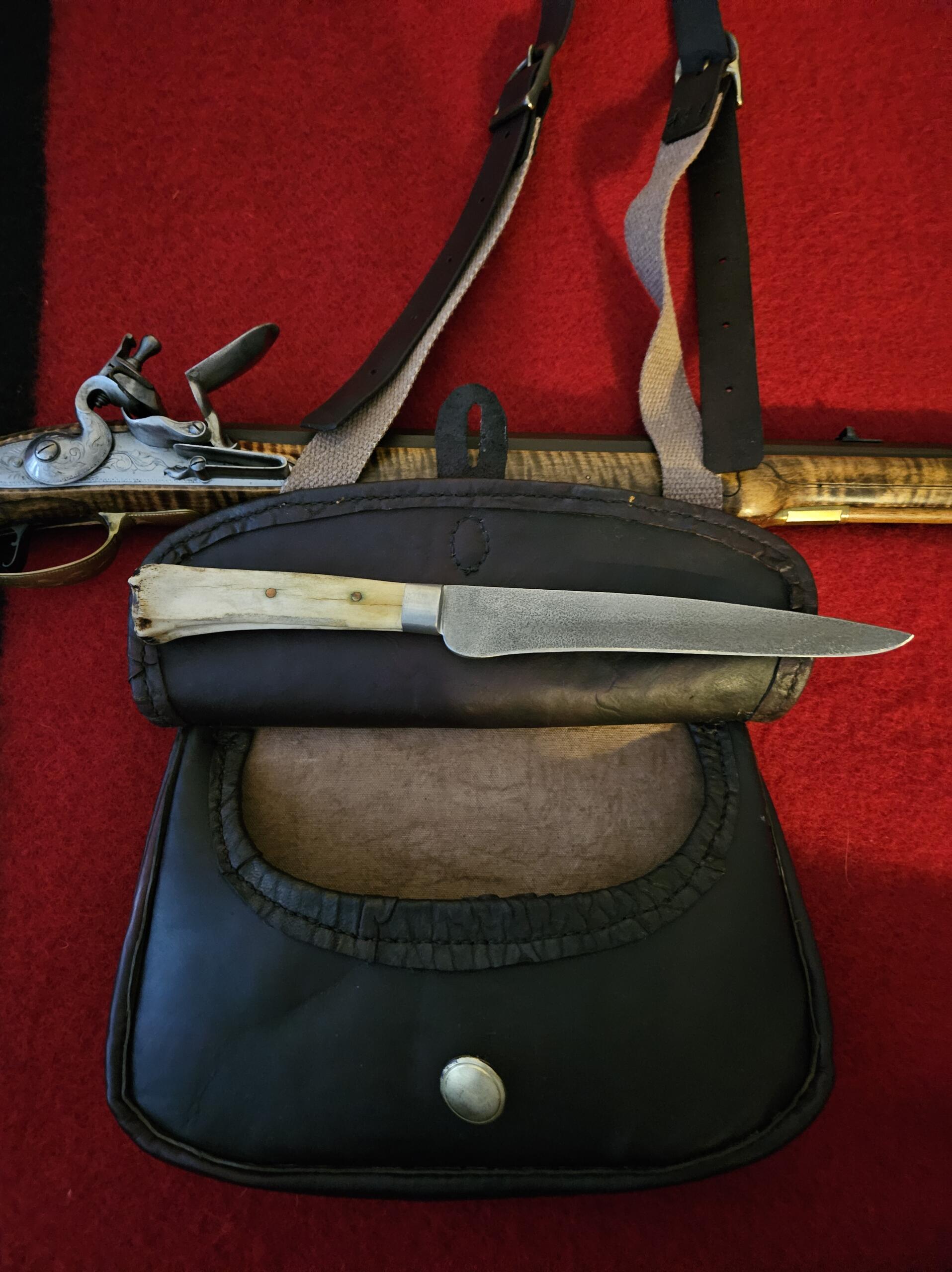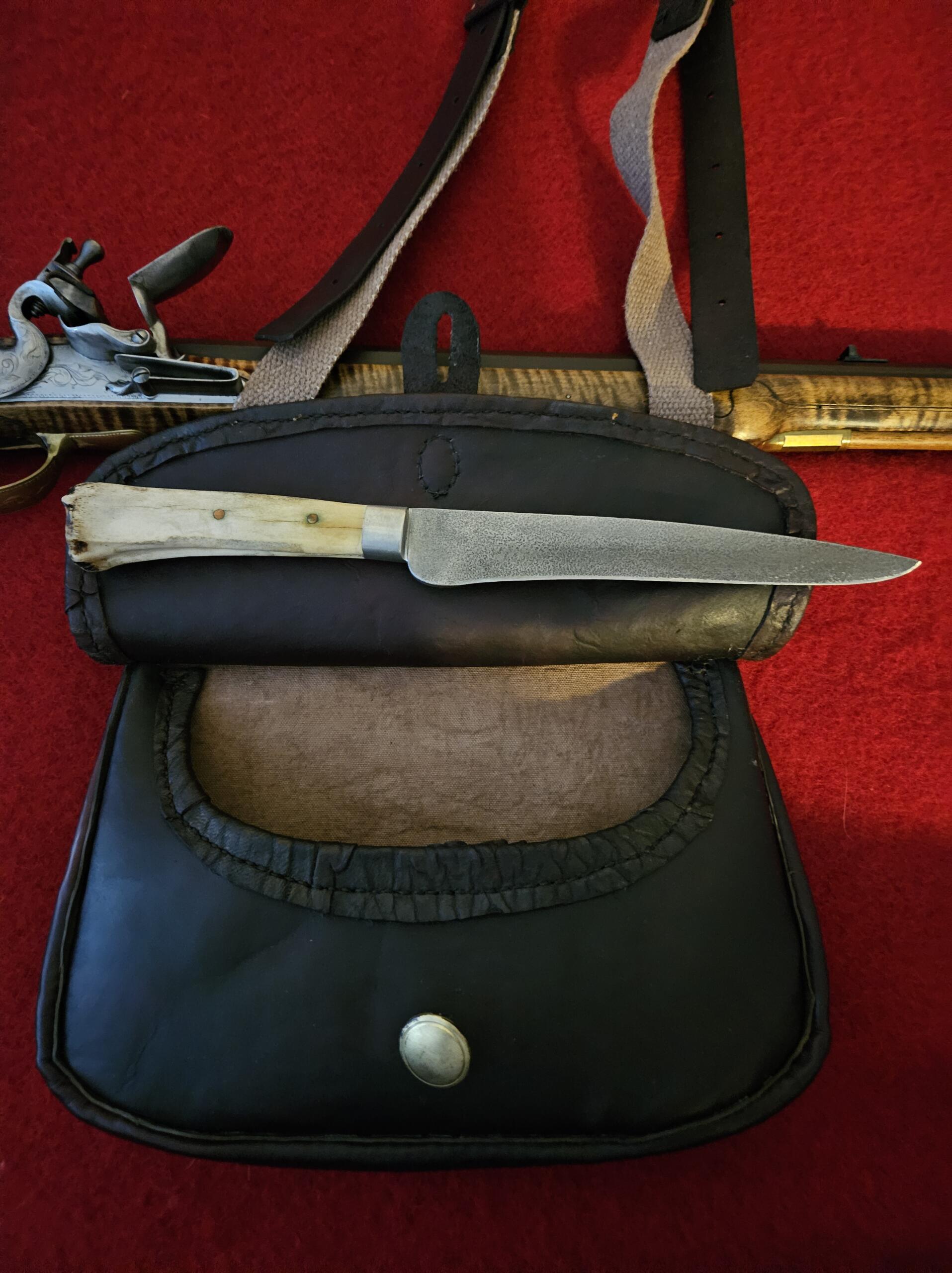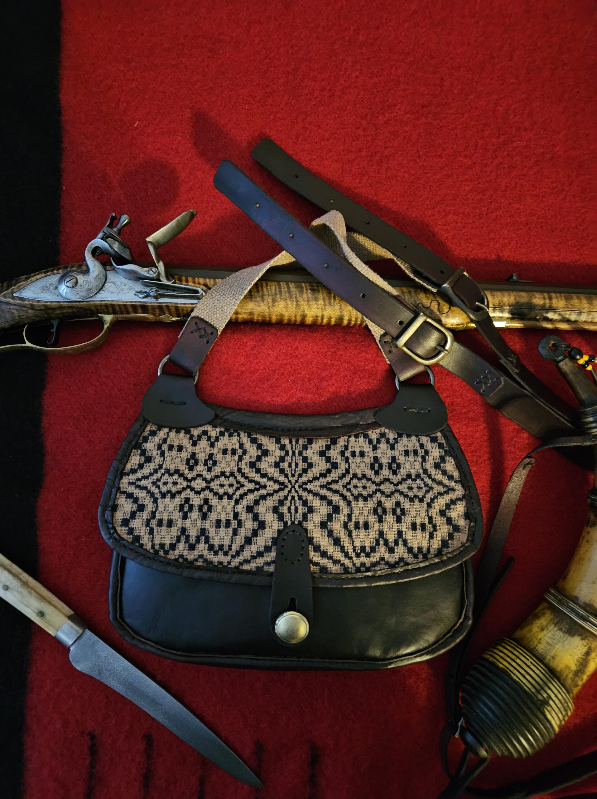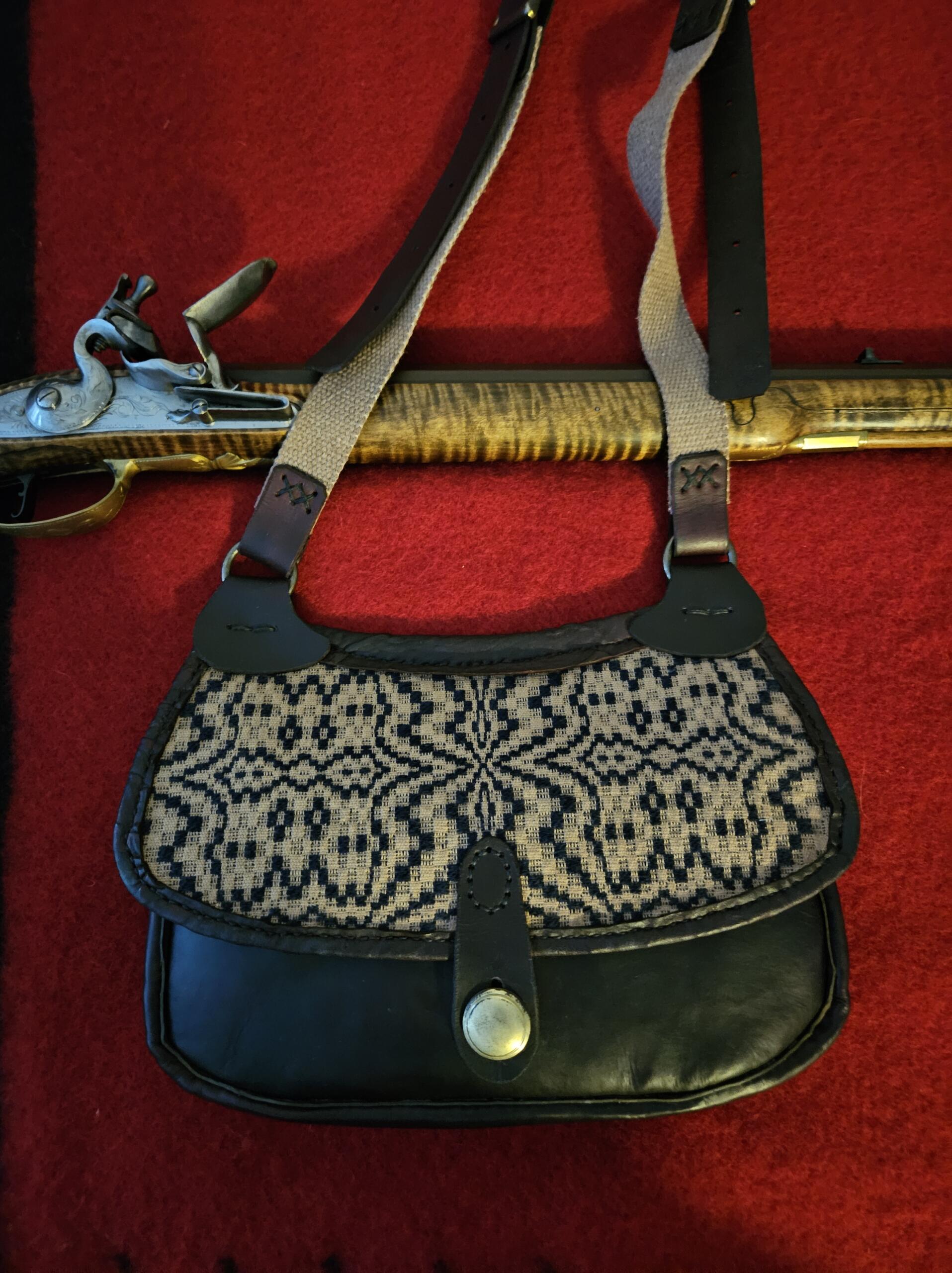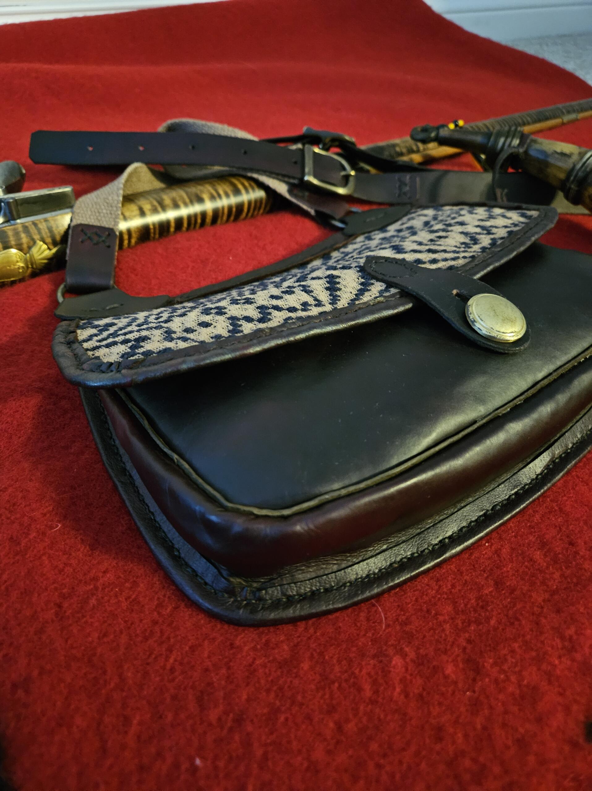 Here is a nice vegetable tanned calfskin shotbag with a leather backed coverlet, stained flap. It measures 11 1/2″ wide X 8 1/4″ deep measured from center to center. I have stained it a deep, rich mahogany color. It has a full gusset and is lined with a stained canvas material and is completely hand stitched with brown linen thread. I have added a leather flange between all seams for durability. The strap has double solid brass buckles for even adjustability on the shoulder and i have added a solid brass button closure.