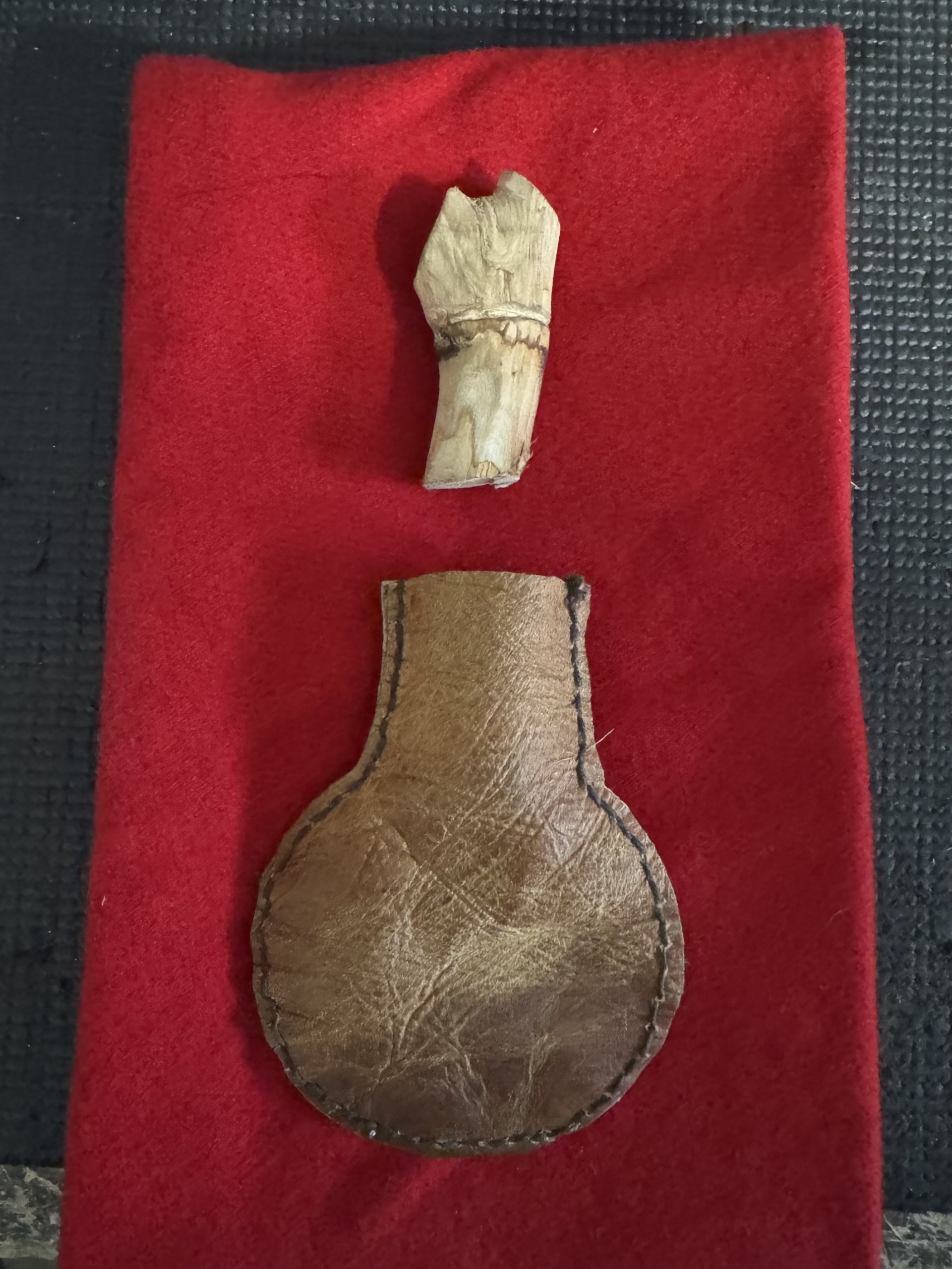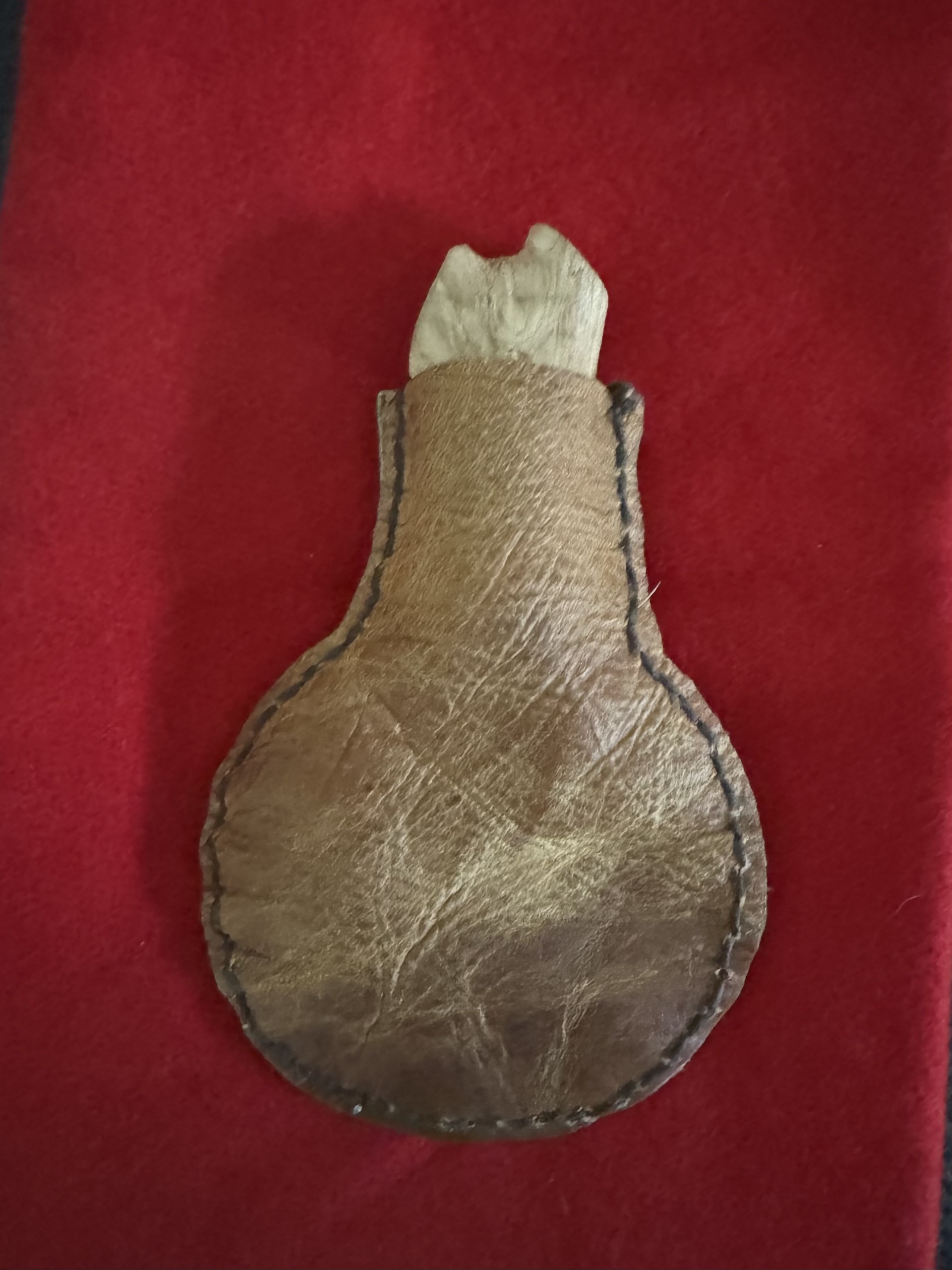 Bark tan deer, linen cord, Apple stopper. Up to .70 Caliber