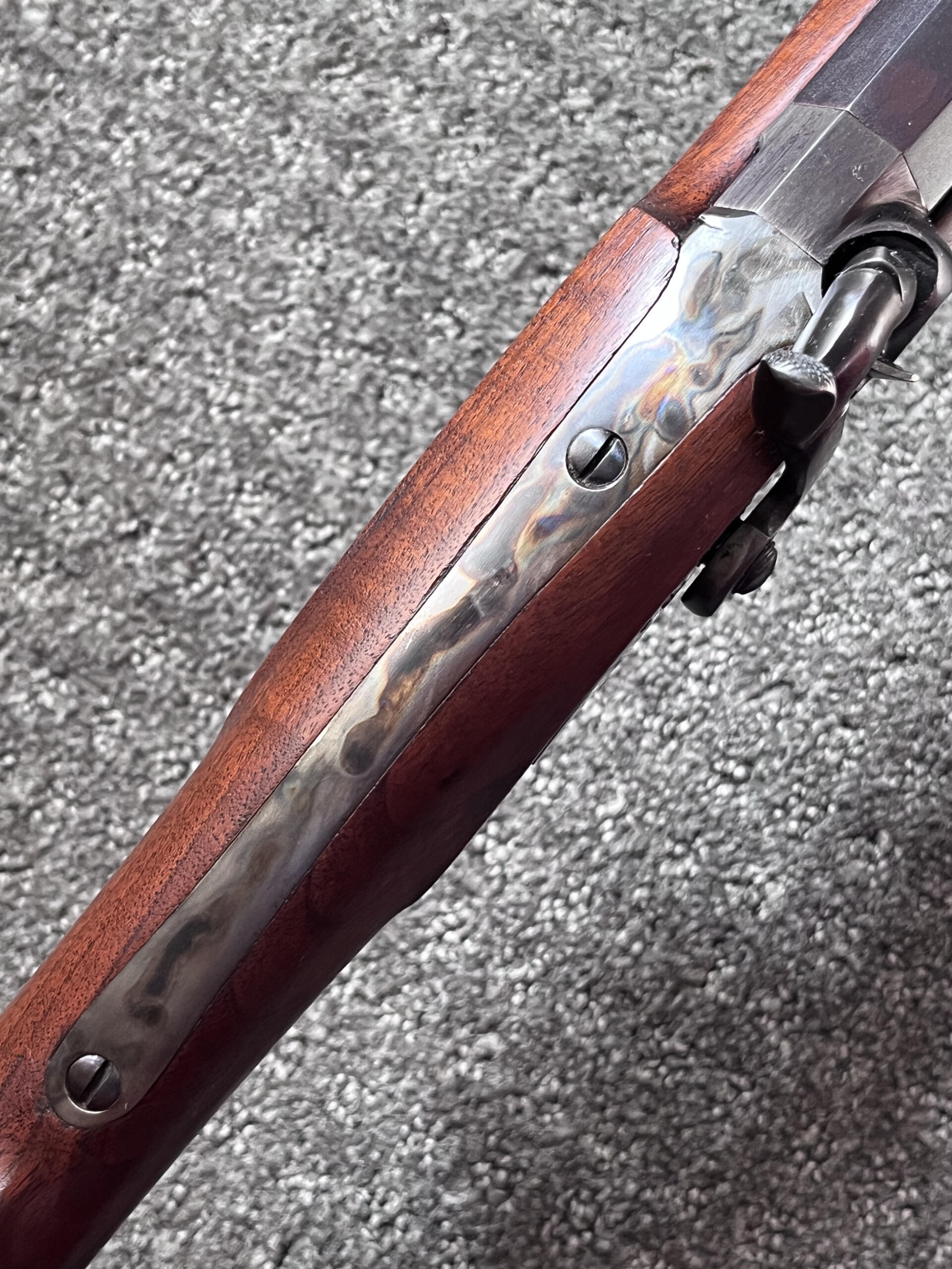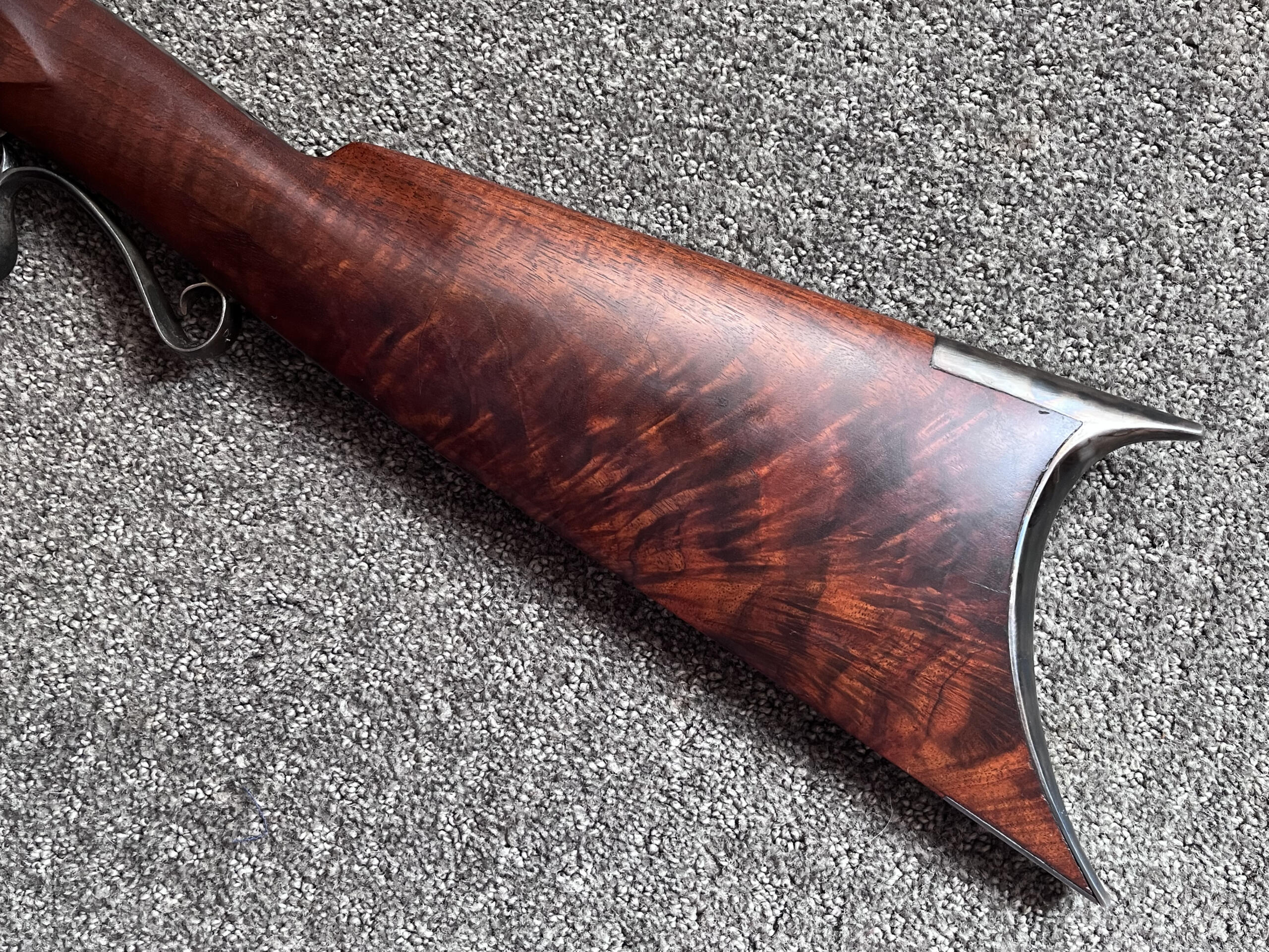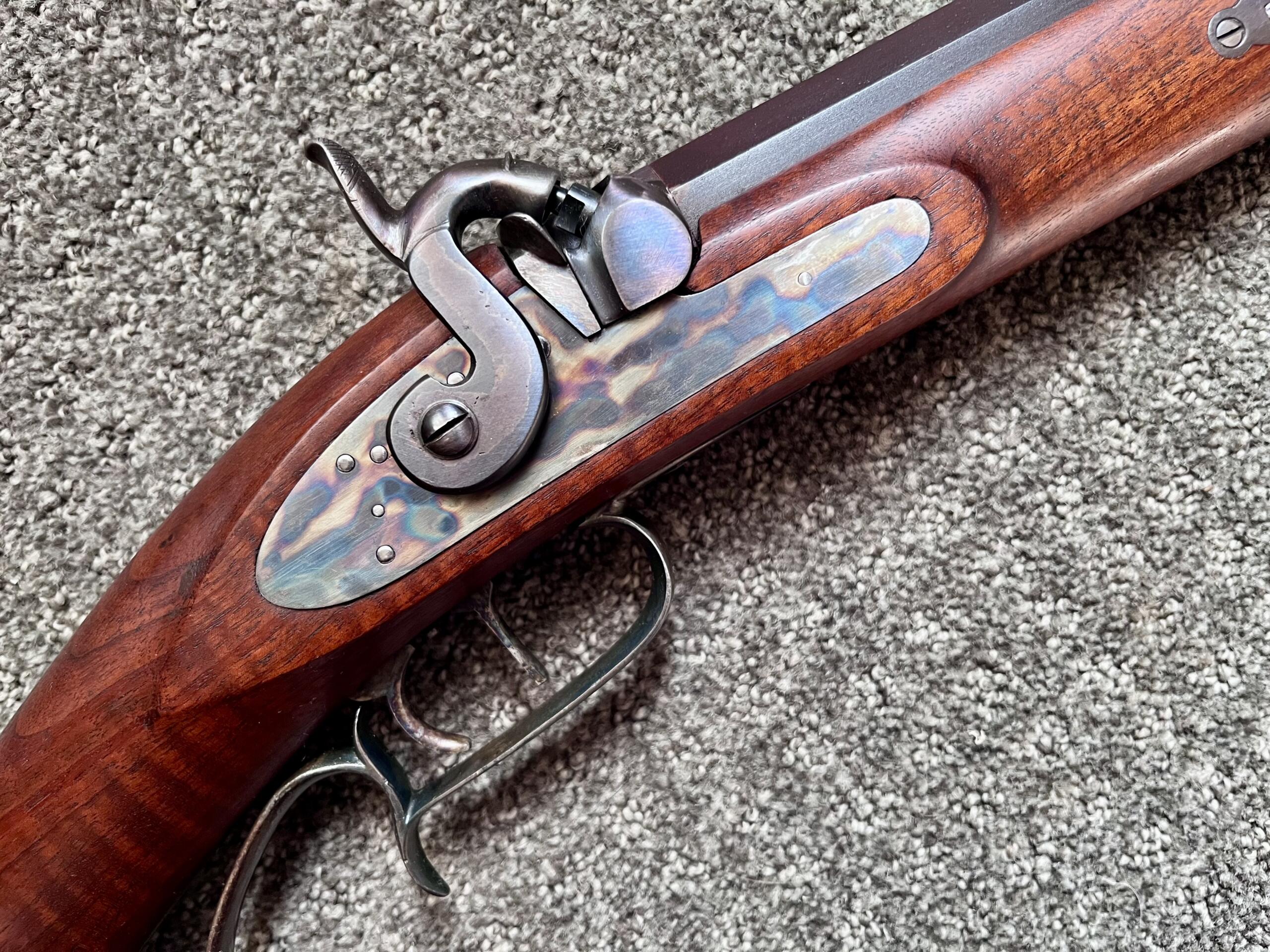All metal components—including the lock plate, butt plate, triggers, and trigger guard—are beautifully case-colored. The half-stock displays striking figuring from the wrist to the poured pewter fore-end cap. The rifle has no cheek piece, keeping the lines clean and balanced. The wood-to-metal fit is flawless, and the wood has only the most minor of handling marks. It’s clear this rifle has seen very little use.