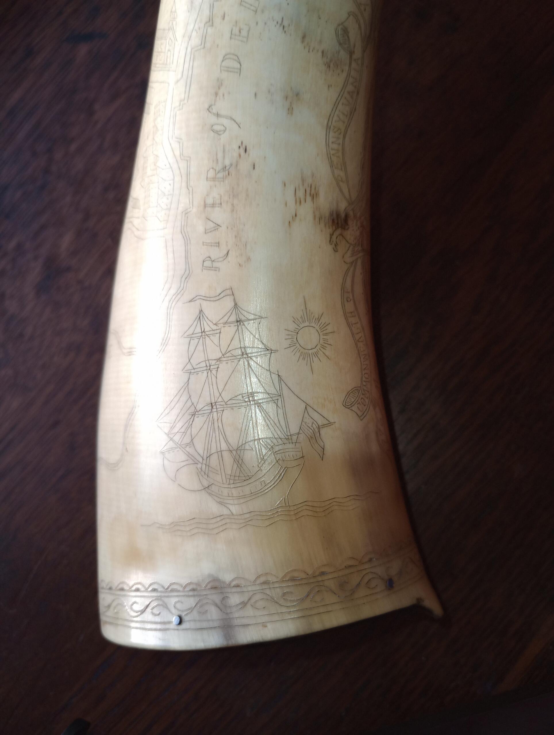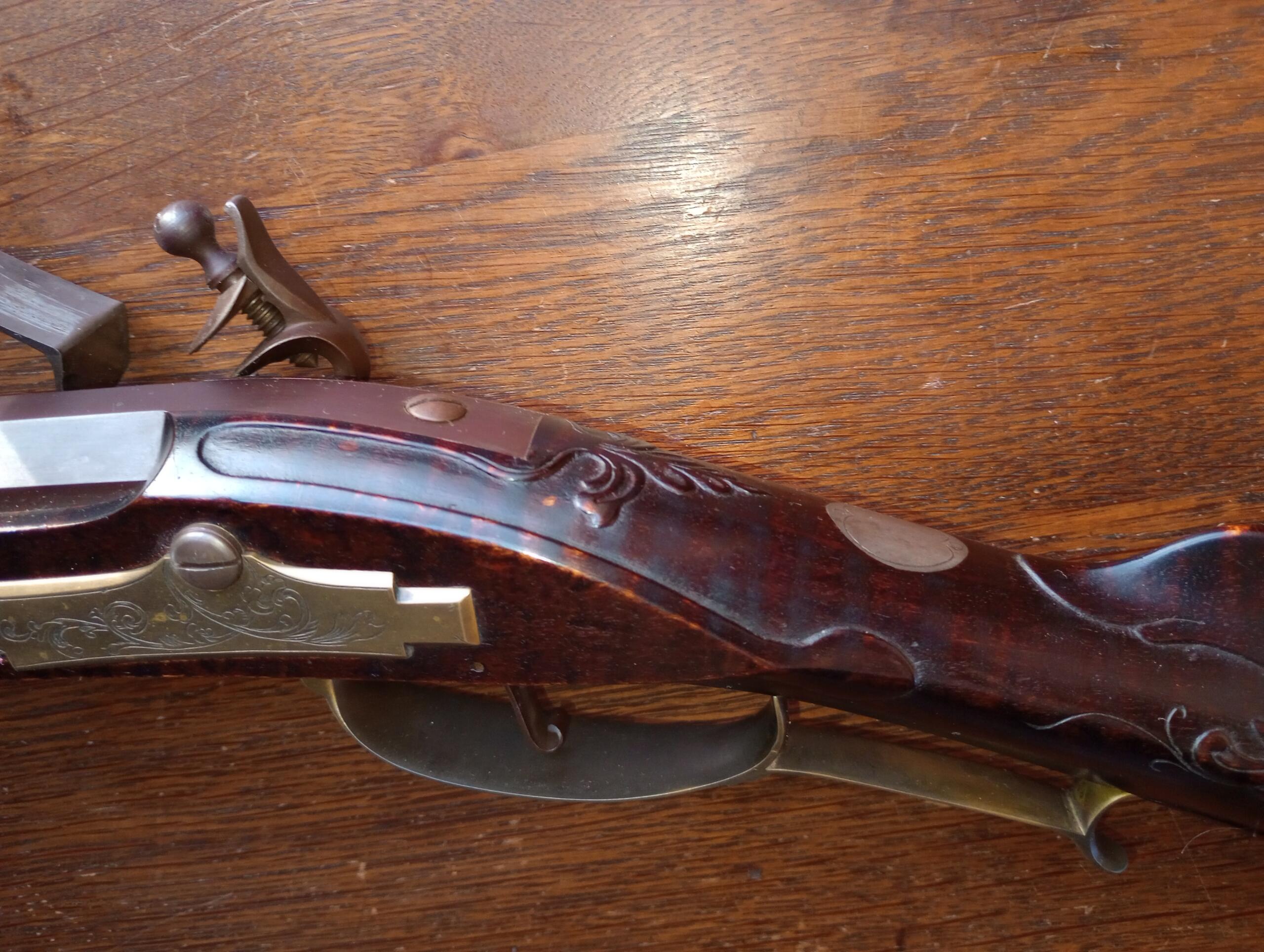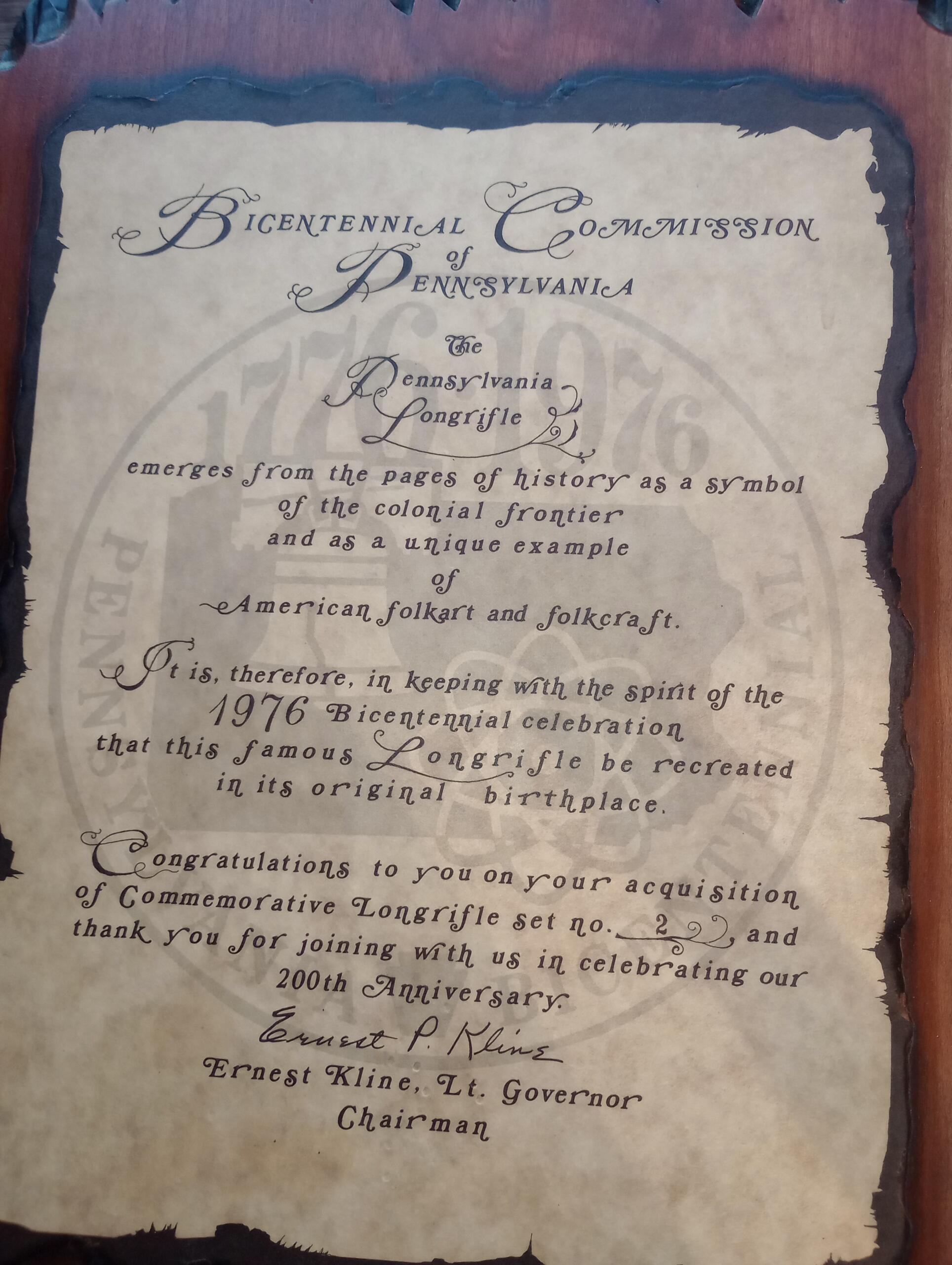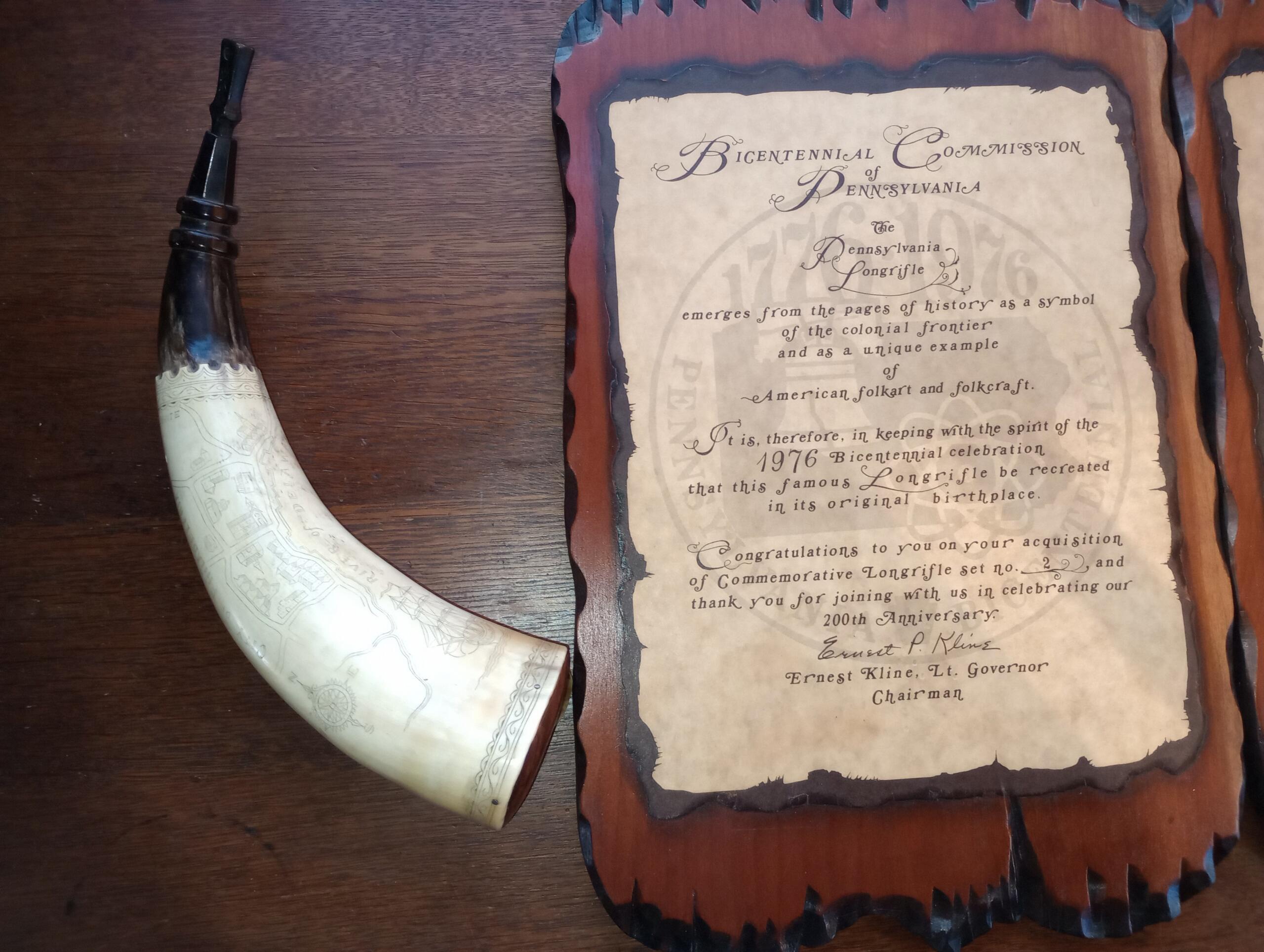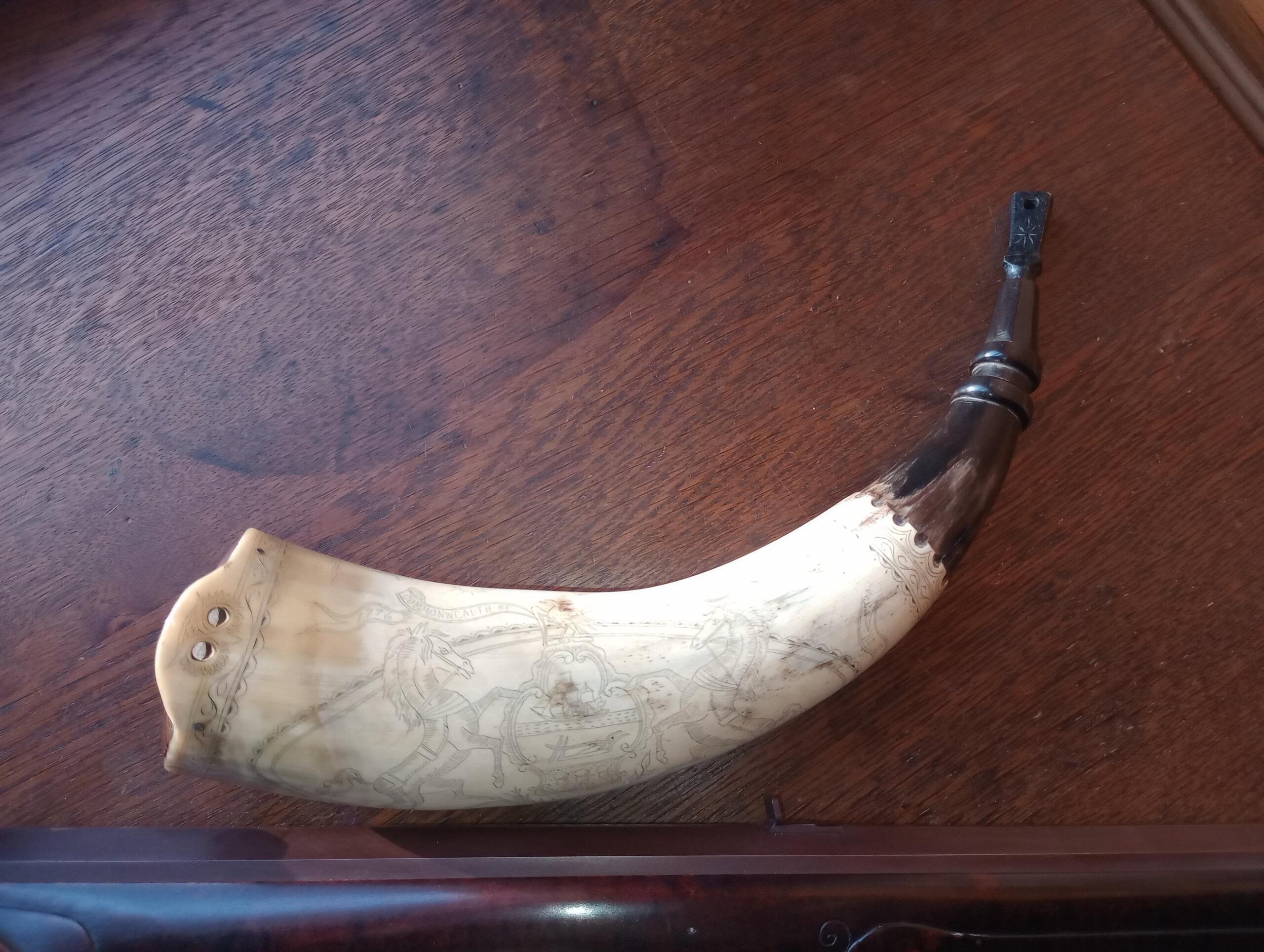 I’m offering a nice Jack Haugh Bicentennial Rifle, #2 in excellent condition. These pictures are mostly the plaque and powder horn that go with it. The rifle is pictured in the previous post. It has a 44″ barrel, Chamber’s lock and a beautiful piece of curly maple. All mounts are brass, beautifully finished and engraved. Weight is 9 lbs. and 14 oz. There are two plaques and a powder horn by Tom White also in excellent condition that will be included. Could do some outdoor pictures when the weather is better if needed. $7800 plus shipping. Email me at clram@bnin.net if interested.