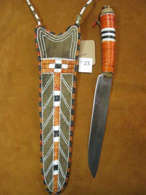 A beautifully Quilled Shawn Webster sheath and knife. 10 ½ inches overall length with knife in sheath, not counting tassels. This is Quillwork #23. Be sure to mention the number in any communication.